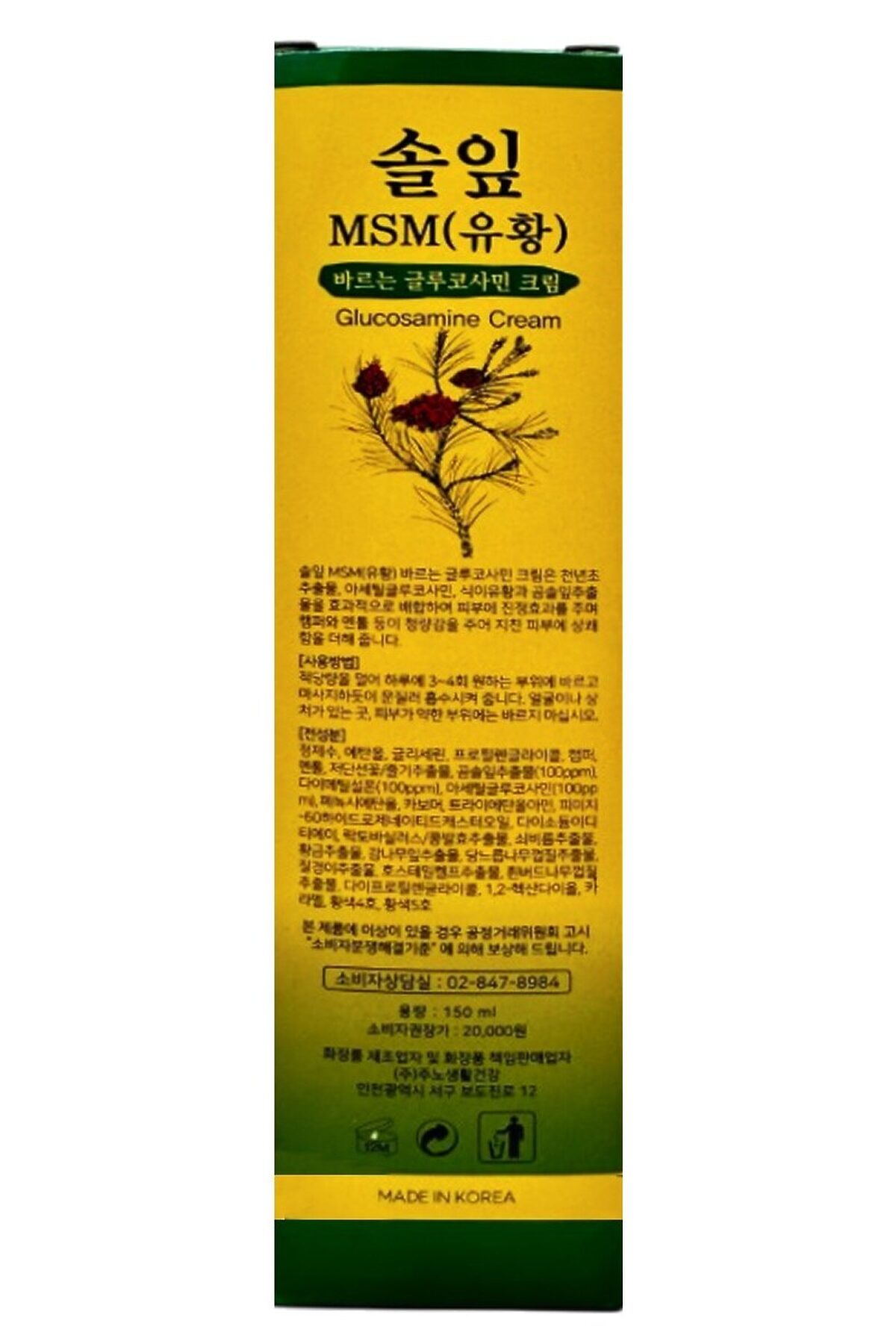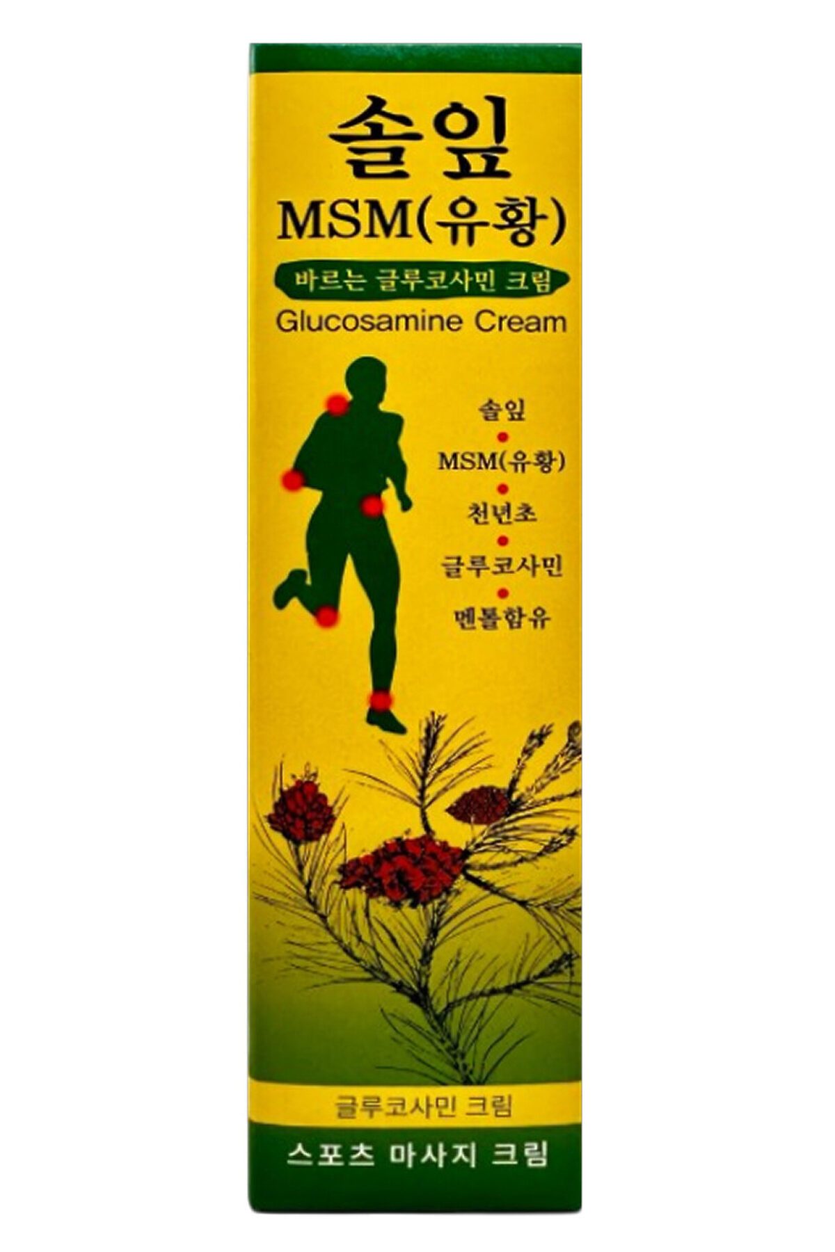 MSM спортивный массажный крем с глюкозамином — эффективное корейское средство для расслабления мышц и восстановления после физических нагрузок. Формула с МСМ (органической серой), экстрактом хвои чёрной сосны и растительными экстрактами помогает уменьшить ощущение напряжения, усталости и дискомфорта в теле. Действие и преимущества способствует расслаблению мышц после нагрузок поддерживает здоровье суставов и связок уменьшает ощущение усталости и скованности дарит охлаждающий эффект подходит для спортивного и восстановительного массажа быстро впитывается, не оставляет липкой плёнки Активные компоненты MSM (Dimethyl Sulfone) — источник органической серы, поддержка суставов и мышц Глюкозамин (Acetyl Glucosamine) — способствует подвижности суставов Экстракт хвои чёрной сосны — тонизирует и успокаивает кожу Экстракт женьшеня — придаёт коже жизненную силу Камфора и ментол — охлаждение, ощущение свежести и комфорта Комплекс растительных экстрактов — уход и защита кожи Кому подойдёт спортсменам и людям с активным образом жизни после тренировок и физической работы при напряжении мышц спины, ног, плеч, шеи для регулярного спортивного массажа Способ применения Наносите необходимое количество крема на проблемный участок кожи 3–4 раза в день, массирующими движениями до полного впитывания. Не наносить на лицо, повреждённую или чувствительную кожу. Характеристики Тип продукта: спортивный массажный крем Назначение: для мышц и суставов Эффект: расслабляющий, охлаждающий Состав (INCI) Water, Alcohol, Glycerin, Propylene Glycol, Camphor, Menthol, Opuntia Humifusa Flower/Stem Extract, Pinus Thunbergii Leaf Extract (100 ppm), Dimethyl Sulfone (100 ppm), Acetyl Glucosamine (100 ppm), Phenoxyethanol, Carbomer, Triethanolamine, PEG-60 Hydrogenated Castor Oil, Disodium EDTA, Lactobacillus/Soybean Ferment Extract, Portulaca Oleracea Extract, Scutellaria Baicalensis Root Extract, Diospyros Kaki Leaf Extract, Ulmus Campestris (Elm) Bark Extract, Plantago Asiatica Extract, Laminaria Digitata Extract, Salix Alba (Willow) Bark Extract, Dipropylene Glycol, 1,2-Hexanediol, Caramel, Tartrazine (CI 19140), Sunset Yellow FCF (CI 15985).