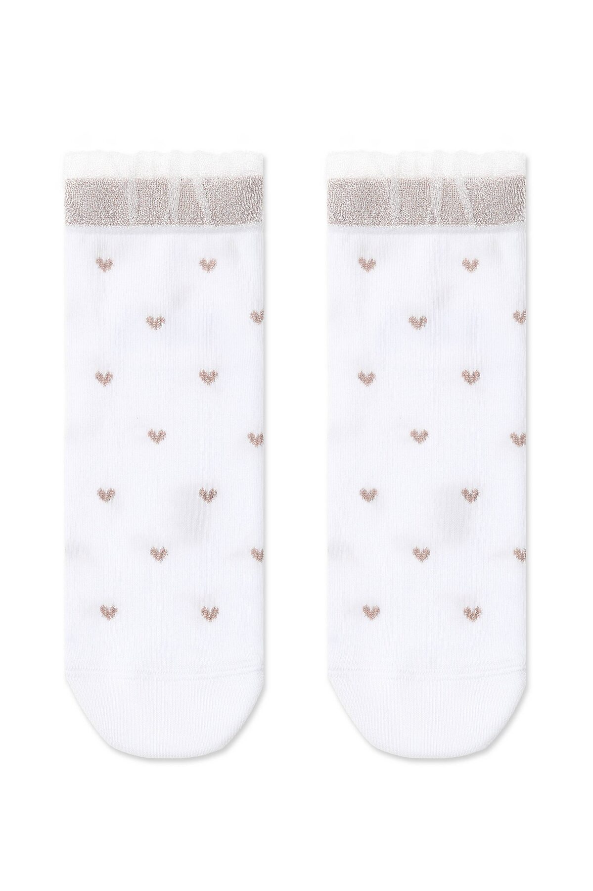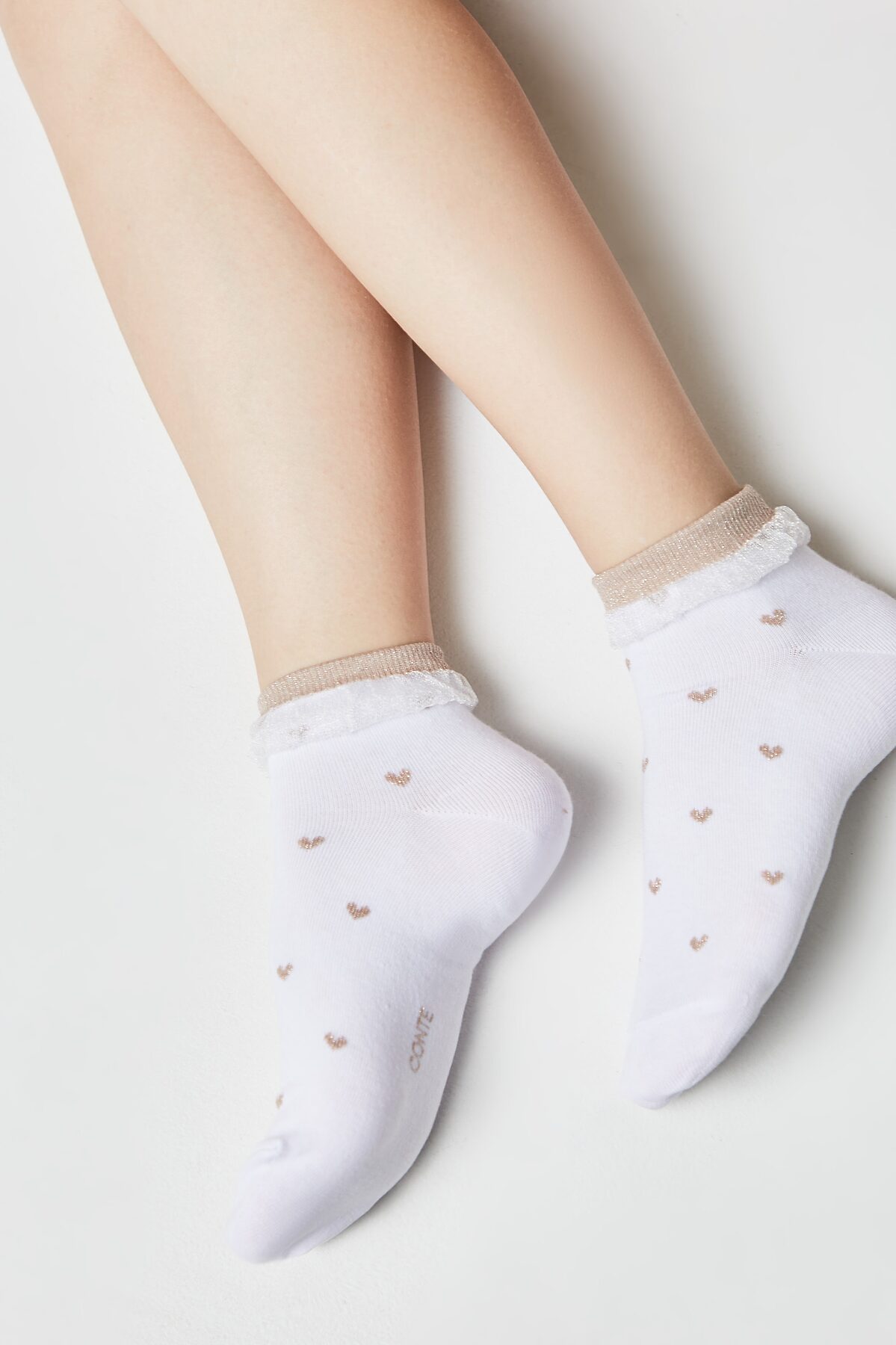Хлопковые носки с воздушным бортом и сердечками из нитей люрекса созданы, чтобы расставлять оригинальные акценты в повседневном и спортивном образе.