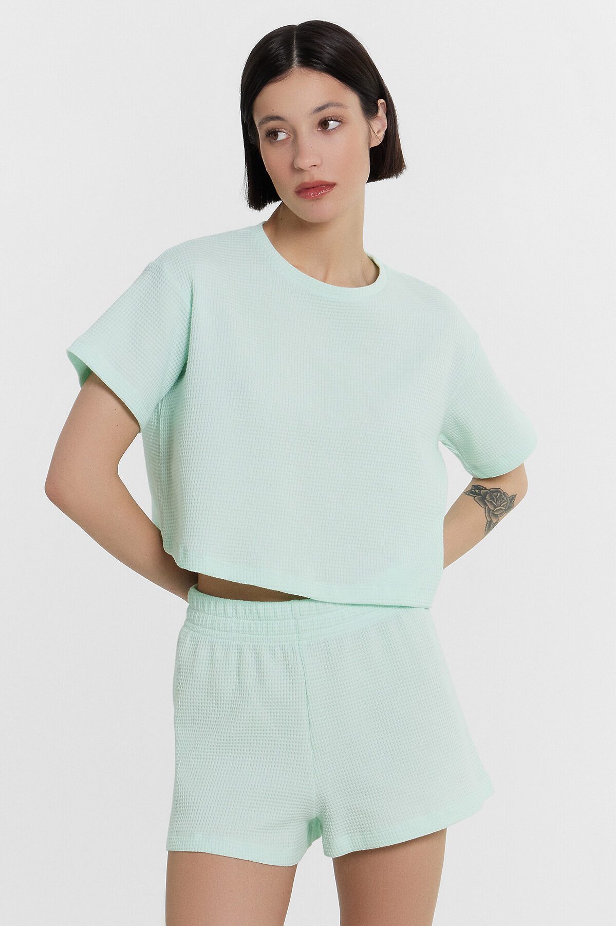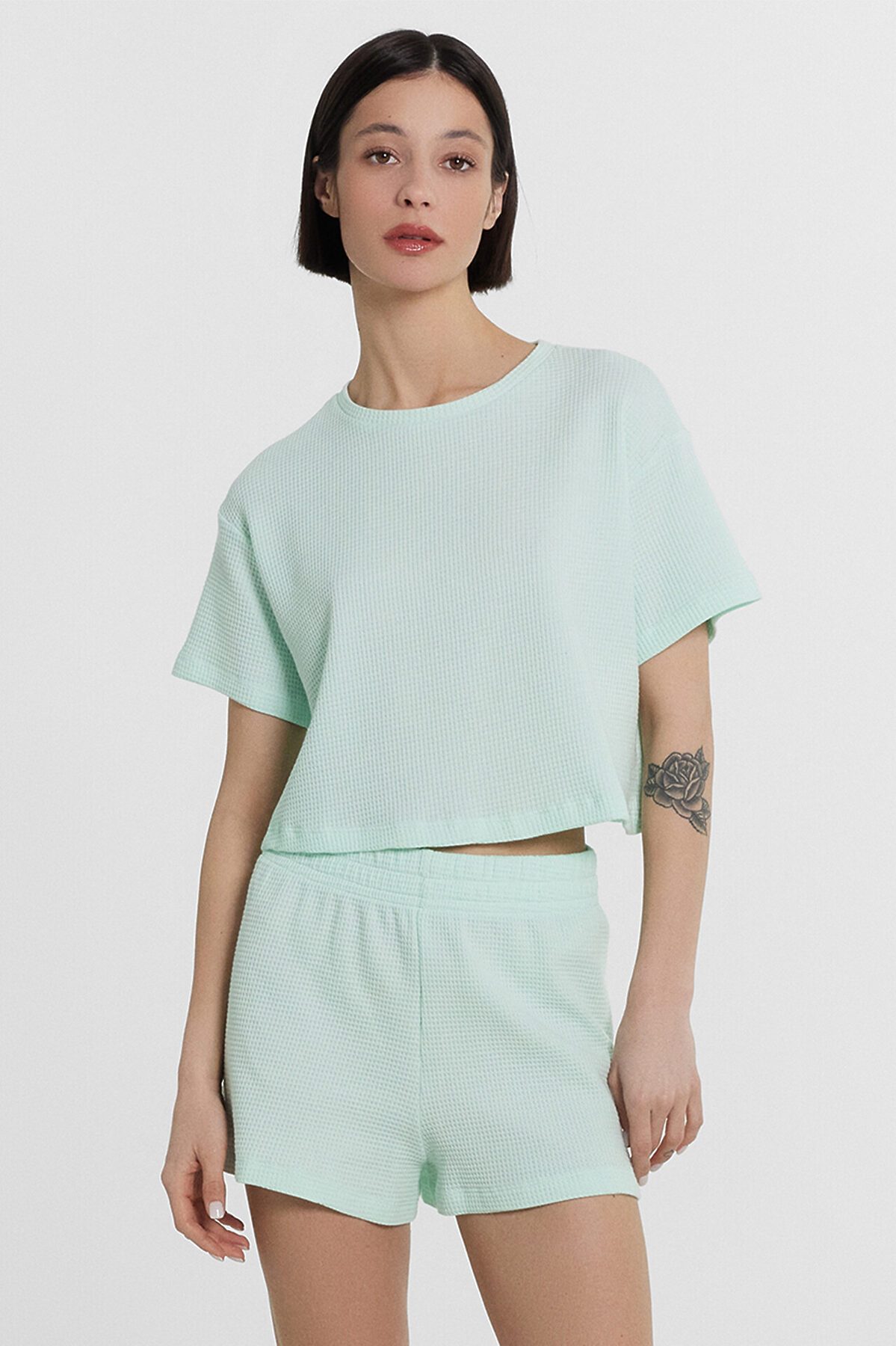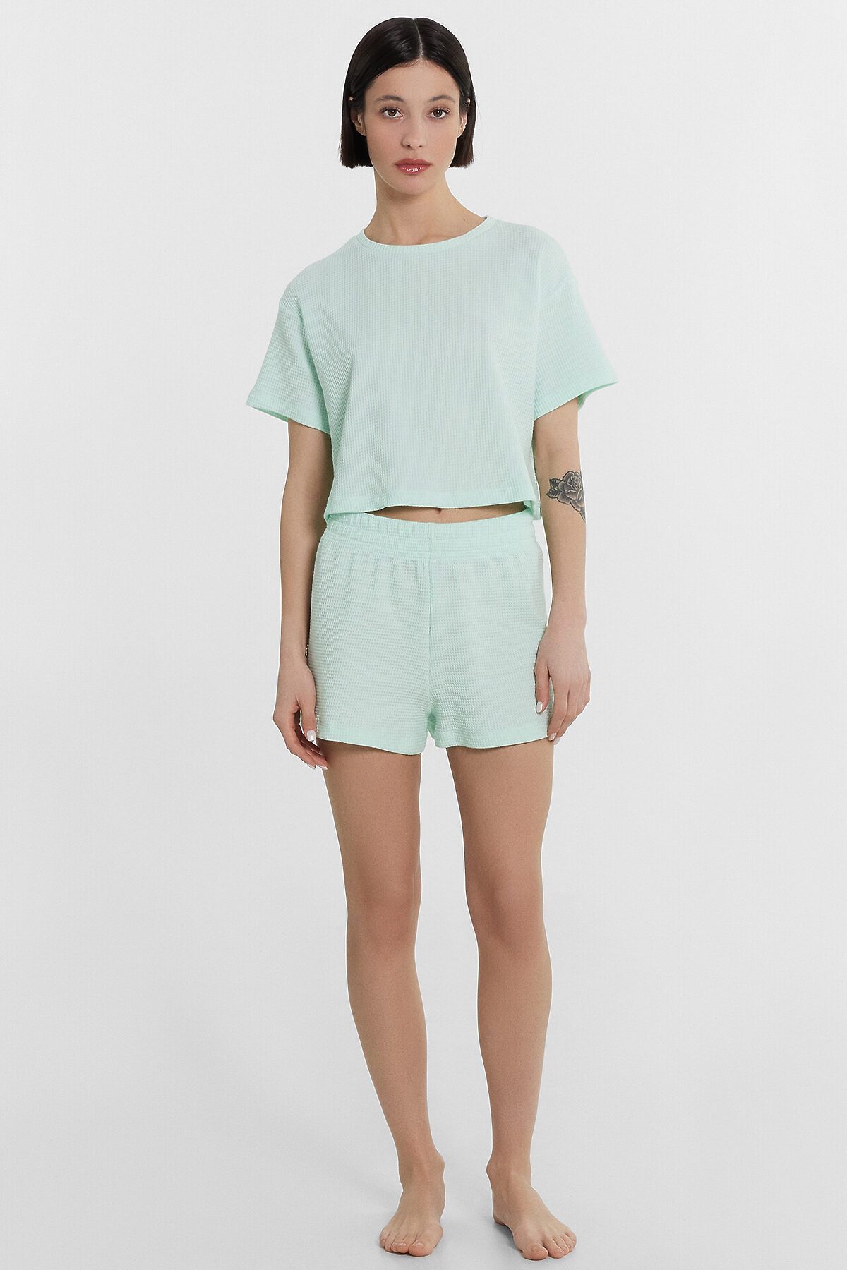 Эта легкая женская пижама от Mark Formelle состоит из футболки и шорт, выполненных из хлопкового материала с вафельной фактурой, что делает её идеальной для сна, отдыха и домашних дел. Футболка свободного силуэта, укороченная, с круглым вырезом, обеспечивает свободу движений и комфорт. Шорты длины мини с эластичной тесьмой в поясе, гарантируют удобную посадку и лёгкость движений. Этот комплект сочетает в себе стиль, удобство и функциональность, делая его отличным выбором для вашего домашнего гардероба.