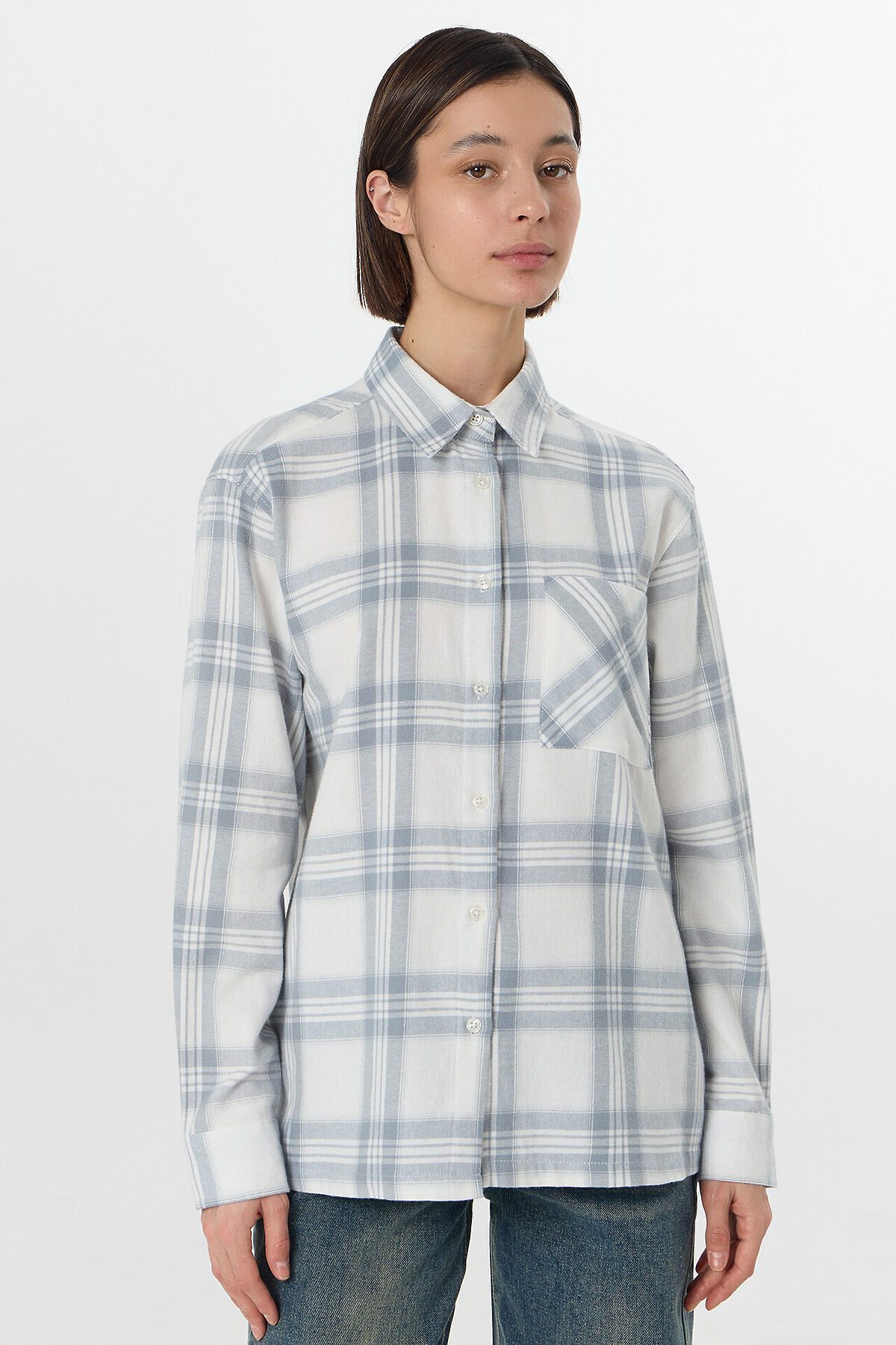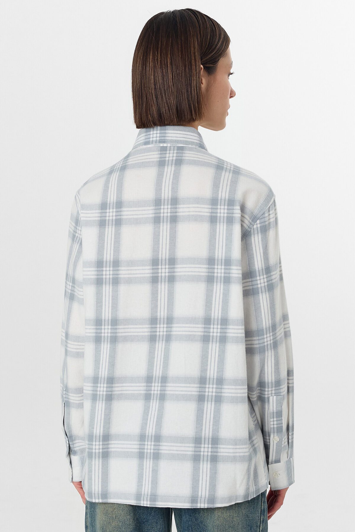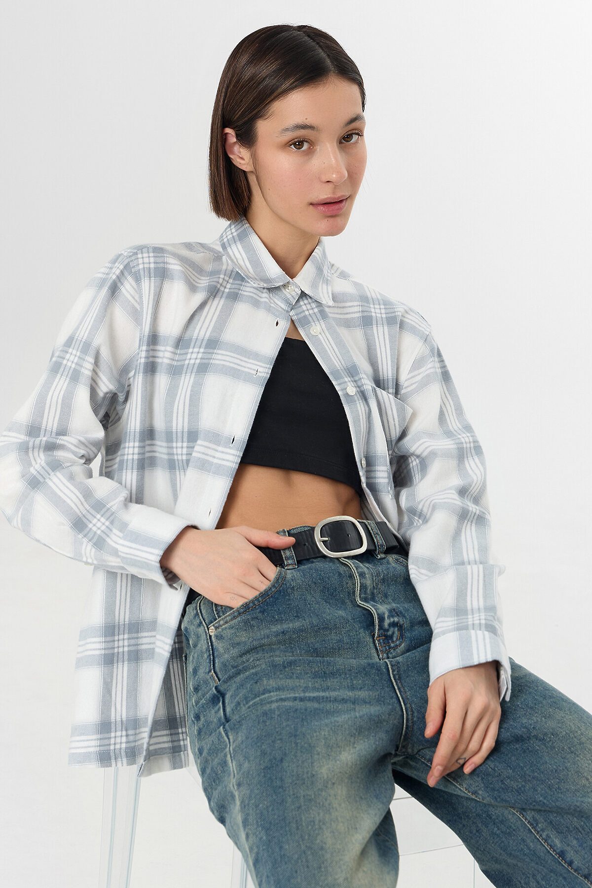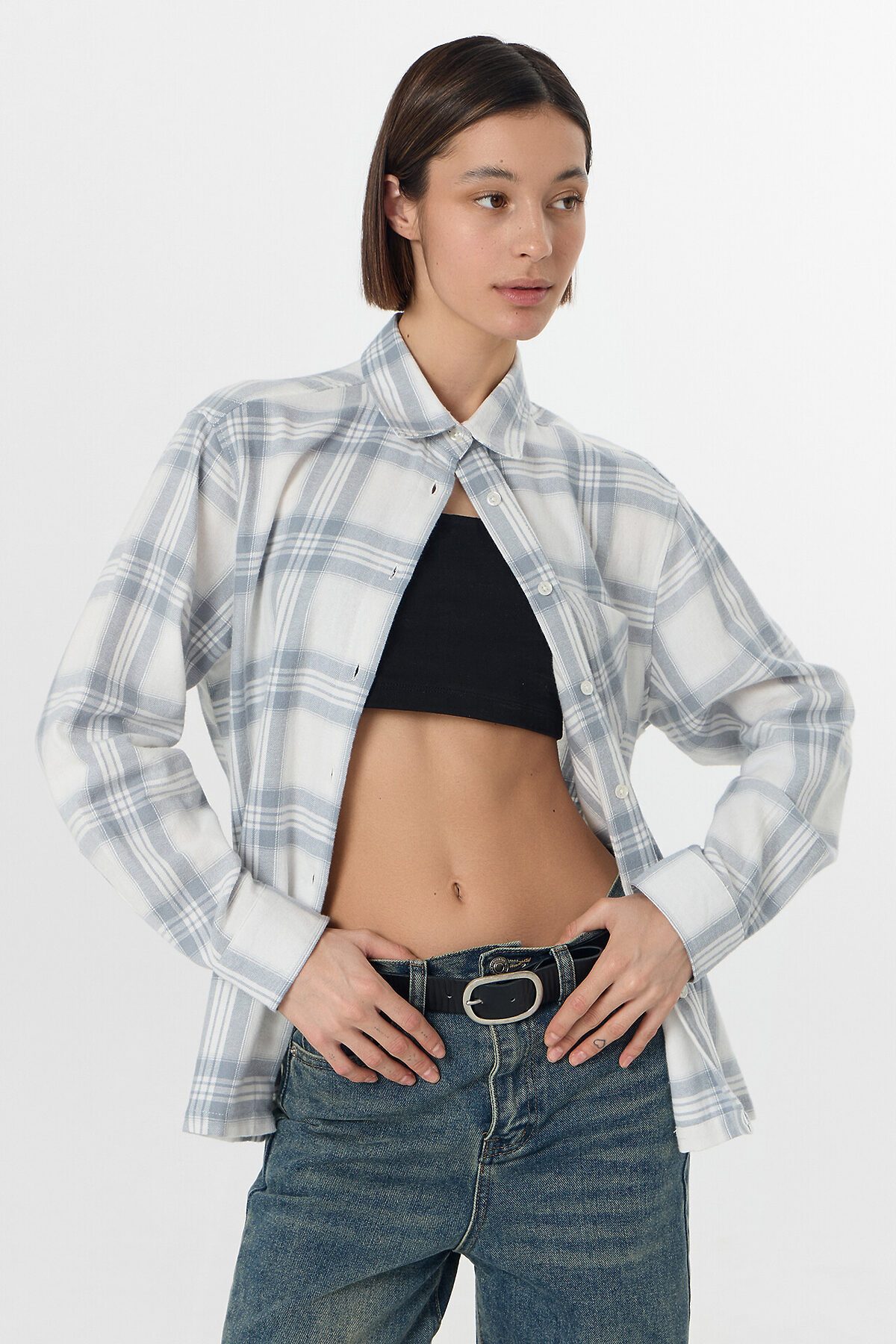 Эта модель легко сочетается с джинсами, брюками современных фасонов и юбками, позволяя создавать стильные комбинации. Графичная клетка делает рубашку самостоятельным акцентом в луке, который органично дополнит как расслабленные, так и собранные образы.