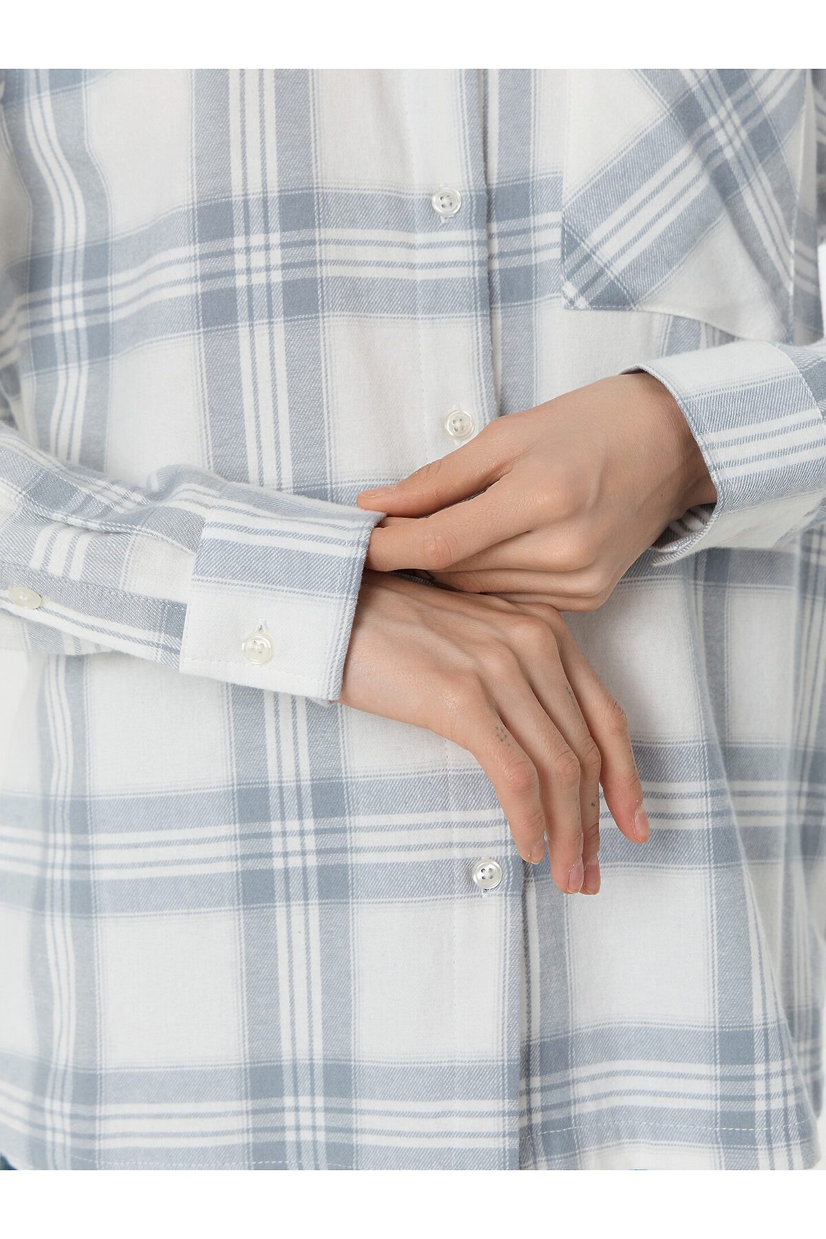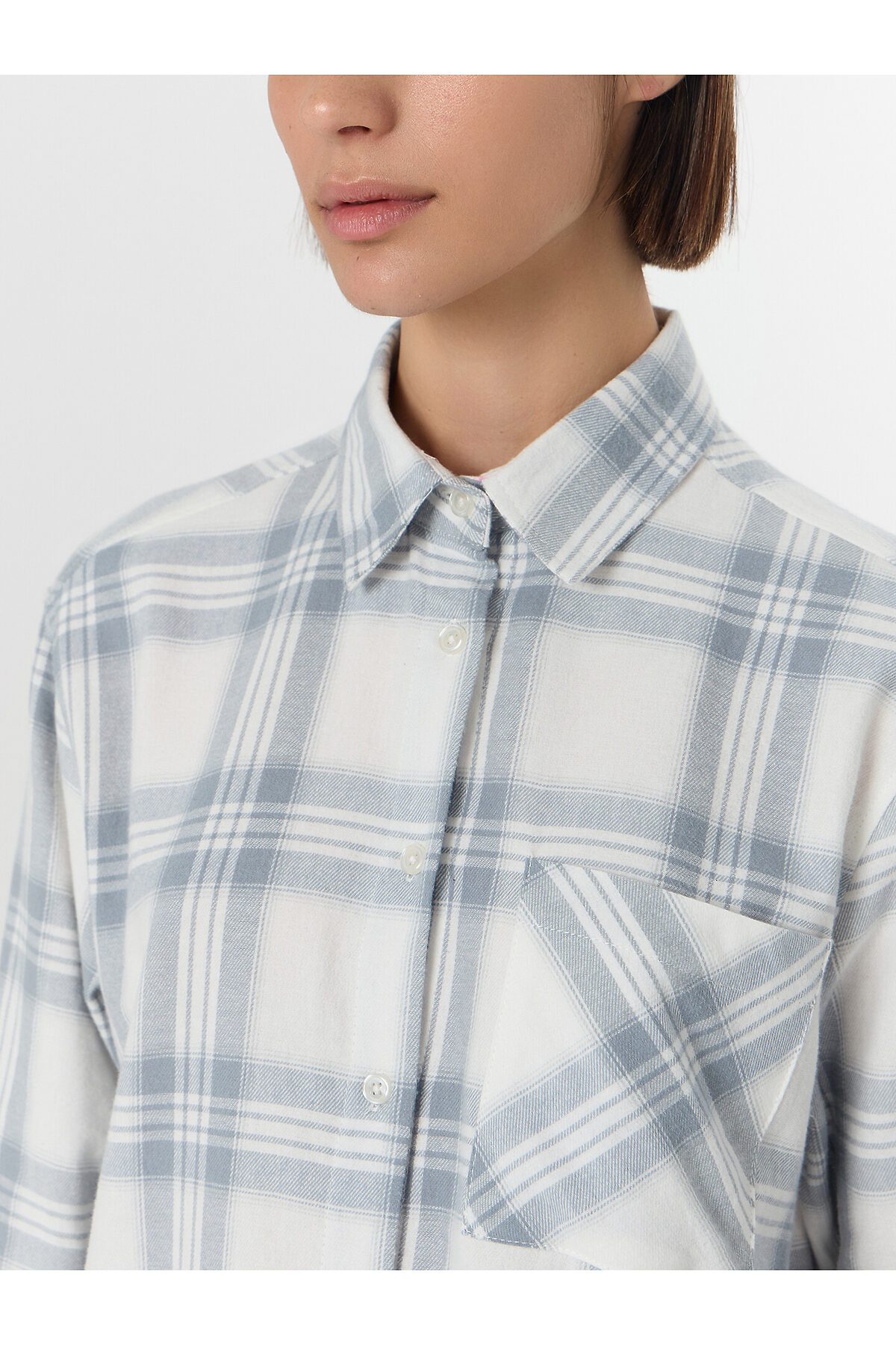 Женская рубашка из хлопка в клетку — современный базовый элемент гардероба, где классическая форма встречается с актуальным дизайном. Модель прямого силуэта с отложным воротником и длинными рукавами на манжетах создает выразительный образ. Нагрудный карман и застежка на пуговицы по всей длине и на манжетах подчеркивают продуманность деталей.