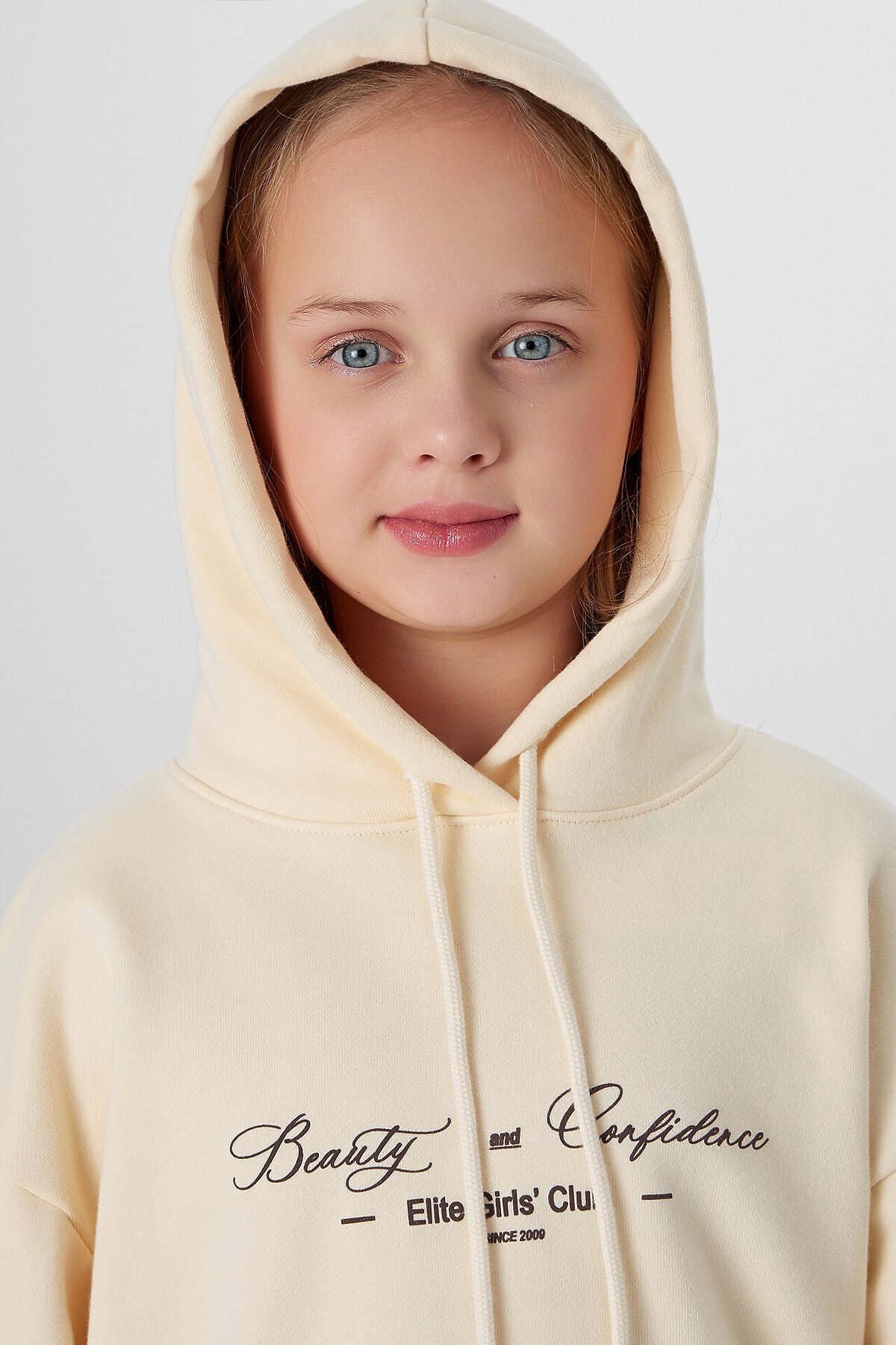 Худи для девочек, свободного силуэта (оверсайз), с капюшоном. Горловина округлой формы. Капюшон со средним швом, на подкладке из основного полотна, в капюшоне пробиты петли и втянут шнур, круглый с наконечником (арт. 8NMKXWC-1). Плечо спущено, рукав втачной длинный. По низу рукава отрезная манжета из рибаны. Пояс отрезной из рибаны, отстрочен.
