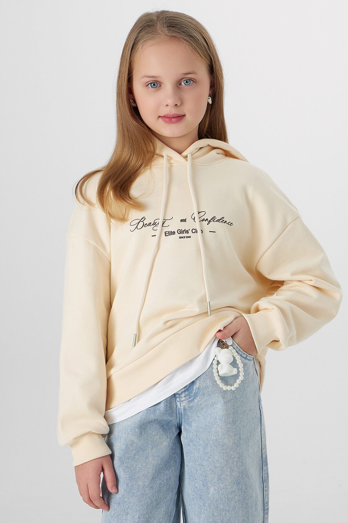 Худи для девочек, свободного силуэта (оверсайз), с капюшоном. Горловина округлой формы. Капюшон со средним швом, на подкладке из основного полотна, в капюшоне пробиты петли и втянут шнур, круглый с наконечником (арт. 8NMKXWC-1). Плечо спущено, рукав втачной длинный. По низу рукава отрезная манжета из рибаны. Пояс отрезной из рибаны, отстрочен.