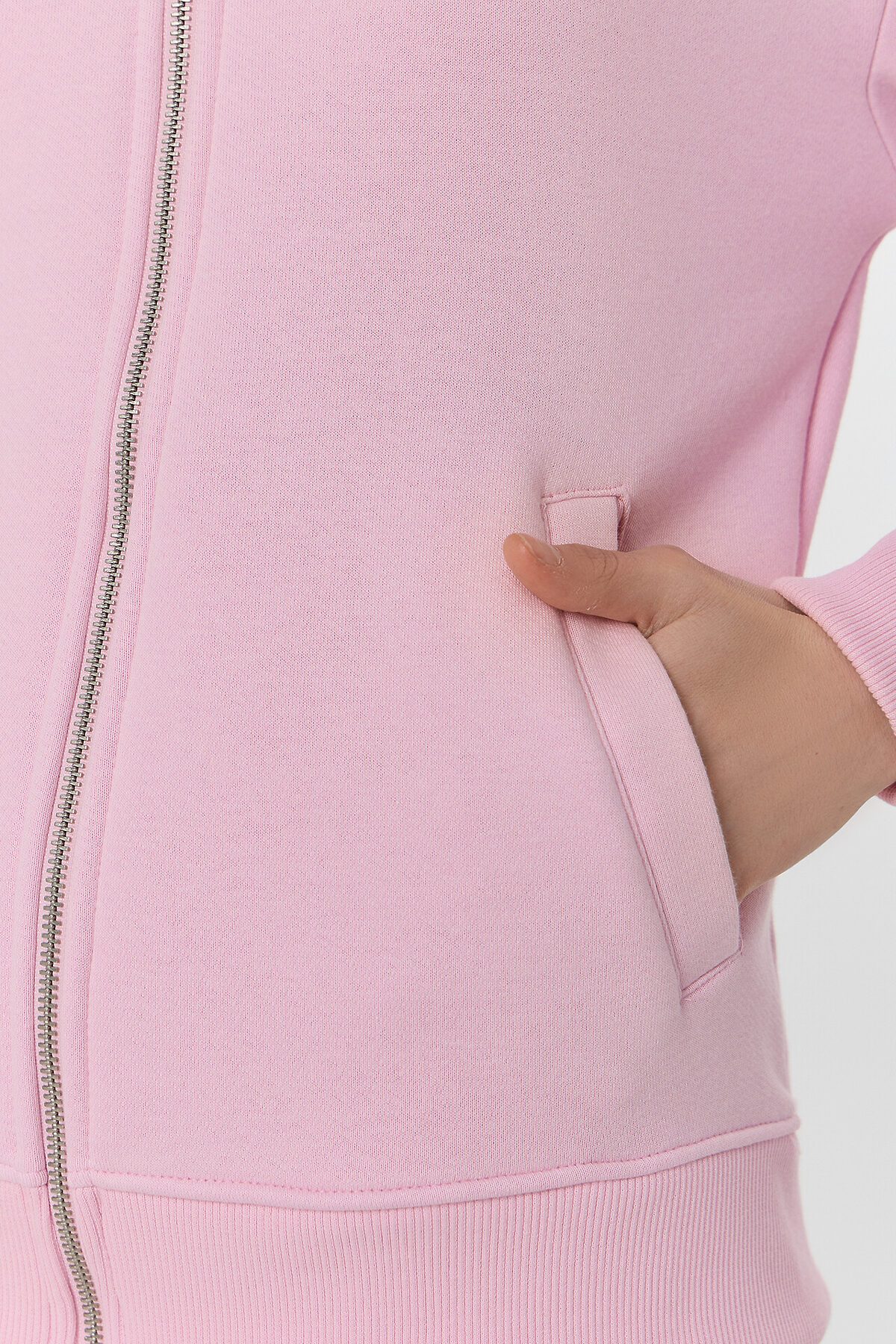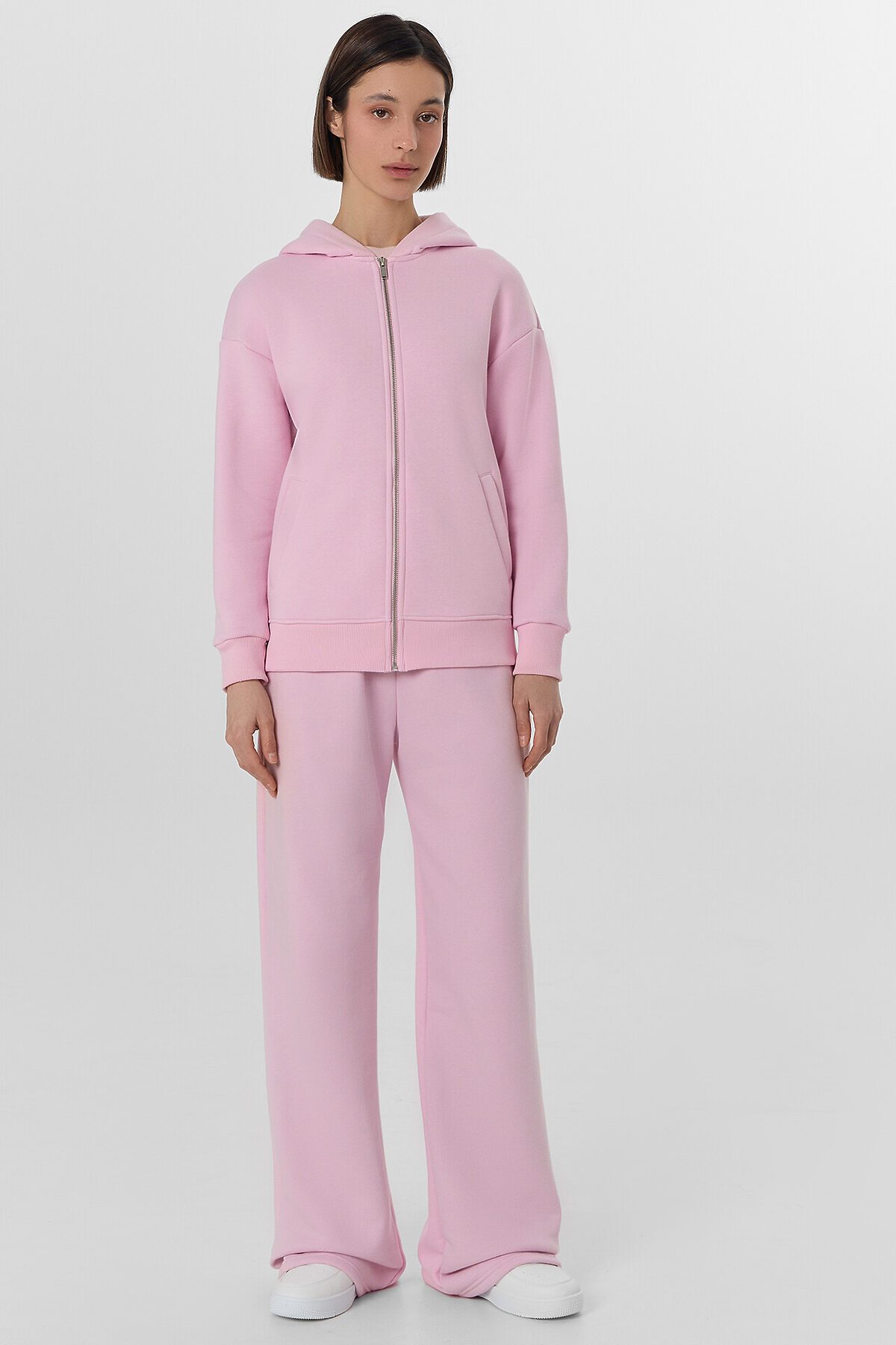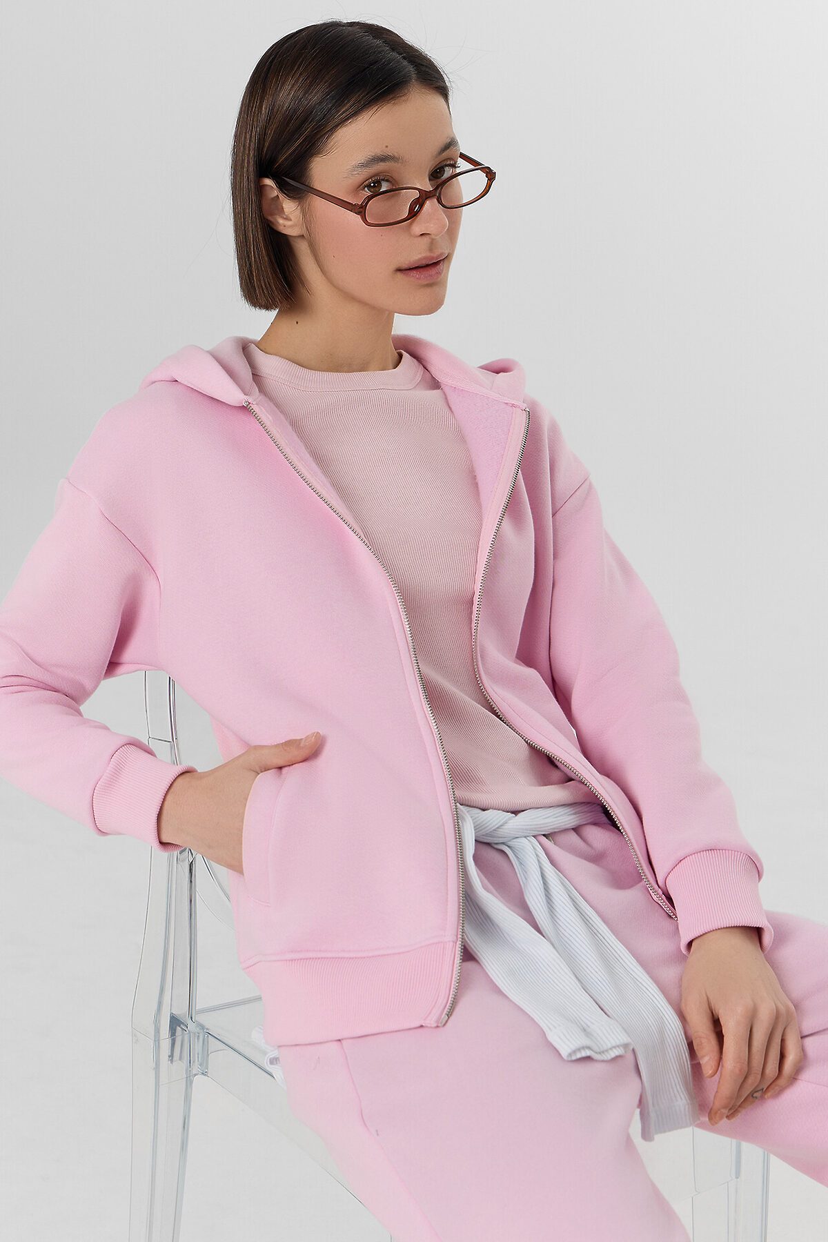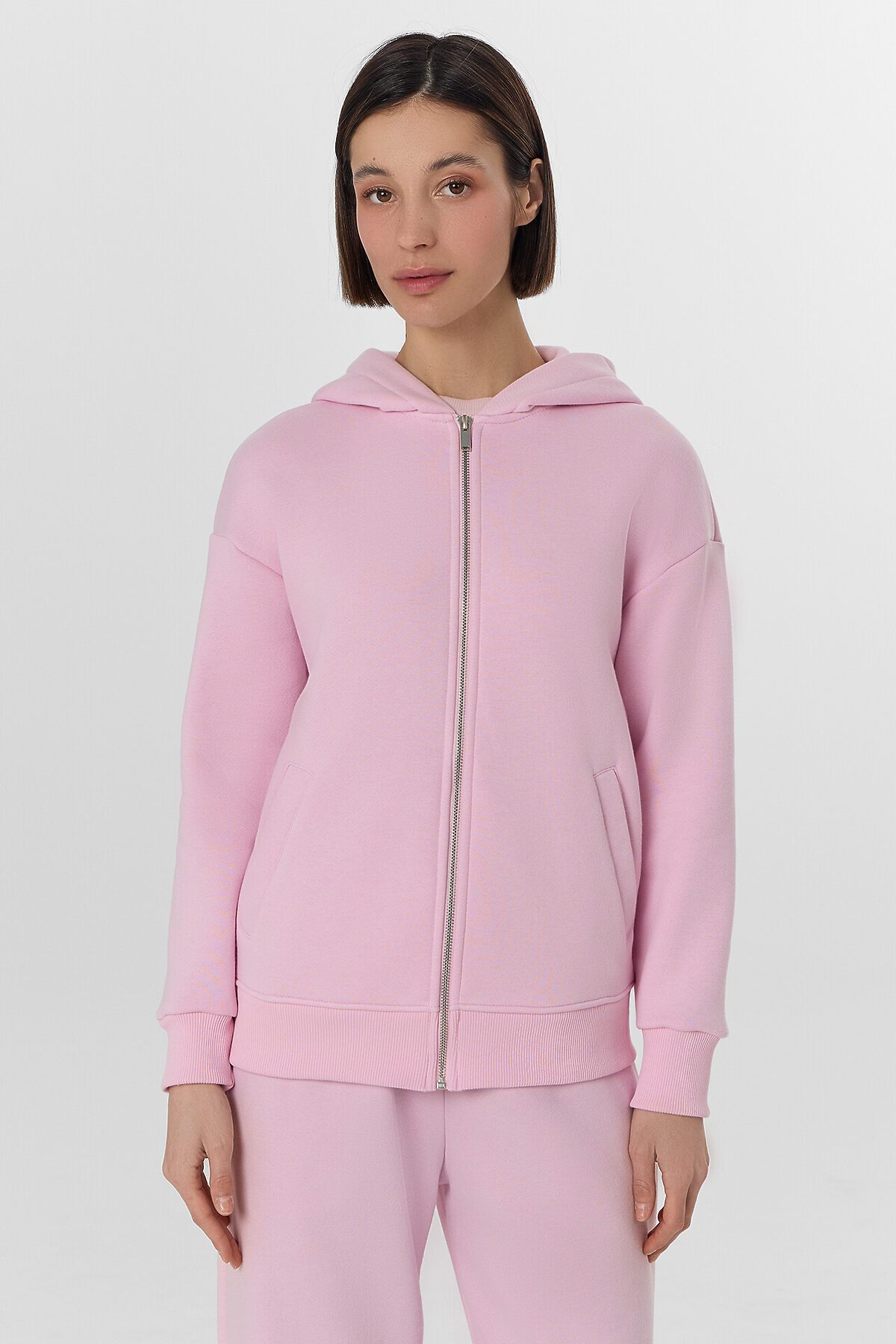 Толстовка свободная, спереди прорезные карманами с листочкой. Подкладка карманов из кулирного полотна. Горловина округлой формы с капюшоном. Рукав втачной, длинный с отрезными манжетами из рибаны. Линия плеча спущена. Центральная застежка на тесьму-молнию. По низу отрезной пояс из рибаны.