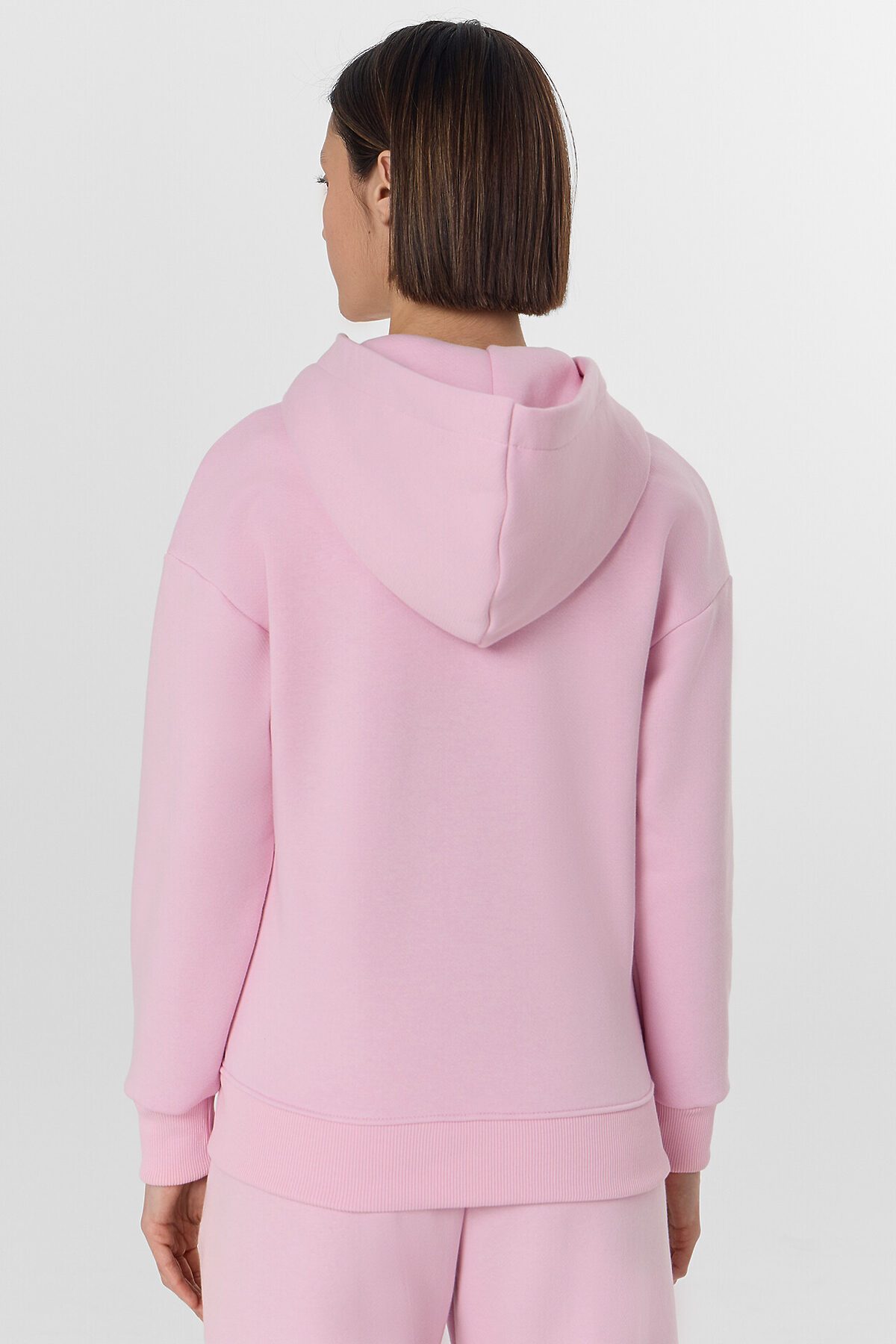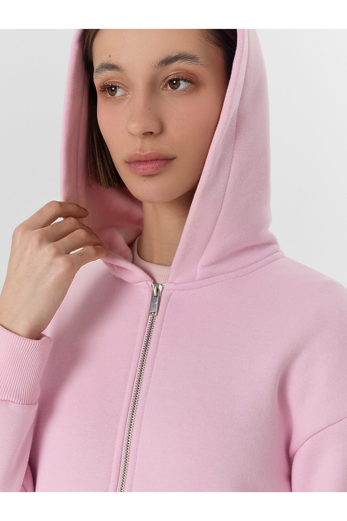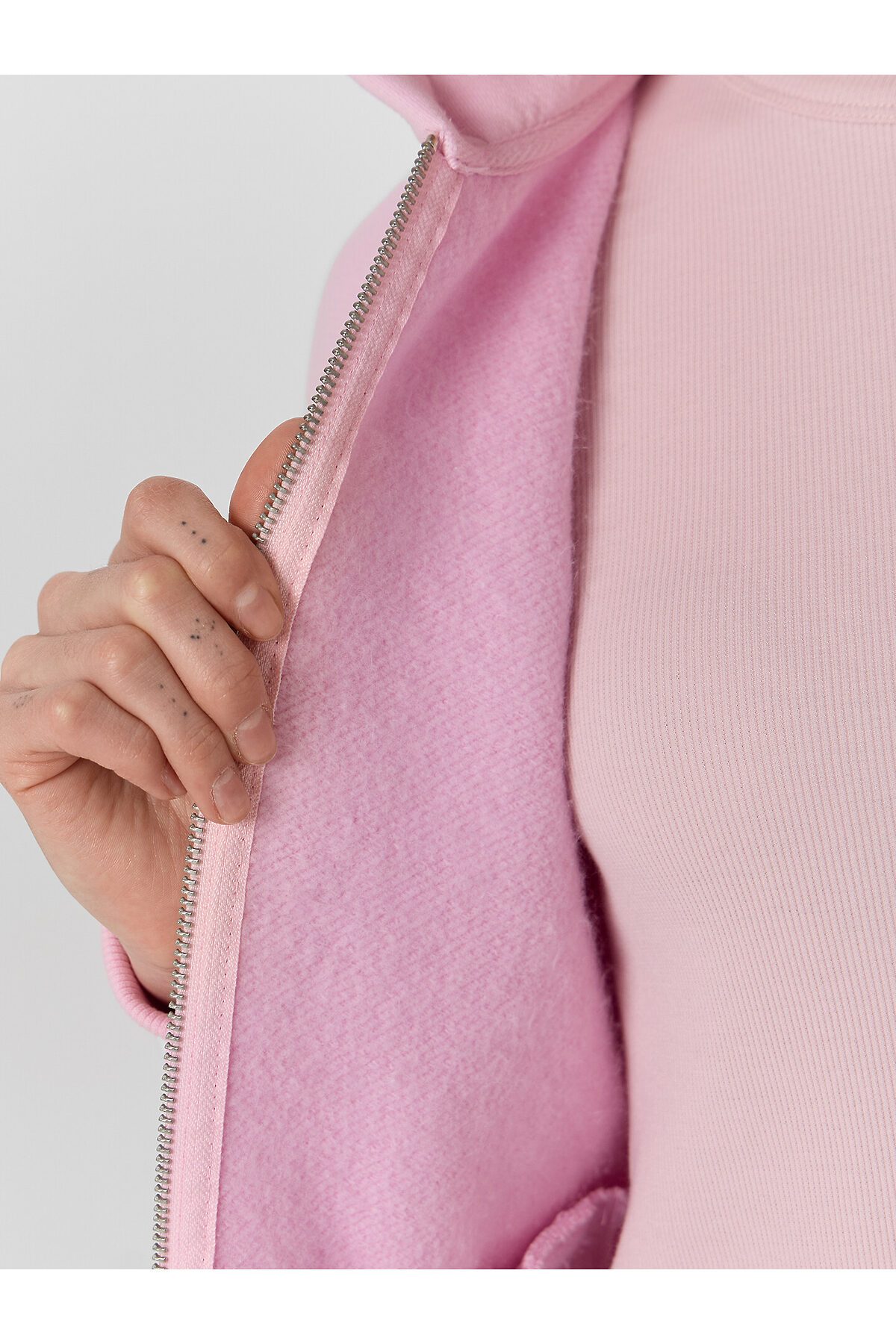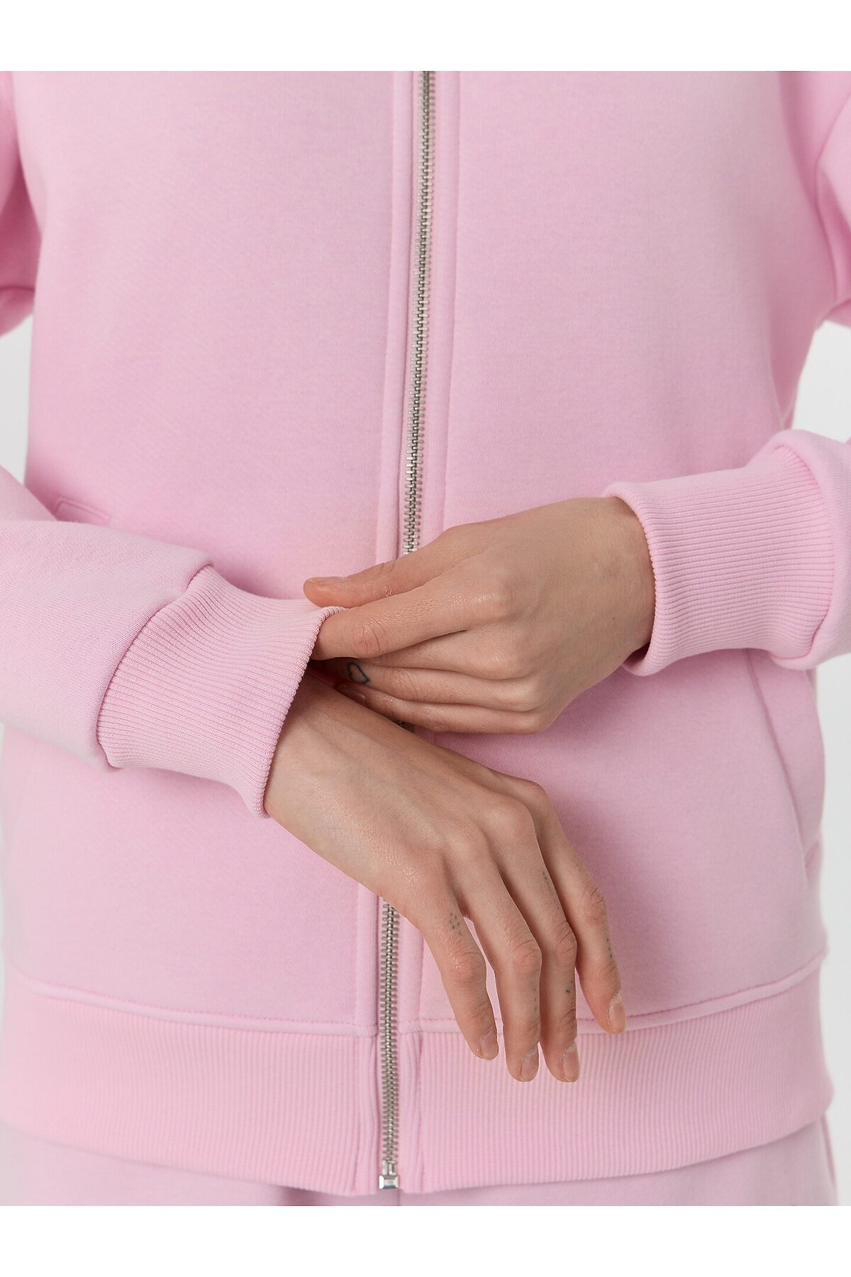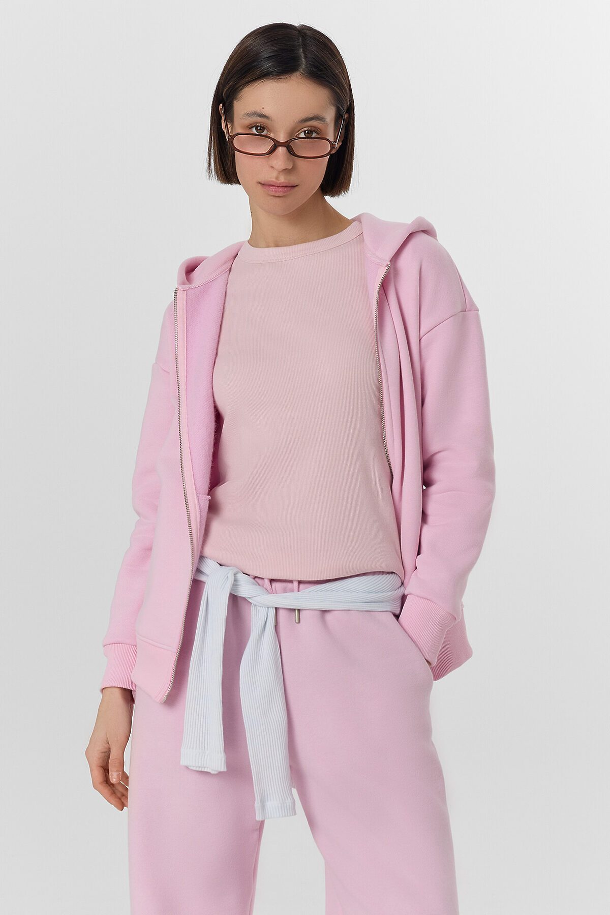 Толстовка свободная, спереди прорезные карманами с листочкой. Подкладка карманов из кулирного полотна. Горловина округлой формы с капюшоном. Рукав втачной, длинный с отрезными манжетами из рибаны. Линия плеча спущена. Центральная застежка на тесьму-молнию. По низу отрезной пояс из рибаны.