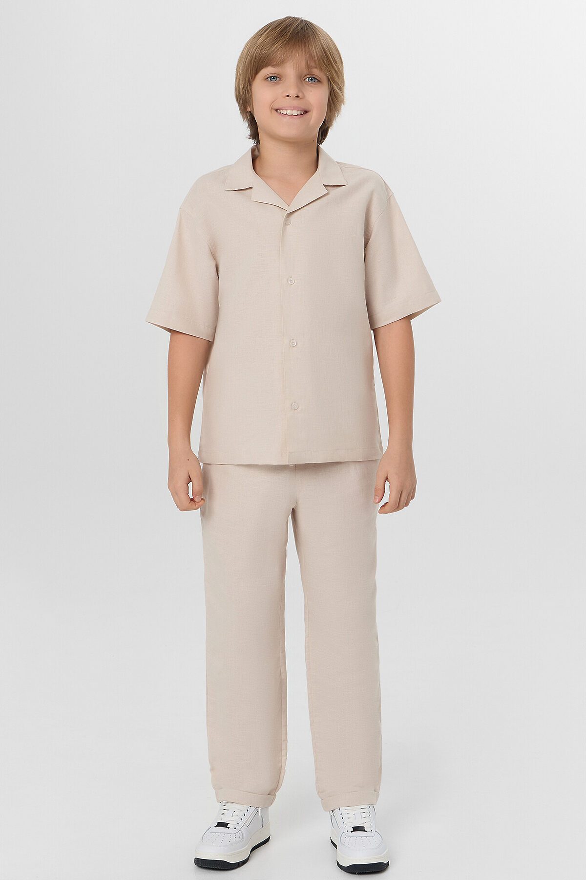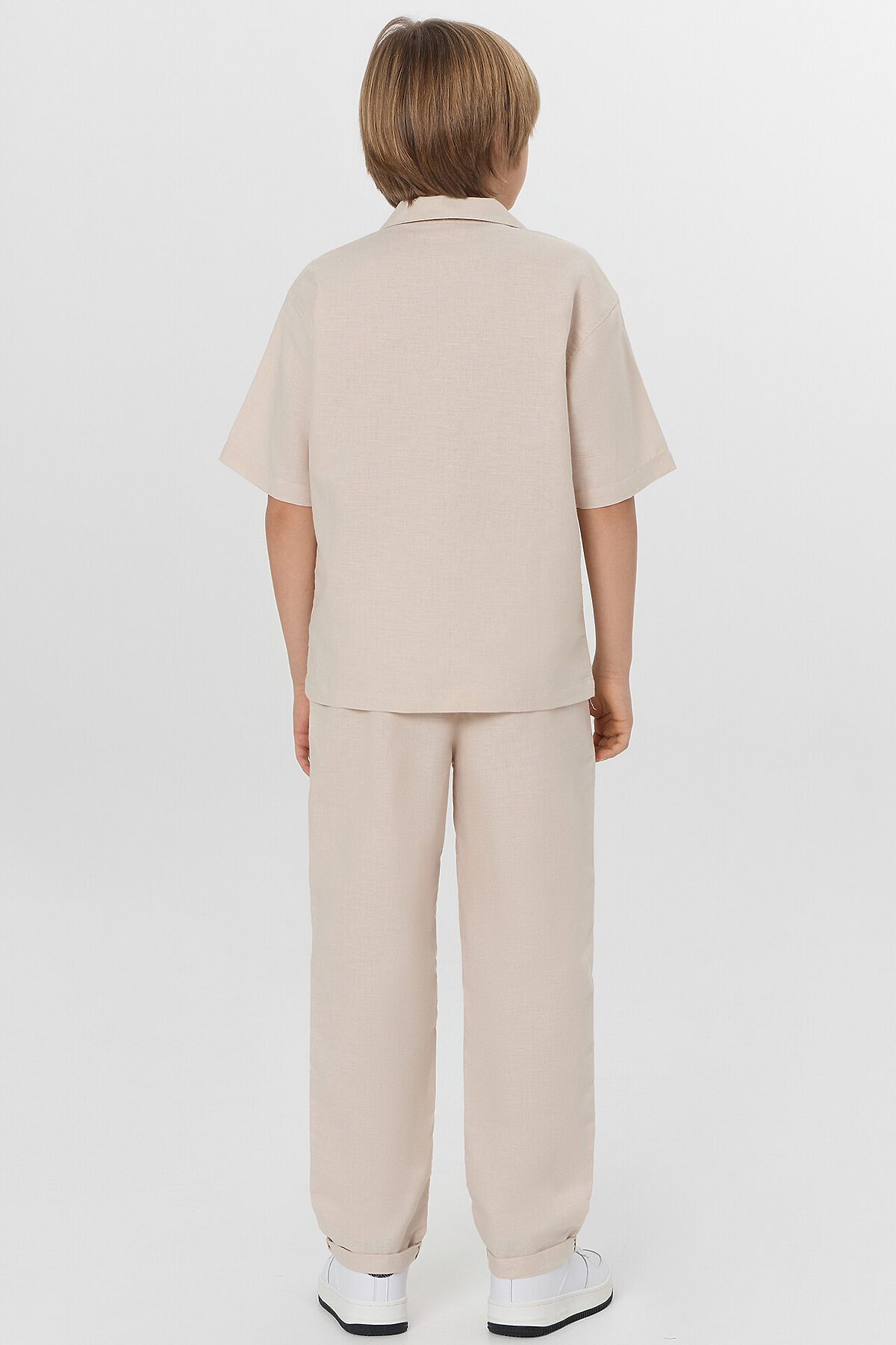 Комплект из двух предметов. Жакет прямого силуэта с воротником. По переду обработана застежка на пуговицы d=10mm и петли. Рукава короткие, втачные, слегка спущены. Нижние срезы изделия и рукавов обработаны швом в подгибку. Брюки прямого силуэта. Посадка средняя. Пояс цельнокроеный с эластичной тесьмой внутри. На поясе пробиты петли, заправлен шнур из основного полотна. По переду имитация гульфика, обработаны карманы с наклонным входом от боковых швов. Низ изделия с отворотами.