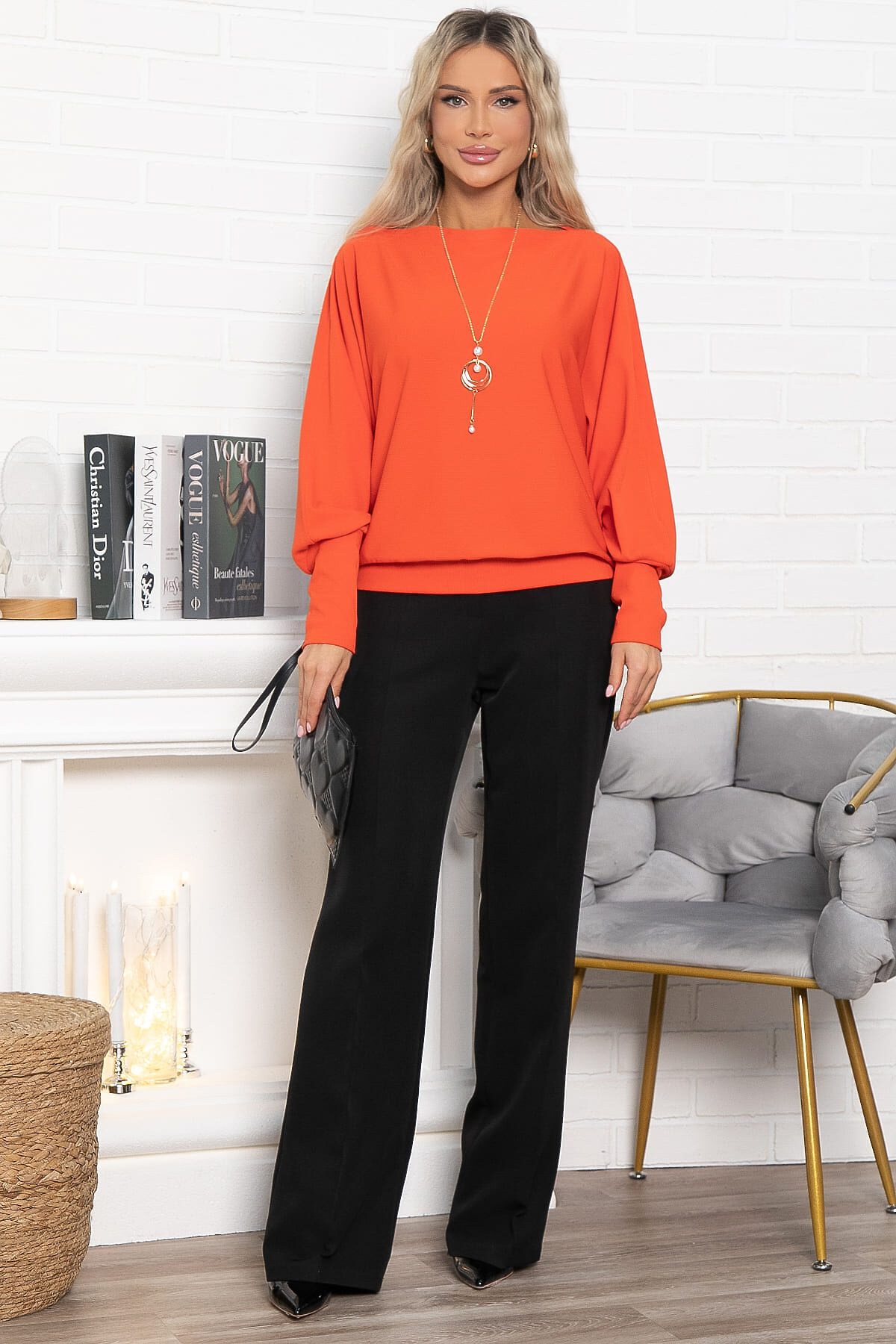 Великолепная трикотажная блуза сочетает в себе комфорт и утонченность. Овальный вырез горловины и цельнокроеные рукава «летучая мышь» придают ей уникальный вид. Высокий манжет по низу рукавов добавляет изысканности. Эта блуза отлично сочетается с юбками, брюками и джинсами любого фасона, создавая разнообразные модные образы. В комплекте идет подвеска, которая станет ярким акцентом и подчеркнет вашу индивидуальность.