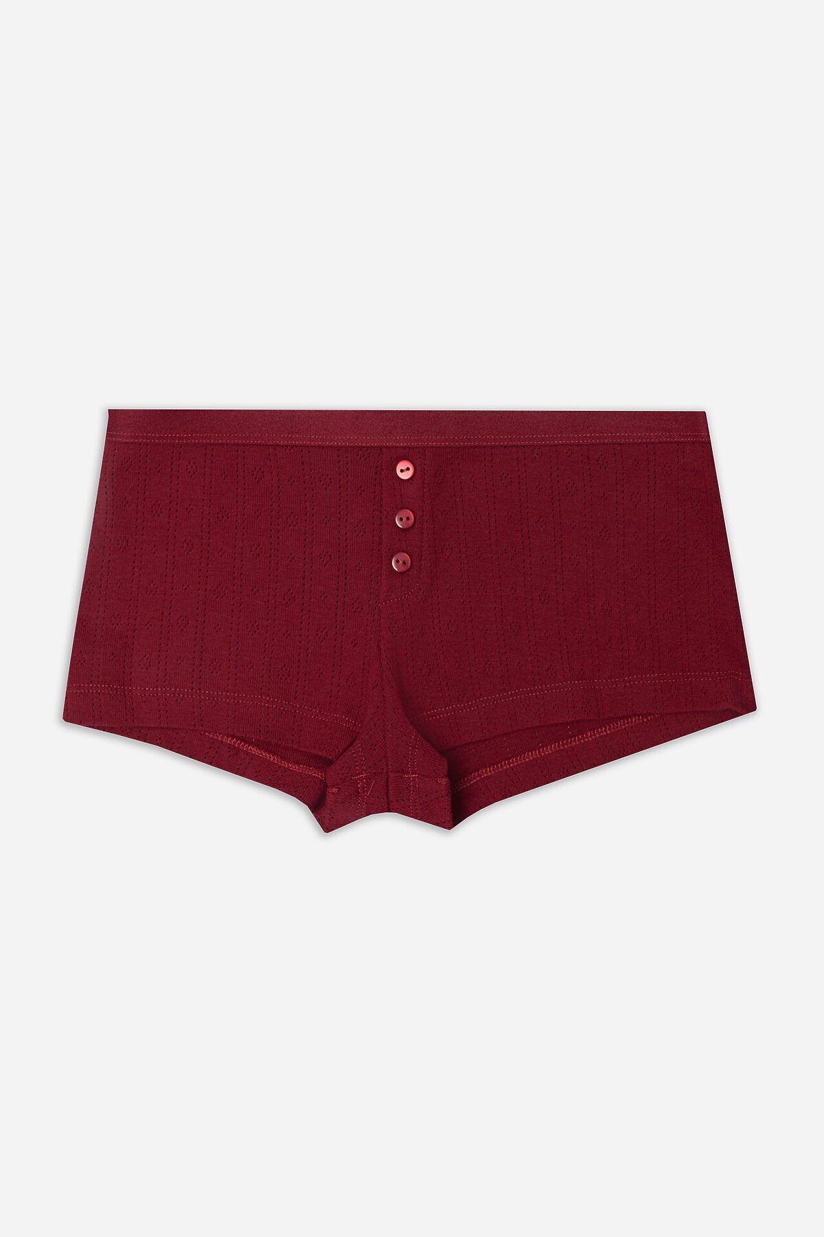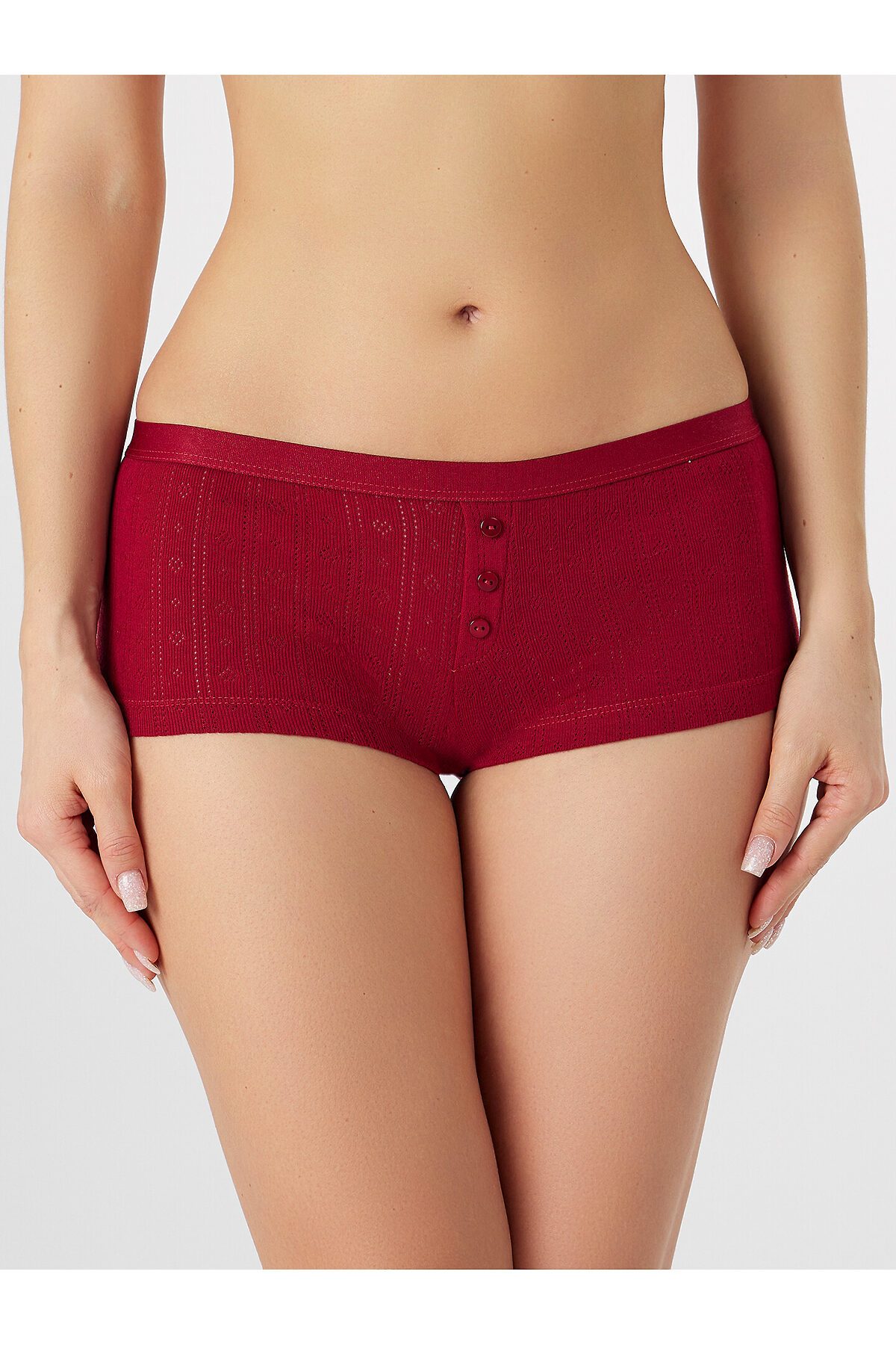 Трусы женские, силуэт шорты, из рибаны, со средней посадкой. Передняя деталь со средним швом, декорирована планкой с пуговицами (D= 10 мм, 3 шт). Подкладка ластовицы из кулирного полотна. Отлетная. Задняя деталь со средним швом. Верхний срез обработан жаккардом 20 мм (JT3-20, Devsel 1534W). Нижние срезы обработаны швом в подгибку.