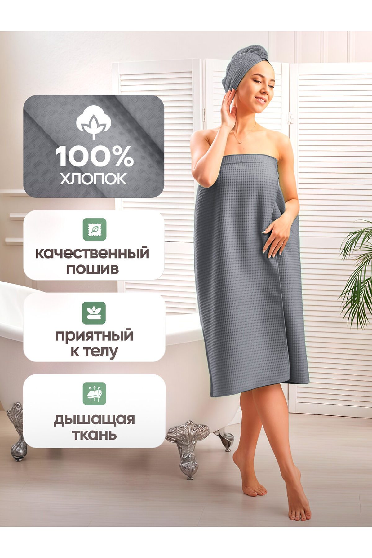 Ну кто не любит попариться в настоящей бане, или насладиться отдыхом и спа-процедурами? Если вы частая посетительница саун и бань, то вам непременно необходим этот великолепный килт банный женский. Этот набор банный заменит все для бани и сауны, при этом в комплект входит стильная чалма в подарок. Этот килт и тюрбан будут служить как халат и банная одежда для женщин, для детей и для девочек, как полотенце банное на резинке и даже как парео для пляжа. Текстиль банный вафельный - это чистый хлопок, вафельное полотно высокой плотности 240 г/м2 прекрасно впитывает влагу. Поэтому вафельные килты на резинке намного лучше впитывают влагу, чем махровый халат или полотенце и при этом он намного компактнее и занимает немного места. Килт вафельный размером 90х150 см идеально и надежно держится по фигуре. Комфортные и удобные накидка и шапочка станут вашим незаменимым спутником в бане, сауне, спа-салоне и просто в душевой спортивного клуба.