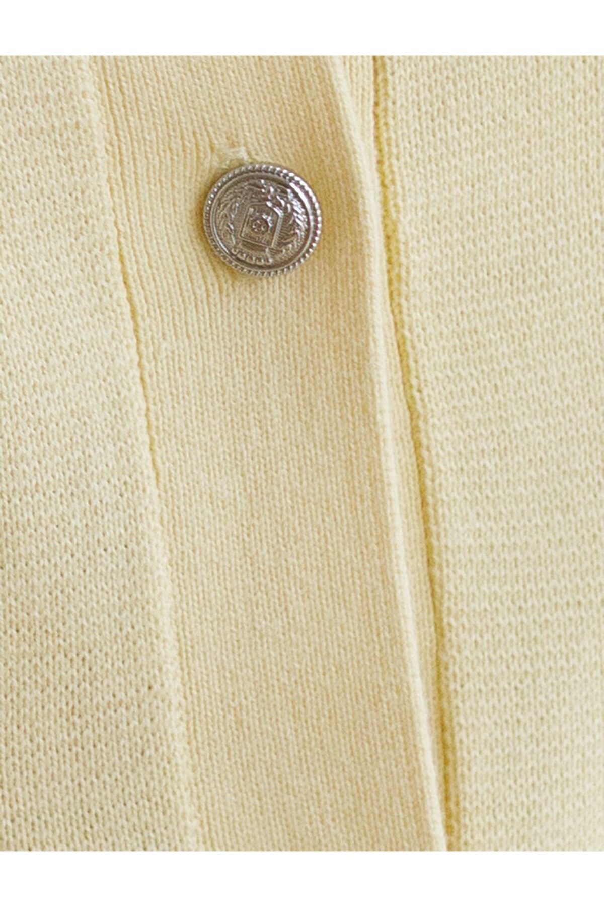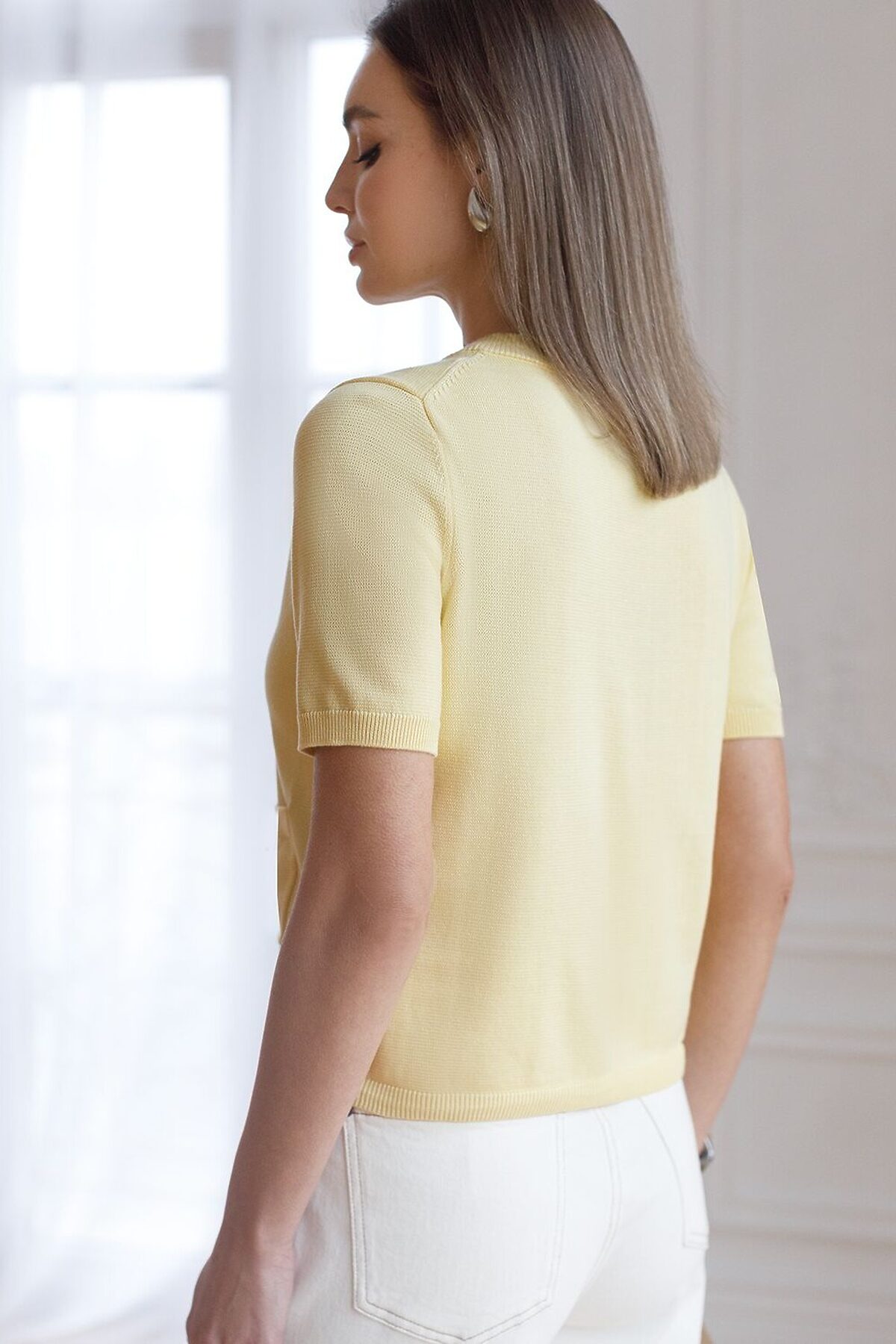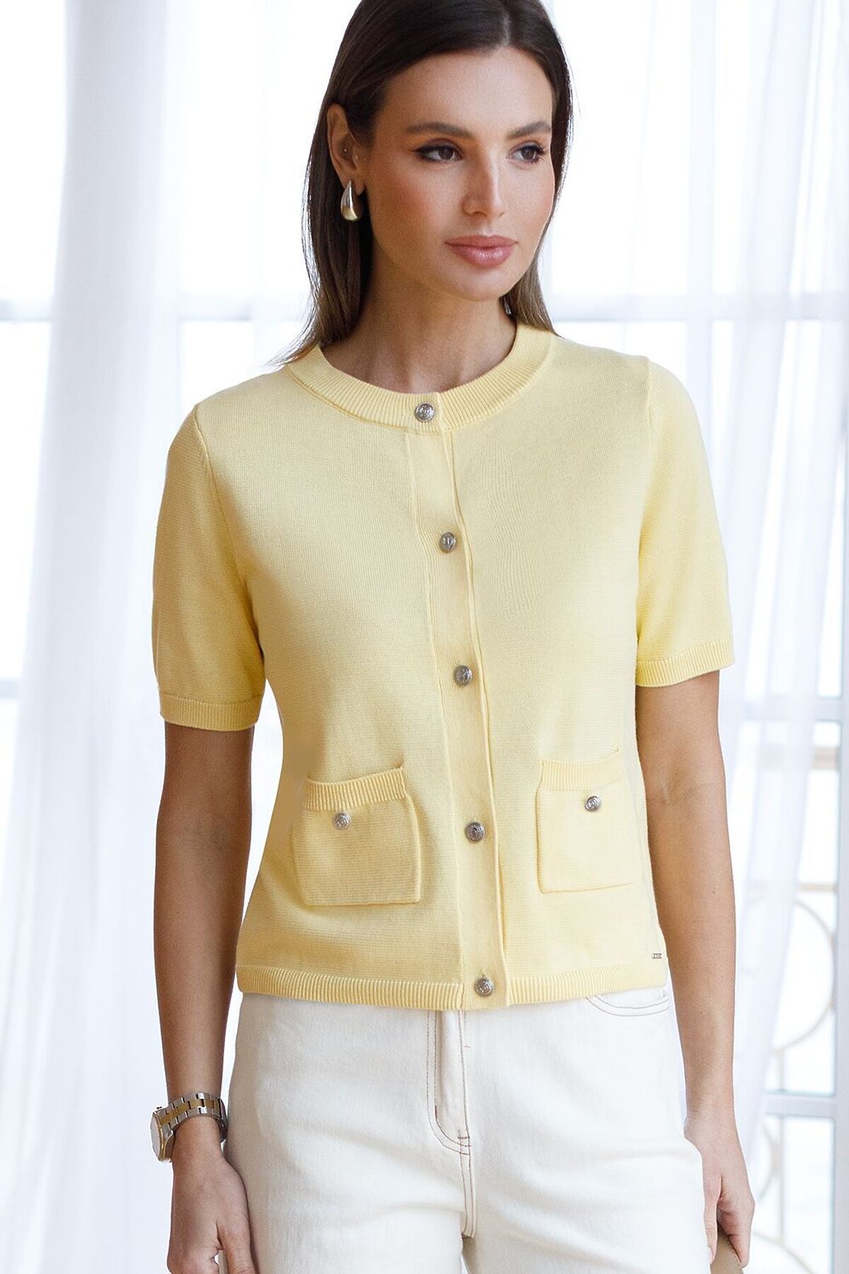 Вязаный кардиган светло-желтого цвета из хлопка с коротким рукавом — отличный выбор для весны и лета. Его женственный крой подчеркивает фигуру, а полуприлегающий силуэт создает аккуратный и стильный образ. Укороченный фасон гармонично сочетается с различными вариантами одежды, позволяя создавать как повседневные в стиле old money, так и более нарядные комплекты. Модель выполнена на пуговицах, что добавляет удобства при носке и делает жакет практичным для разных случаев. Круглый ворот подчеркивает элегантность кардигана, делая его подходящим для офисного или городского стиля. Лаконичный дизайн дополнен карманами — они не только украшают, но и делают повседневный кардиган функциональным и удобным. Благодаря натуральному хлопку жакет обеспечивает комфорт даже в жаркие дни: хлопок позволяет коже дышать и поддерживает оптимальный микроклимат. А акрил в составе придает мягкость, отличную цветостойкость, а также гипоаллергенность и устойчивость к деформации, что делает кардиган легким в уходе.Женственный крой выгодно смотрится на любой фигуре, в том числе и больших размерах, а аккуратная отделка придает особую изысканность. Такой жакет идеально подойдет для прогулок по городу, работы или важных мероприятий.