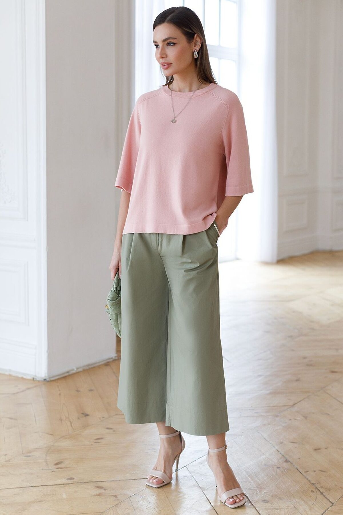 Легкий свободный джемпер светло-розового цвета с круглым вырезом идеально подходит на весну и лето. Тонкая вязка из вискозы дарит приятный комфорт и ощущение свежести в теплую погоду. Универсальная длина позволяет сочетать джемпер с разными элементами гардероба. Джемпер отлично смотрится на больших размерах благодаря продуманному крою и свободному фасону. Широкие рукава создают воздушность и делают силуэт особенно женственным. Этот джемпер с рукавом 3/4 станет незаменимой частью гардероба в сезоны, когда хочется легкости и элегантности одновременно. Лаконичный дизайн обеспечивает простоту комбинирования с другими вещами и будет универсальной базой для создания разнообразных комплектов — от офисного до непринужденного городского стиля.