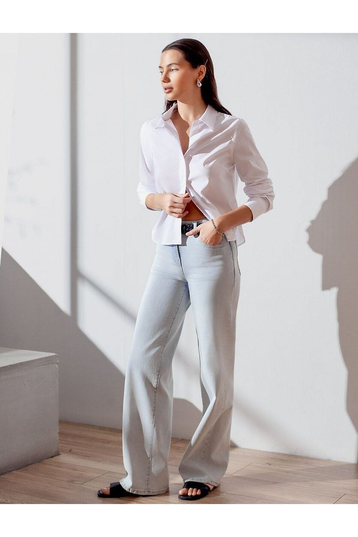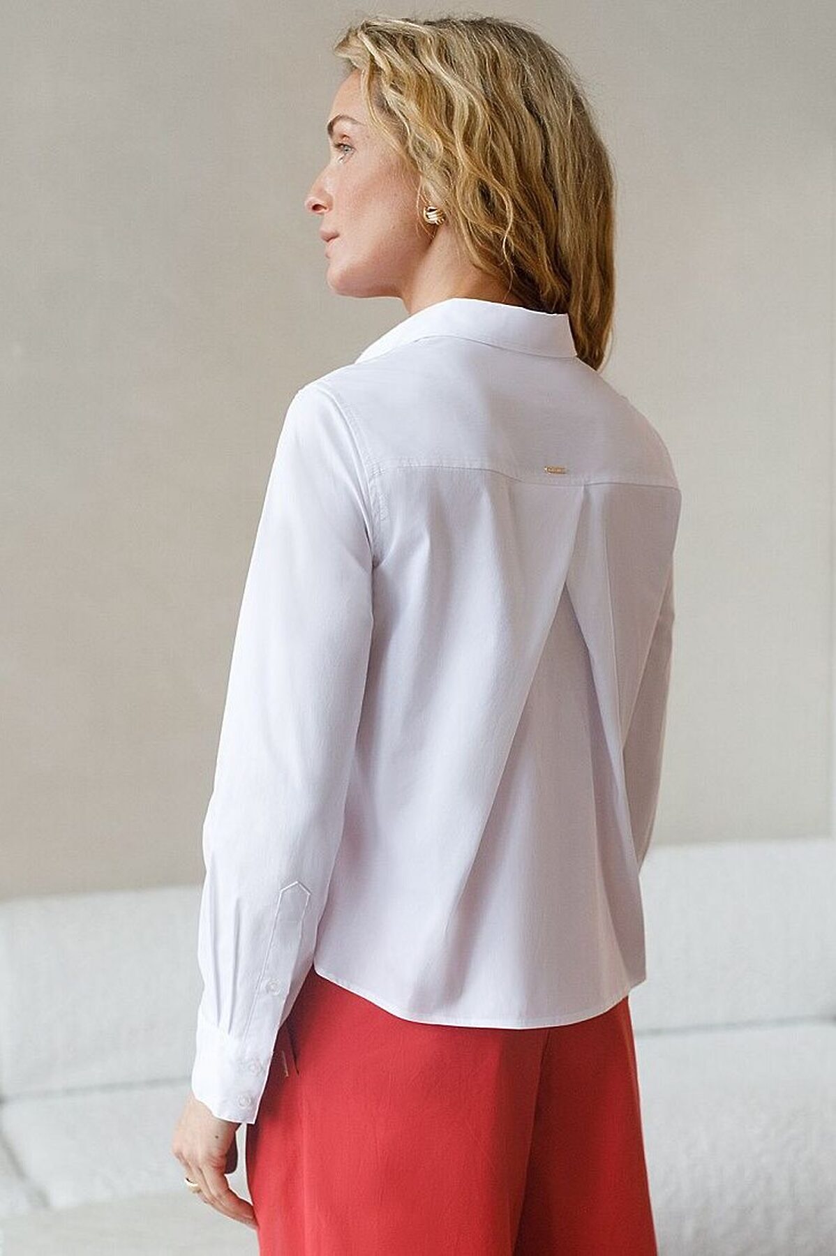 Стильная укороченная блузка белого цвета создана для комфорта в любой ситуации. Эластичный хлопок делает модель приятной для тела и хорошо дышащей, что особенно важно в течение долгого дня. Свободный крой не ограничивает движения, подходит на любую фигуру и гармонично смотрится в разных образах. Повседневная блузка держит форму даже после продолжительной носки, что помогает всегда выглядеть аккуратно. На чуть удлиненной спинке выполнена декоративная складка, придающая дополнительный объем и интересный силуэт. Отложной воротник придает классический вид,, подходящий для офисных будней. Особенно стильно рубашка смотрится в непринужденных, городских или повседневных комплектах.