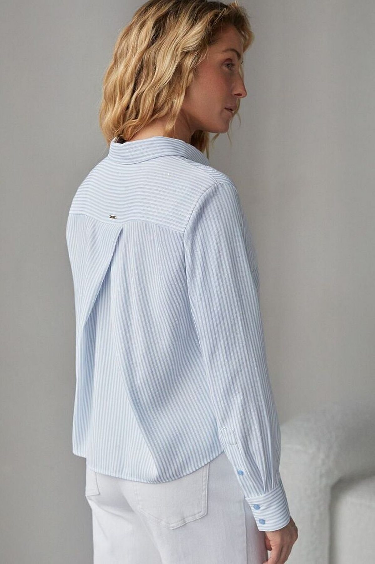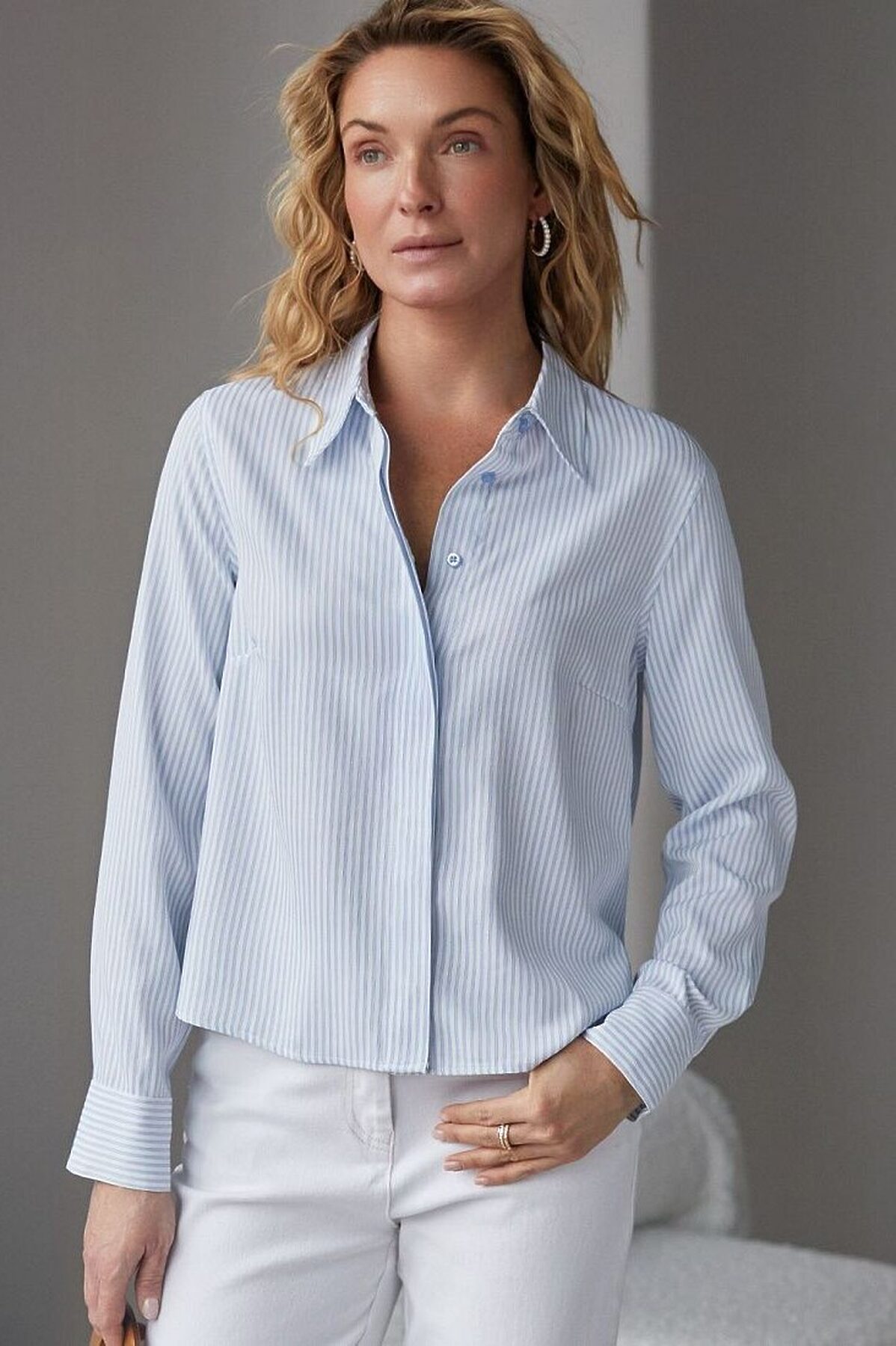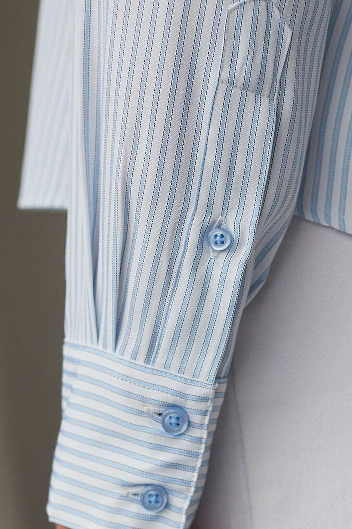 Стильная укороченная блузка белого цвета в голубую полоску создана для комфорта в любой ситуации. Эластичный хлопок делает модель приятной для тела и хорошо дышащей, что особенно важно в течение долгого дня. Свободный крой не ограничивает движения, подходит на любую фигуру и гармонично смотрится в разных образах. Всегда актуальный принт в полоску визуально вытягивает и стройнит фигуру, добавляет образу динамики, делая блузку эффектным акцентом в гардеробе. Повседневная блузка держит форму даже после продолжительной носки, что помогает всегда выглядеть аккуратно. На чуть удлиненной спинке выполнена декоративная складка, придающая дополнительный объем и интересный силуэт. Отложной воротник придает классический вид,, подходящий для офисных будней. Особенно стильно рубашка смотрится в непринужденных, городских или повседневных комплектах.