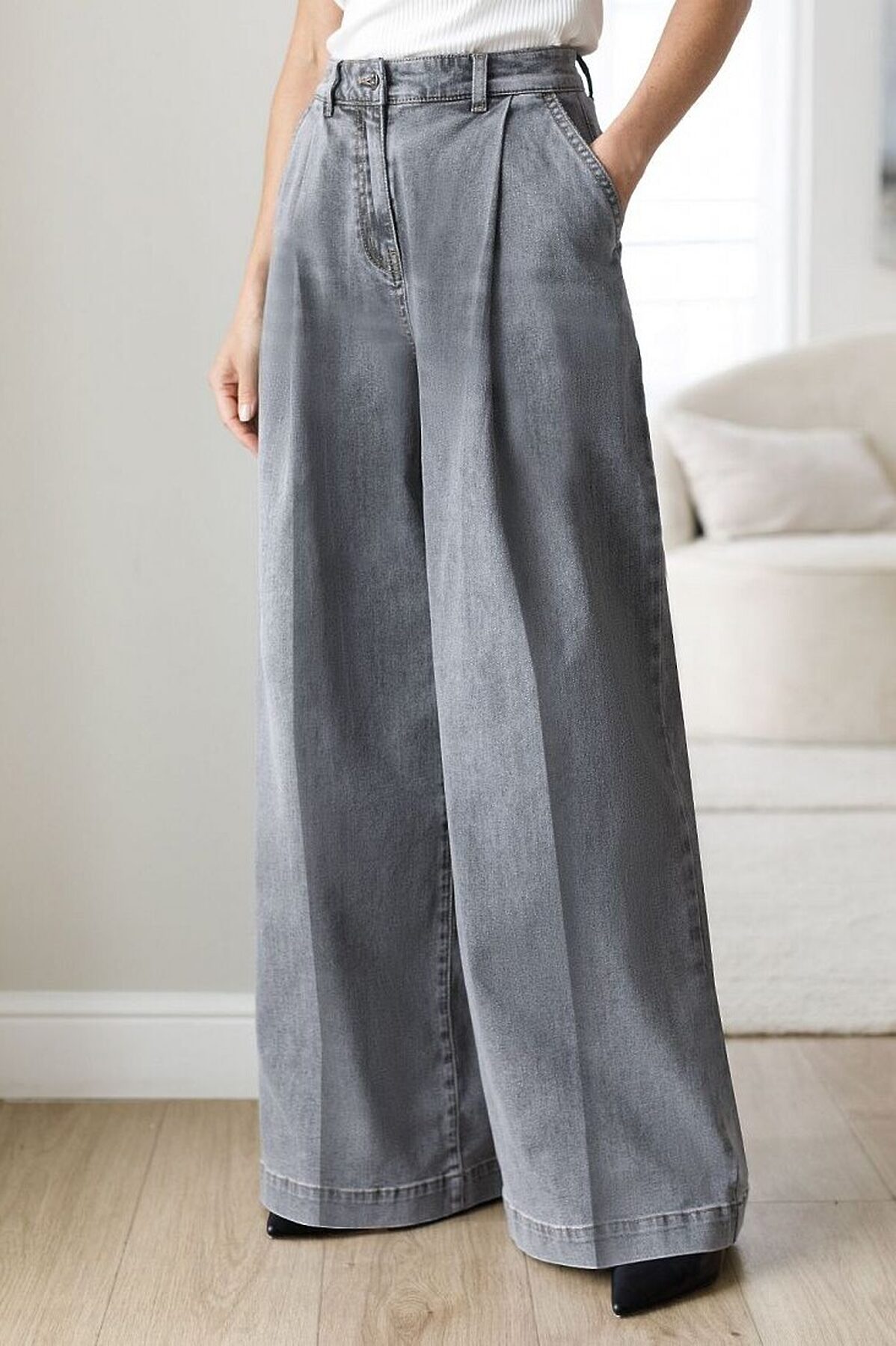 Свободные широкие джинсы серого цвета с защипами из эластичного денима созданы для тех, кто ценит комфорт и стиль в повседневной жизни. Модель отличается свободным кроем, который обеспечивает удобство движений и гармонично подчеркивает современный силуэт. Защипы добавляют изюминку и делают образ более интересным, а также визуально вытягивают силуэт. Благодаря использованию эластана материал сохраняет свою форму даже после длительной носки и многочисленных стирок. Джинсы отлично подходят для создания стильных городских образов, легко сочетаются с узкими и укороченными верхами. Универсальность модели делает ее идеальным выбором для прогулок по городу, встреч с друзьями или поездок на природу. Качественный материал приятен к телу и не вызывает дискомфорта даже при длительном ношении. Широкий крой хорошо смотрится на разных типах фигуры и помогает создать расслабленный модный лук без лишних усилий.