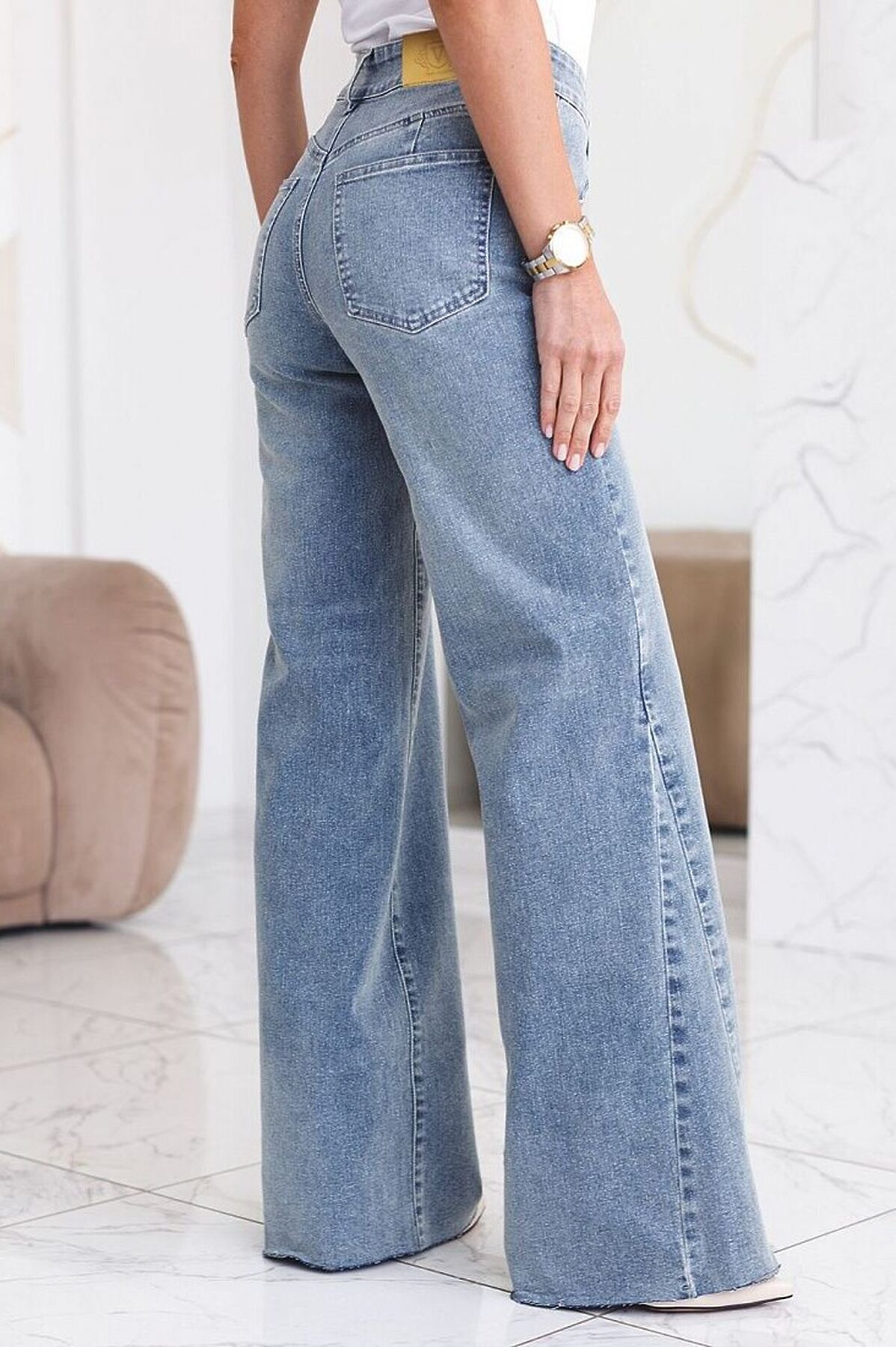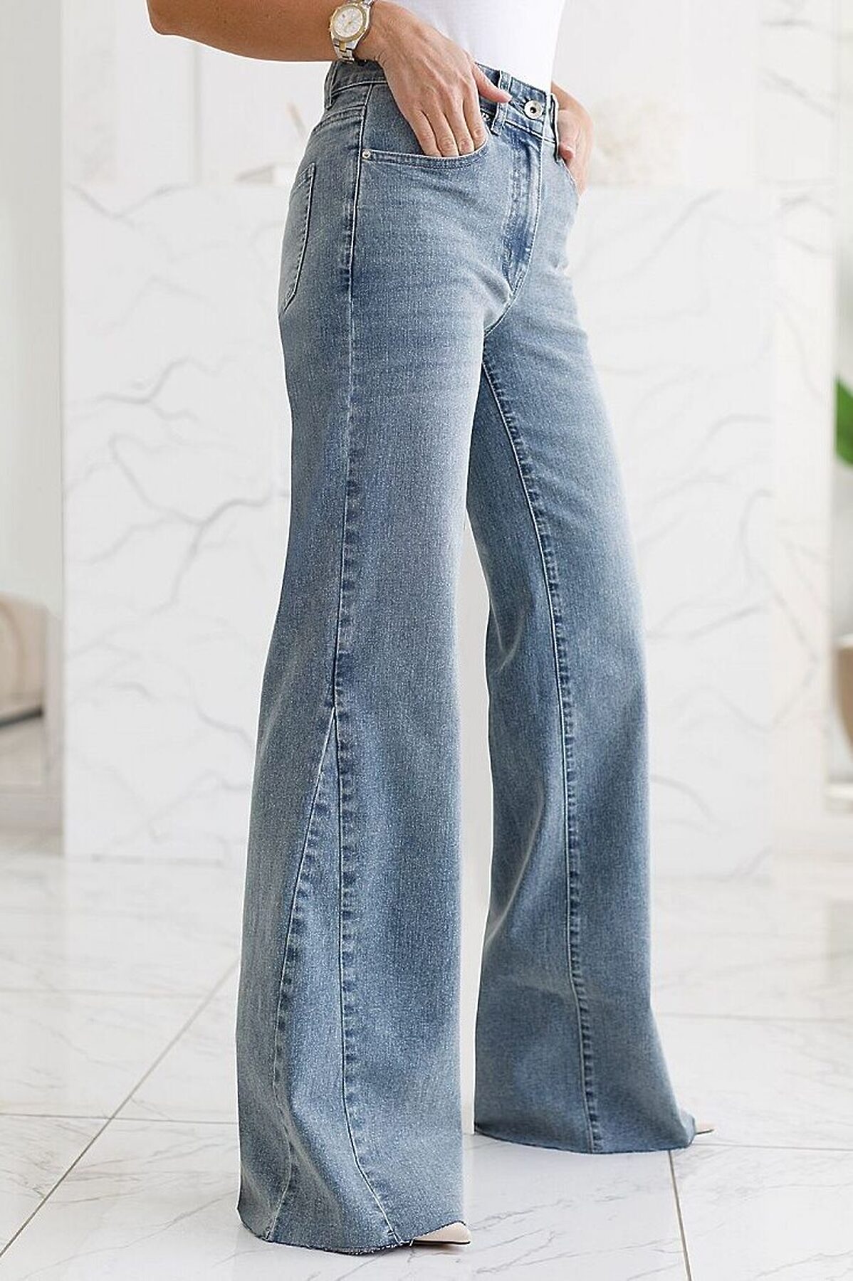 Джинсы клеш от колена расширенные к низу голубого цвета выполнены из эластичного денима плотностью 14,8 OZ, который отлично тянется и мягко садится по фигуре. Эластичный материал дарит свободу движений, а облегченная ткань делает эти джинсы идеальным выбором на каждый день. Клеш от колена выгодно вытягивает силуэт, визуально удлиняет ноги и подчеркивает округлые бедра, создавая женственный образ без лишних усилий. Джинсы подходят на большие размеры, позволяя чувствовать себя уверенно, специальный крой выгодно выделяет достоинства и мягко маскирует возможные нюансы фигуры. Flare Jeans легко впишутся в гардероб, дополнят повседневный или более яркий образ. Джинсы подходят тем, кто ценит уверенность в себе и всегда выбирает лучшее для своей фигуры.