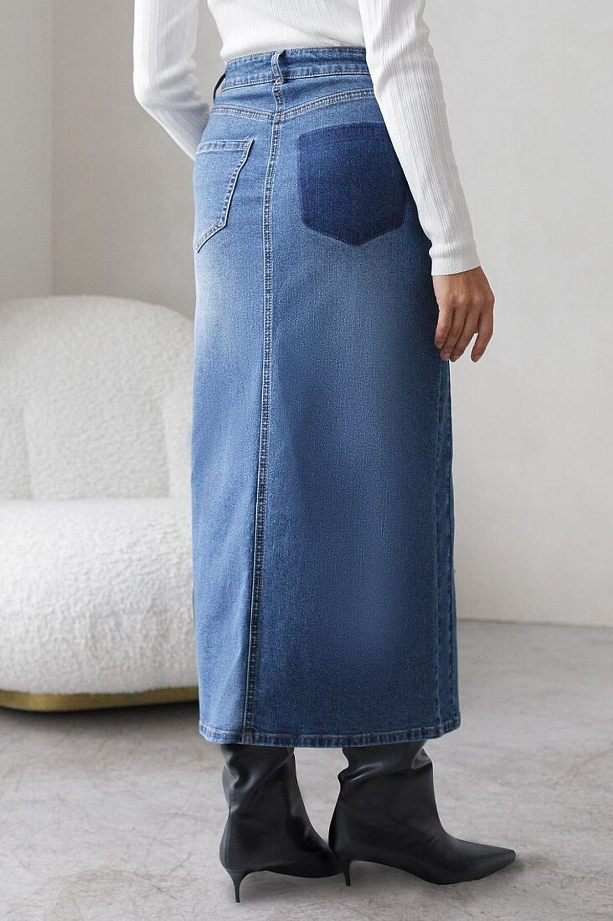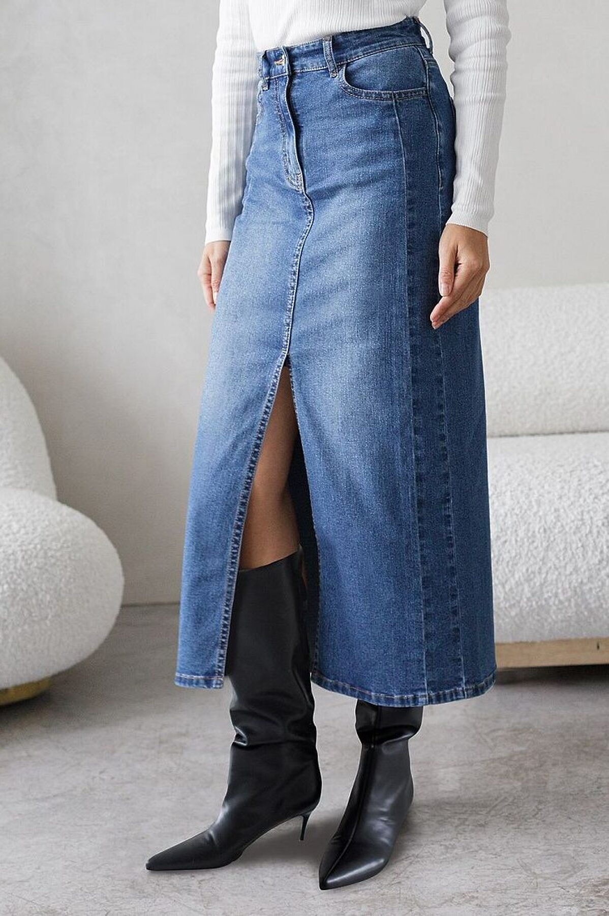 Джинсовая юбка миди с разрезом из эластичного облегченного денима — идеальный выбор для весны и лета. Эта стильная модель отличается комфортной посадкой и трендовой декоративной стиркой. Разрез спереди делает образ динамичным и женственным, позволяя свободно двигаться и оставаться в центре внимания. Юбка подходит на разные параметры фигуры: юбка на маленький размер подчеркнет стройность силуэта, а большие размеры обеспечат максимальное удобство без потери актуальности образа. Благодаря добавлению эластичных волокон изделие прекрасно садится по фигуре, не стесняет движений и дарит ощущение легкости даже в жаркие дни. Классический крой юбки подходит как для повседневных прогулок, так и для более торжественных случаев.