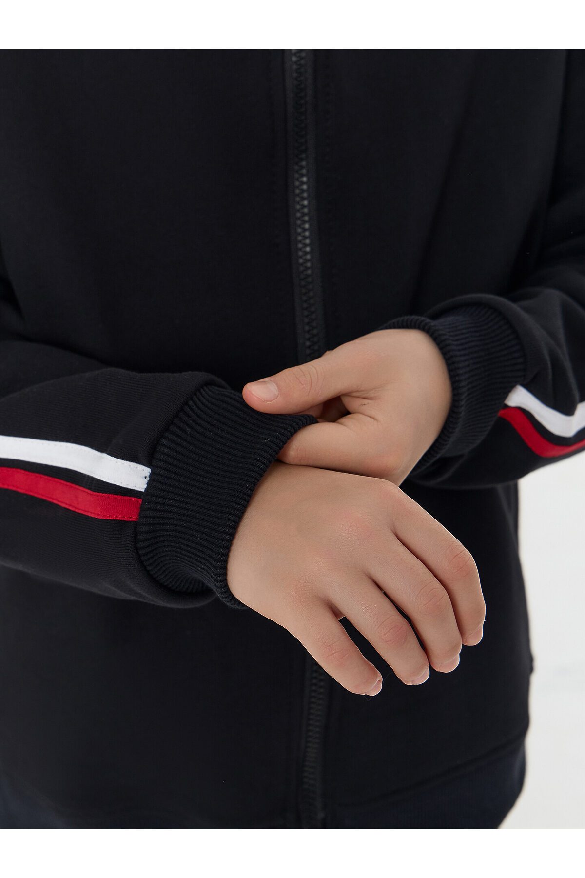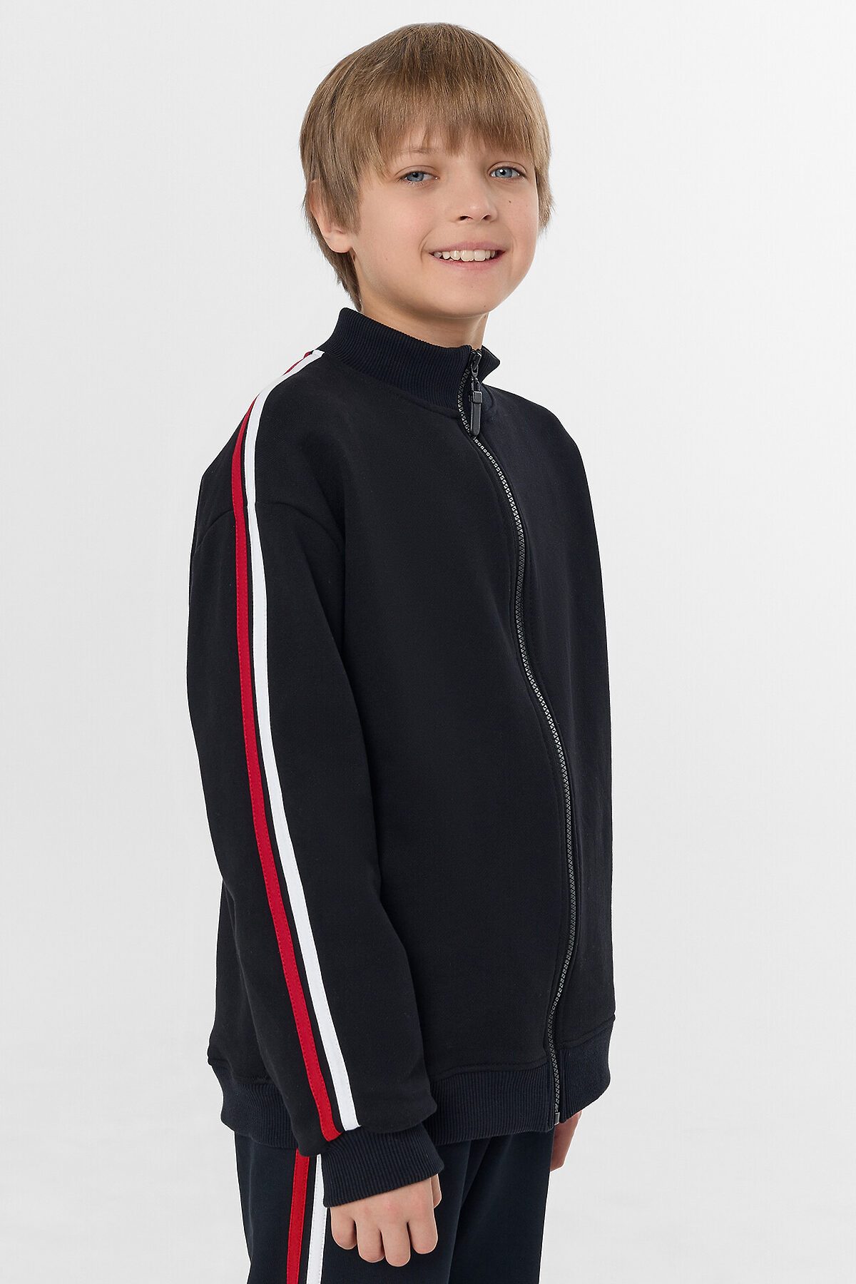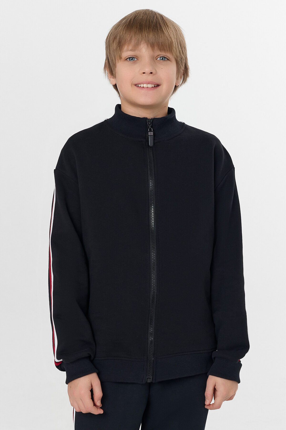 Горловина круглая с воротником стойкой из рибаны. Рукава втачные длинные по верху рукава настрочены лампасы из кулирки. По низу отрезные манжеты из рибаны. По переду обработана центральная застежка на молнию.