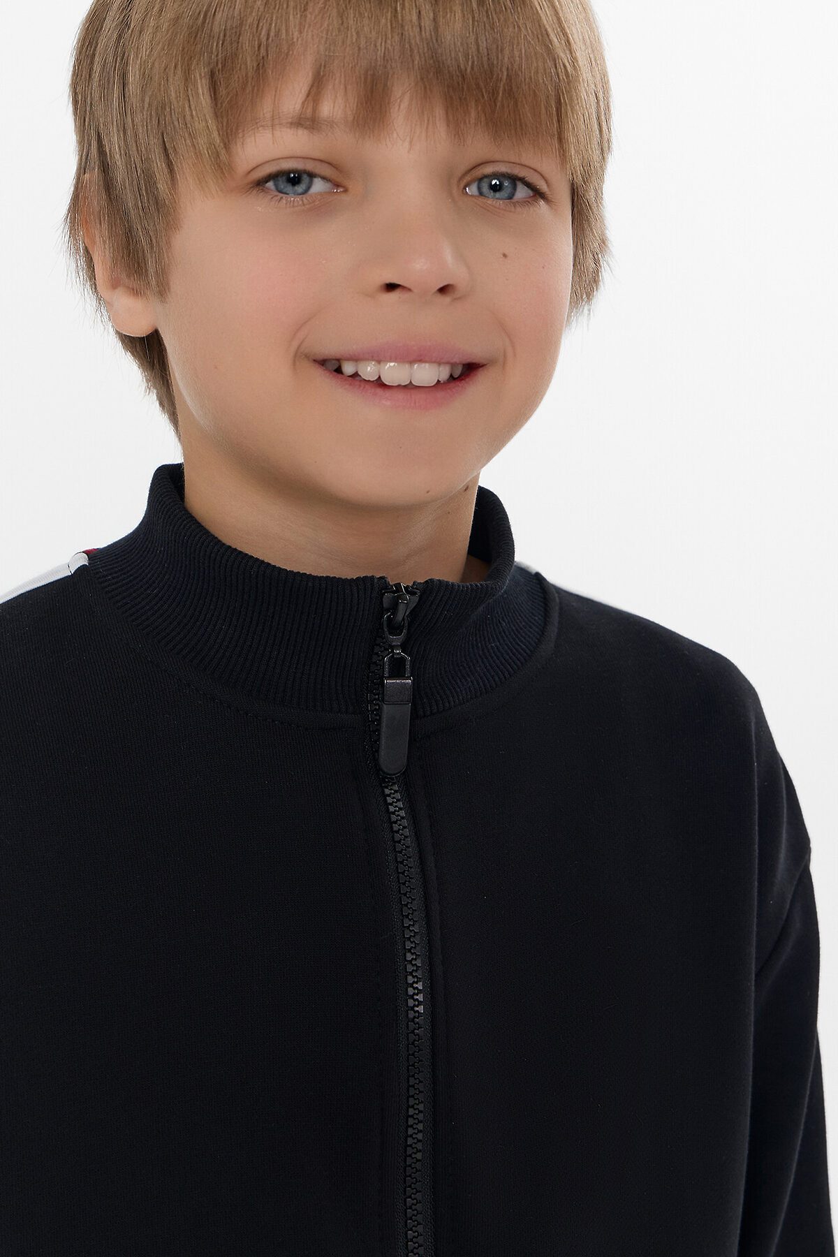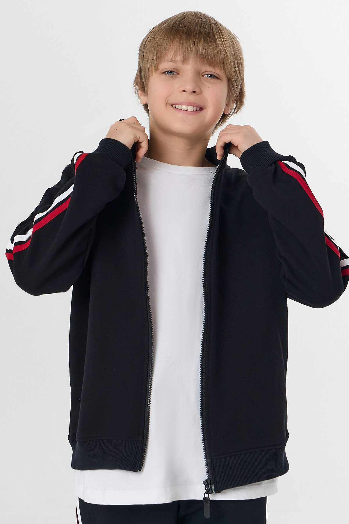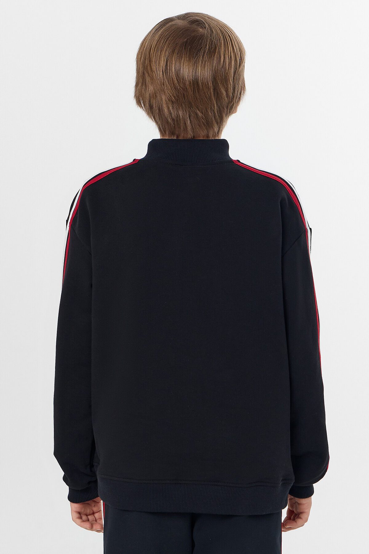 Горловина круглая с воротником стойкой из рибаны. Рукава втачные длинные по верху рукава настрочены лампасы из кулирки. По низу отрезные манжеты из рибаны. По переду обработана центральная застежка на молнию.
