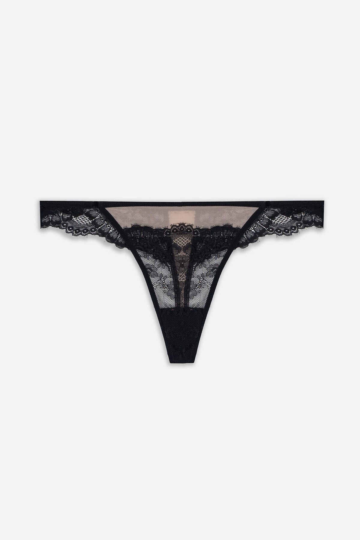 Соблазнительные стринги со средней линией талии. Трусики созданы из нежного эластичного кружева и полупрозрачной сетки. Верхний срез обработан тесьмой, нижние – жилкой. В местах соединения тесьмы – маленькие колечки. Мило, женственно, комфортно!