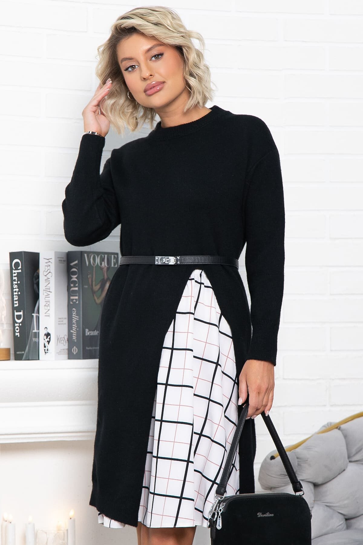 Принт : верх - однотонный, низ - клетка