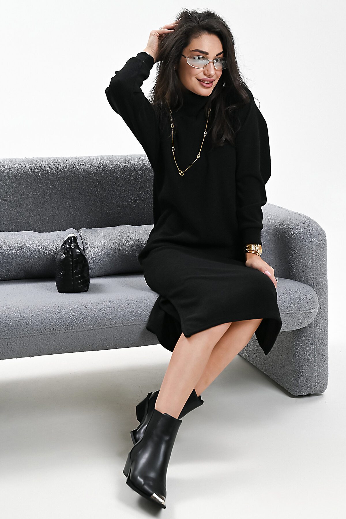 Это стильное вязаное платье черного, бежевого и белого цвета станет незаменимой вещью в вашем осенне-зимнем гардеробе. Модель прямого покроя с длинными рукавами и воротником-стойкой прекрасно подойдет для повседневной носки. Разрез на юбке добавляет образу изысканности и женственности. Платье выполнено из мягкого и приятного к телу материала с добавлением спандекса, что обеспечивает комфорт и свободу движений. Его универсальный черный цвет легко сочетается с различными аксессуарами и обувью.
