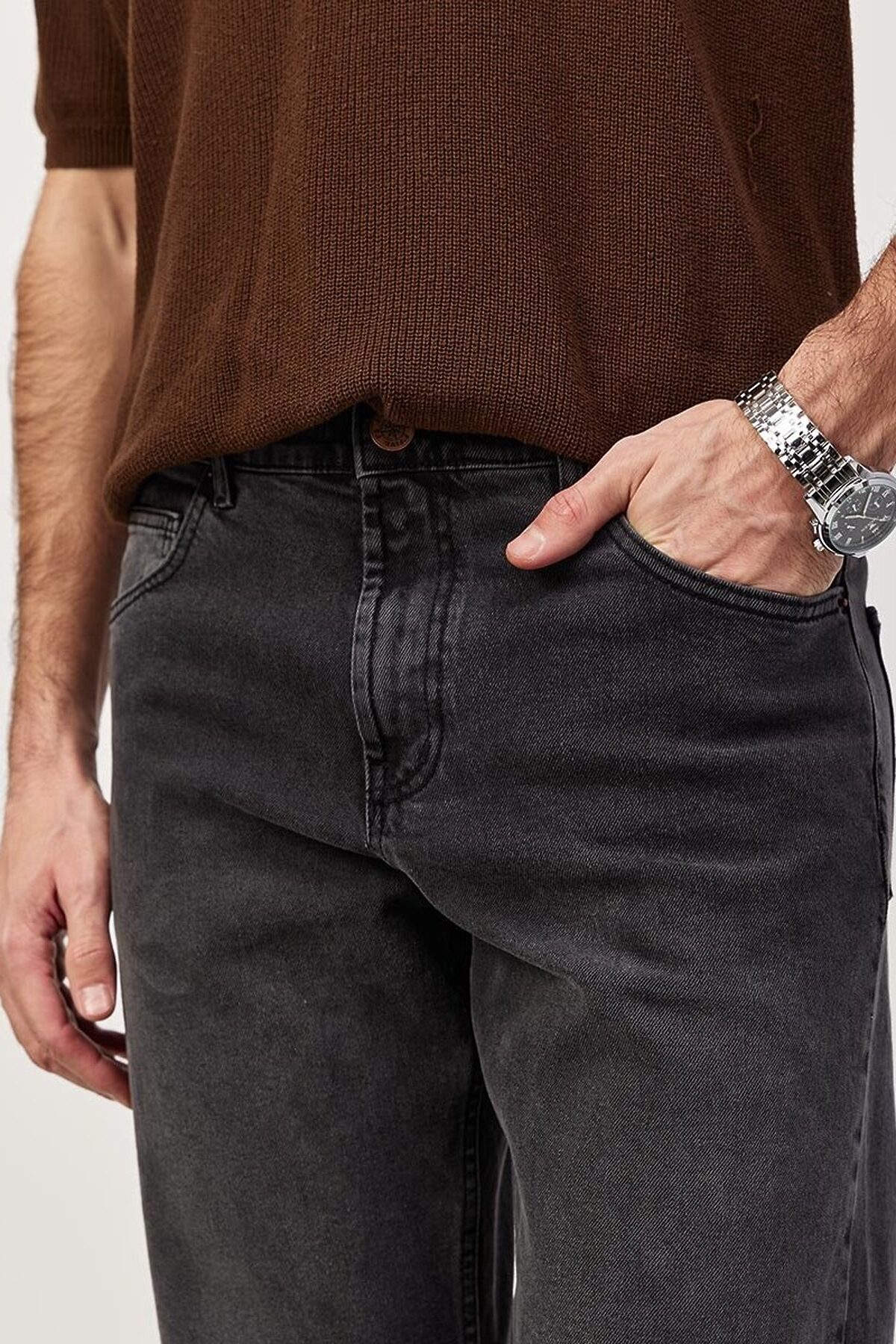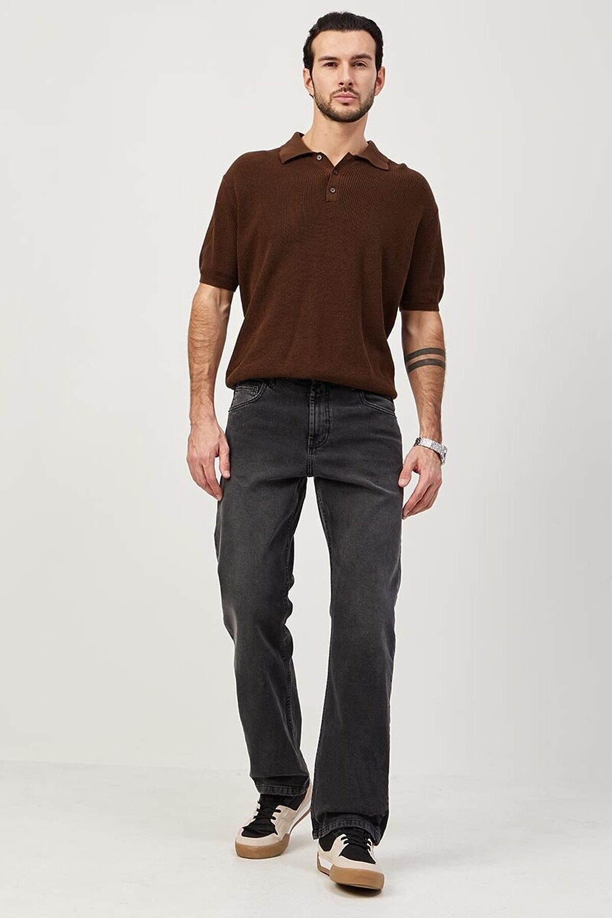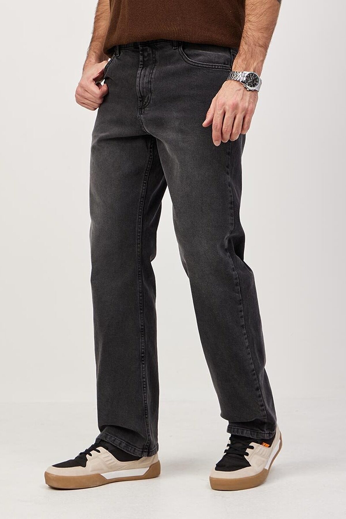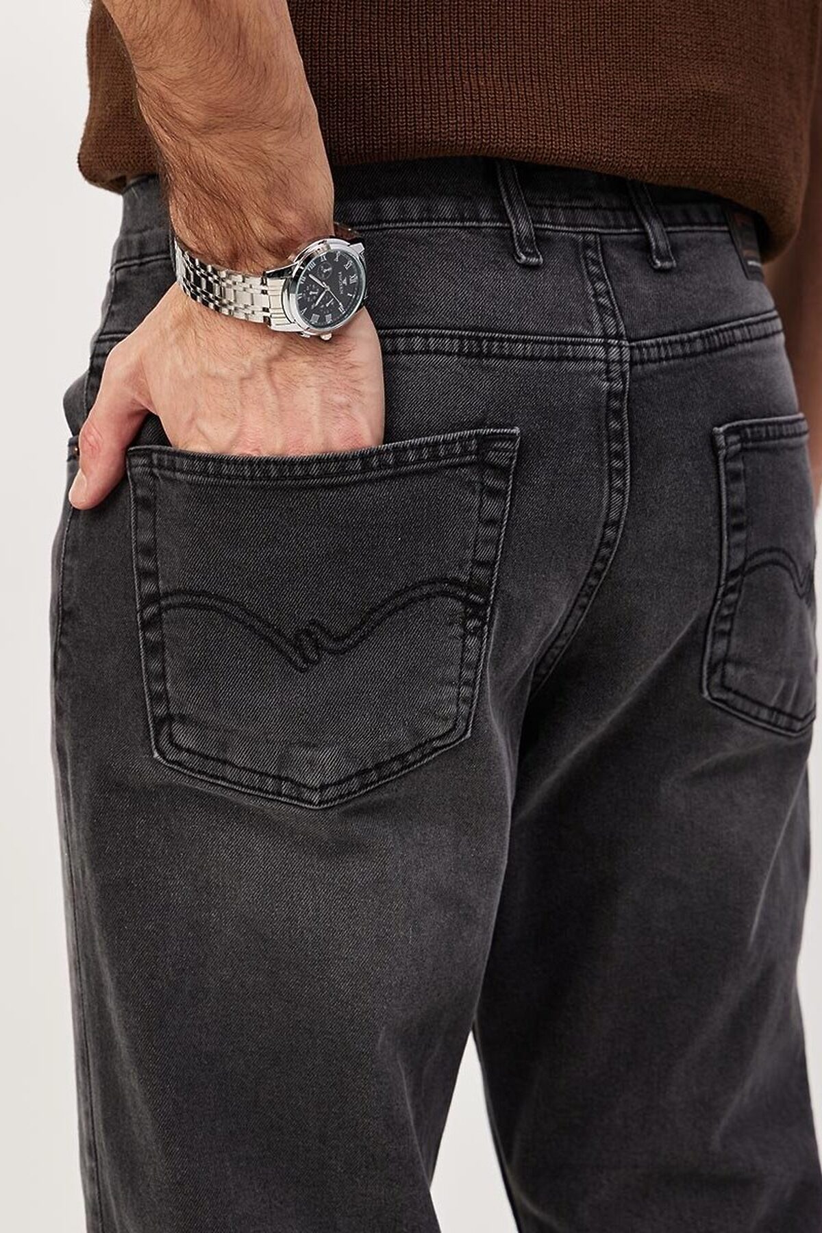 Мужские классические джинсы с пятью карманами. Посадка Comfort fit (свободные по бедру), широкие в колене и по низу, высокая талия. Застежка на молнии. Выполнены из ткани denim, цвет ткани Black/Black (лицевая и изнаночная стороны ткани черные). Классическая темная стирка с потёртостями и спереди и сзади. Параметры указаны для размера 32. Длина внутреннего шва для роста 32 - 81см. , для роста 34 - 86см. , , для роста 36 - 91см. .