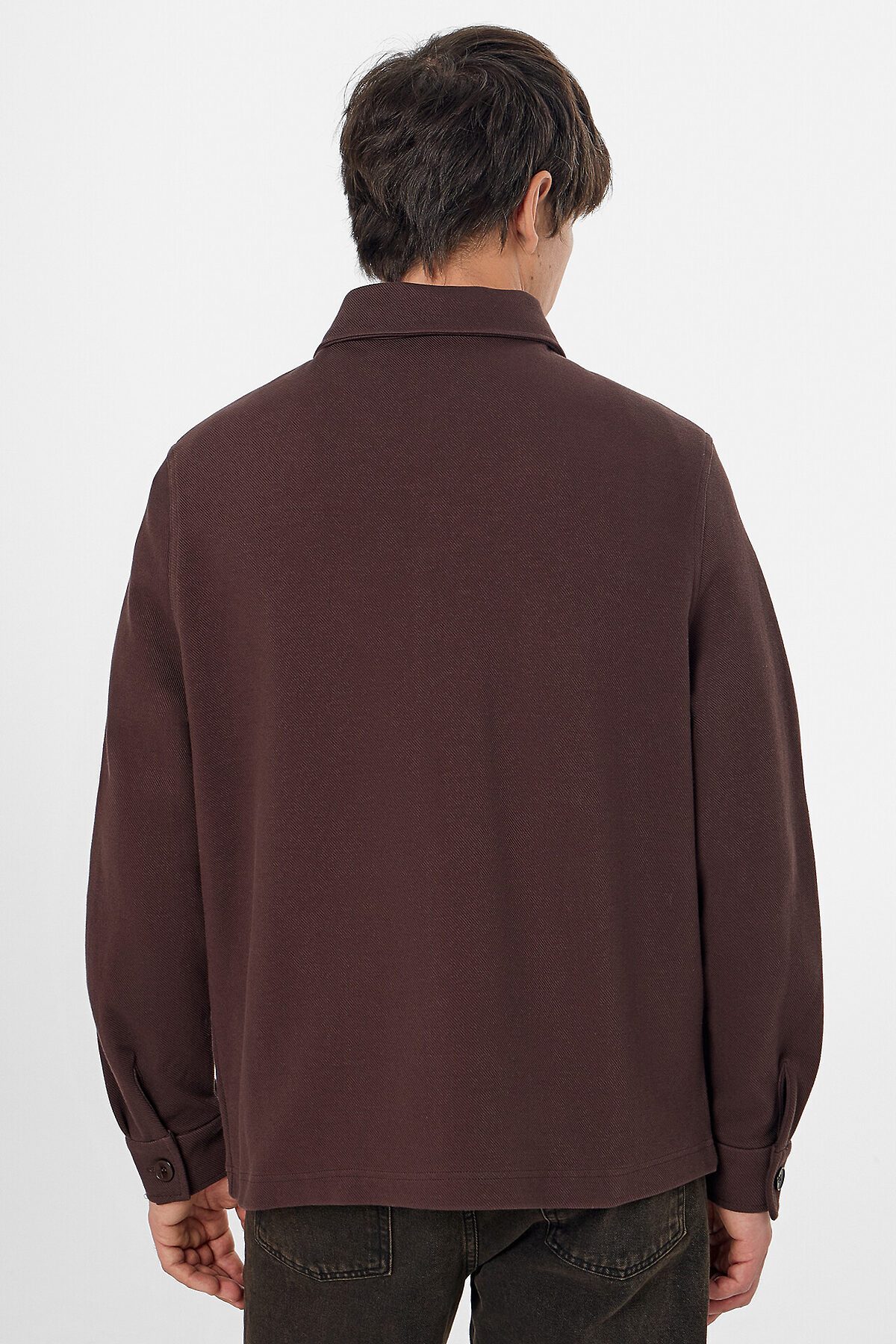 Жакет мужской из трикотажного полотна интерлок (диагональ). Жакет свободного прямого силуэта. Вырез горловины круглый с рубашечным воротником. Центральная застежка на пуговицы (d=20 мм). На деталях переда накладные карманы с клапанами, с застежкой на пуговицы. Линия плеча слегка спущена. Рукава втачные длинные. Манжеты отрезные с застежкой на пуговицу.Отделочные строчки по окату рукава, плечевым швам. Нижний срез жакета обработан швом вподгибку.