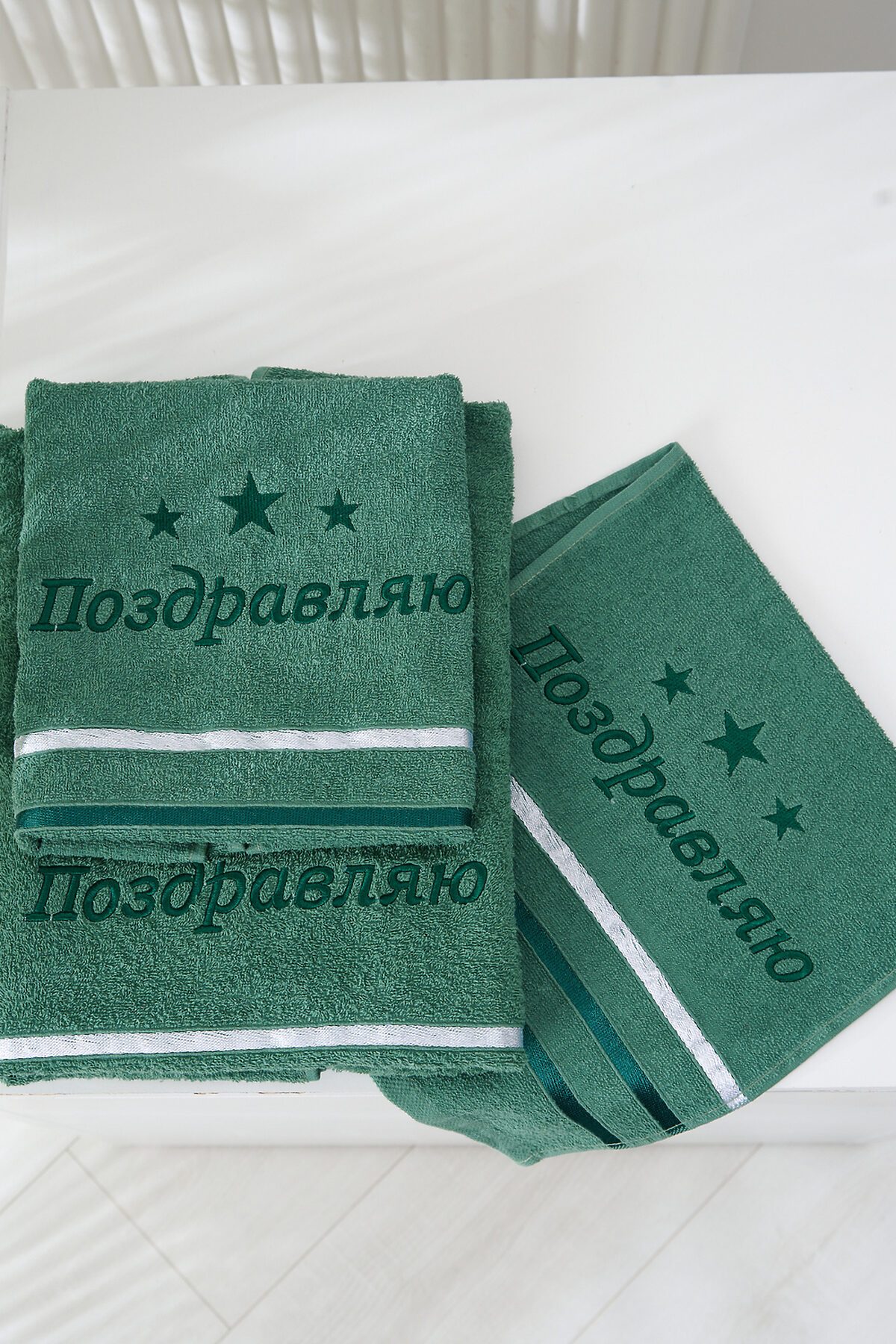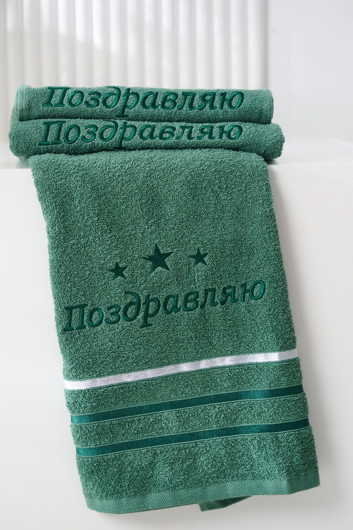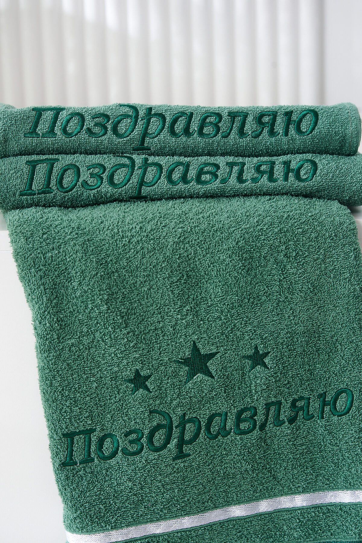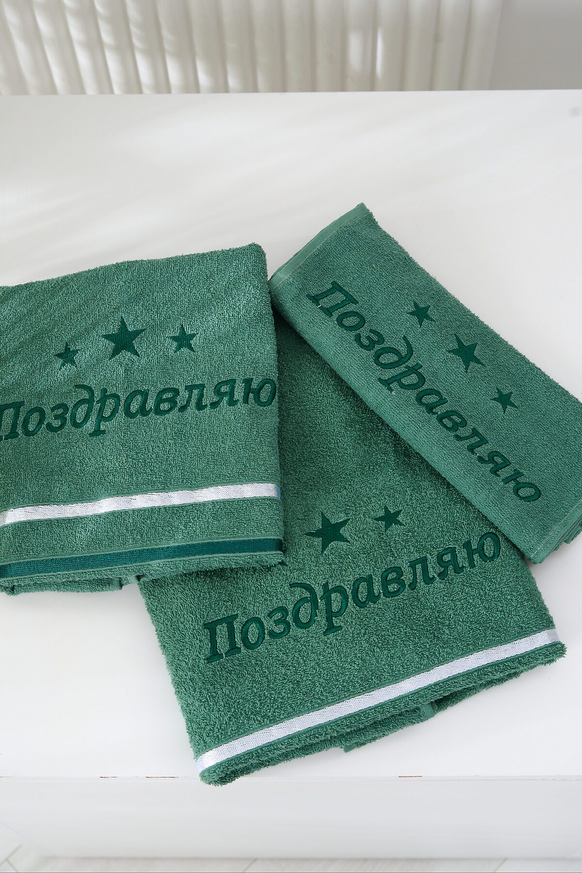 -Подарочное махровое полотенце Поздравляю отличный способ выразить внимание и заботу к близким людям! Натуральный хлопок делает полотенце невероятно мягким и приятным на ощупь, а стильная зелёная расцветка с вышивкой и звездочками добавляет особую атмосферу праздника. Практичный размер прекрасно подойдёт для ежедневного использования дома, в бане или на тренировках. Яркая и лаконичная надпись Поздравляю идеально подойдёт для вручения в качестве подарка к любому торжеству дню рождения, юбилею или профессиональному празднику.