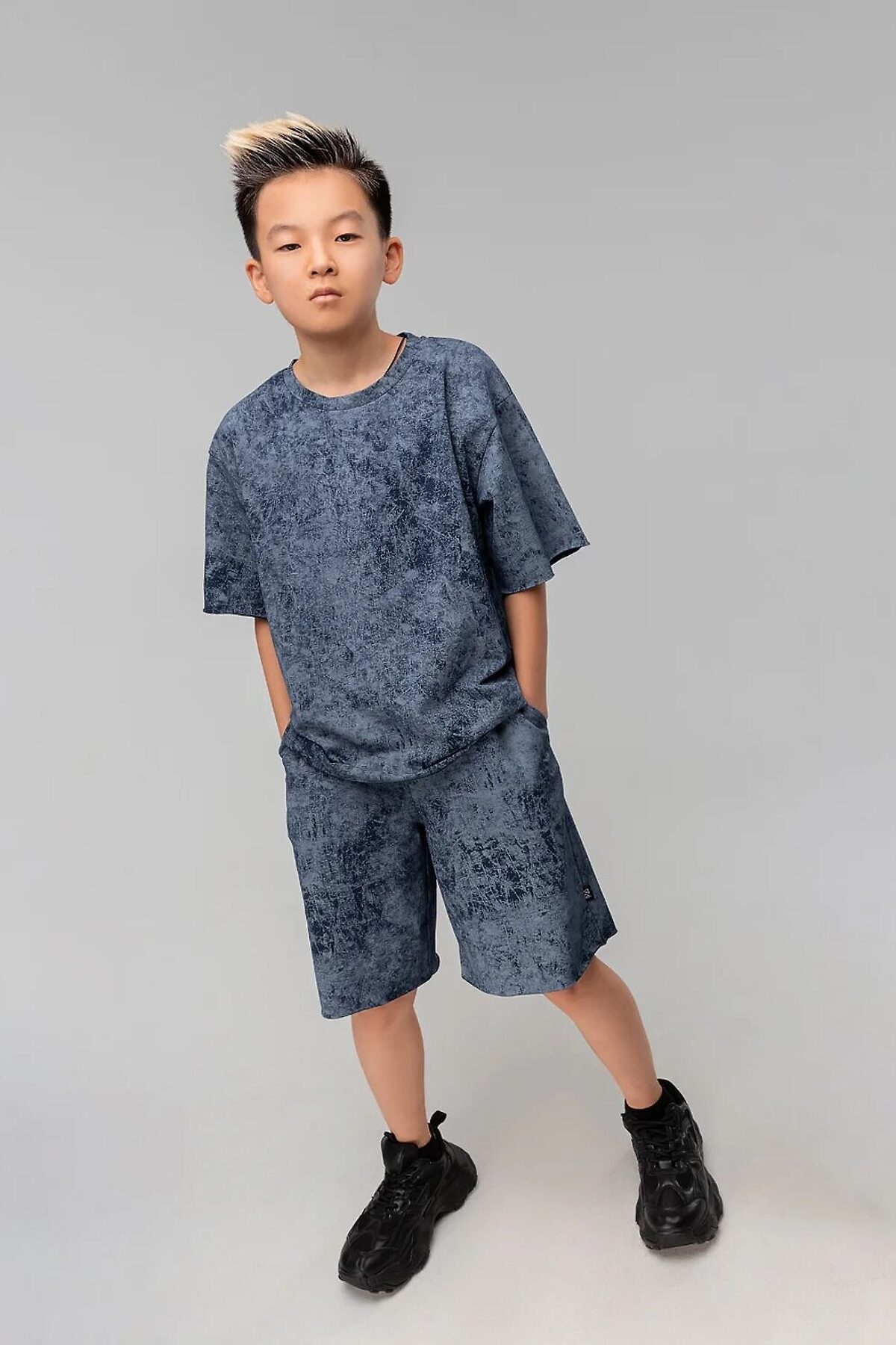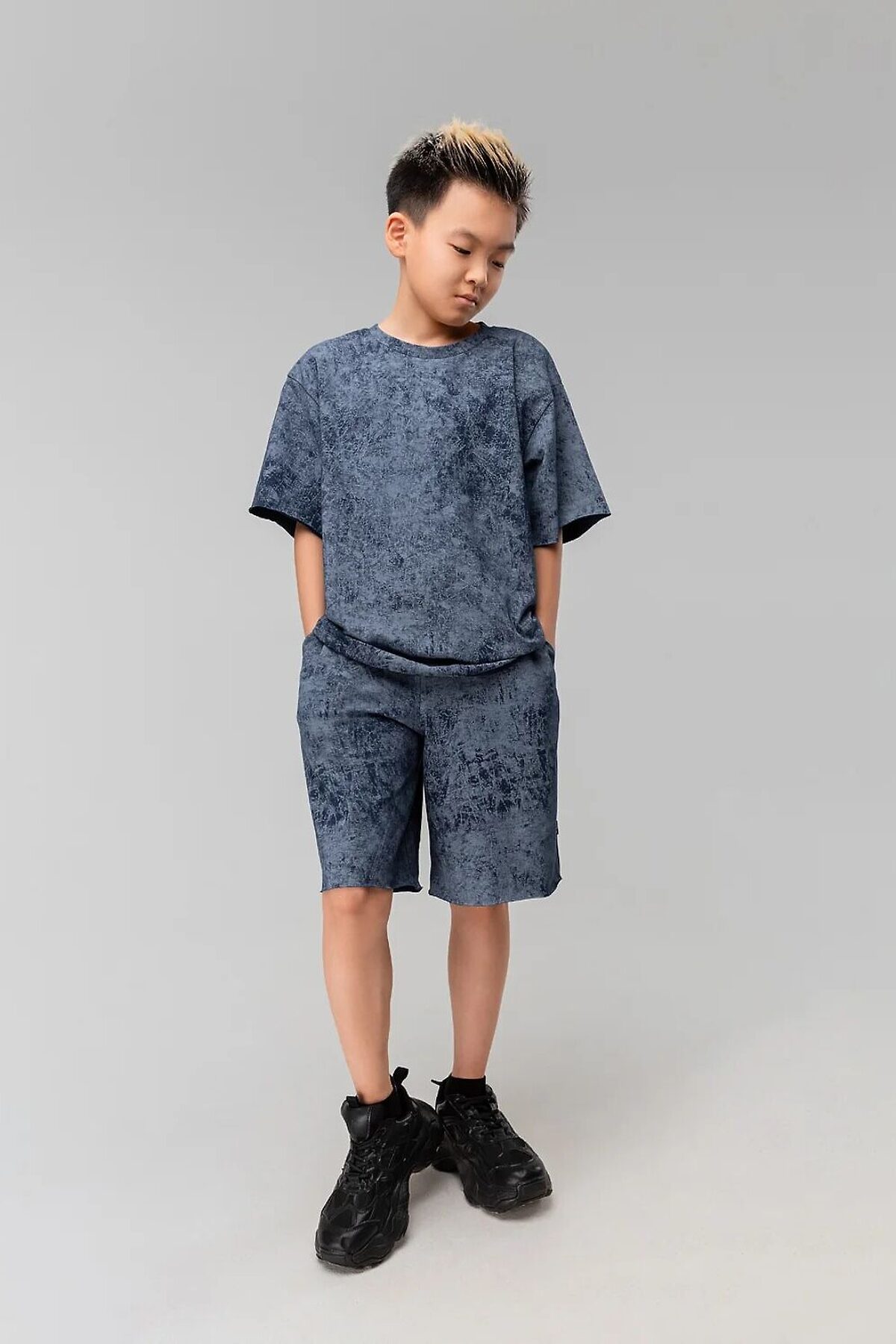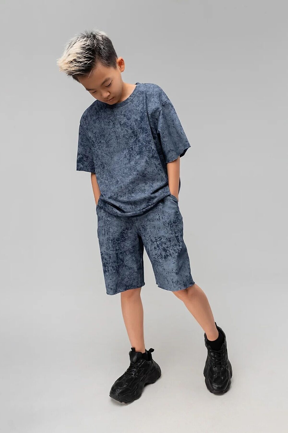 Костюм для детей школьного возраста. Футболка свободного силуэта с втачным коротким рукавом. Горловина футболки округлой формы. Низ изделия и низ рукава не обработаны. Шорты прямые, свободные на притачном поясе с внутренней резинкой, с боковыми карманами отрезной бочок. Шорты по низу изделия с необработанным краем.