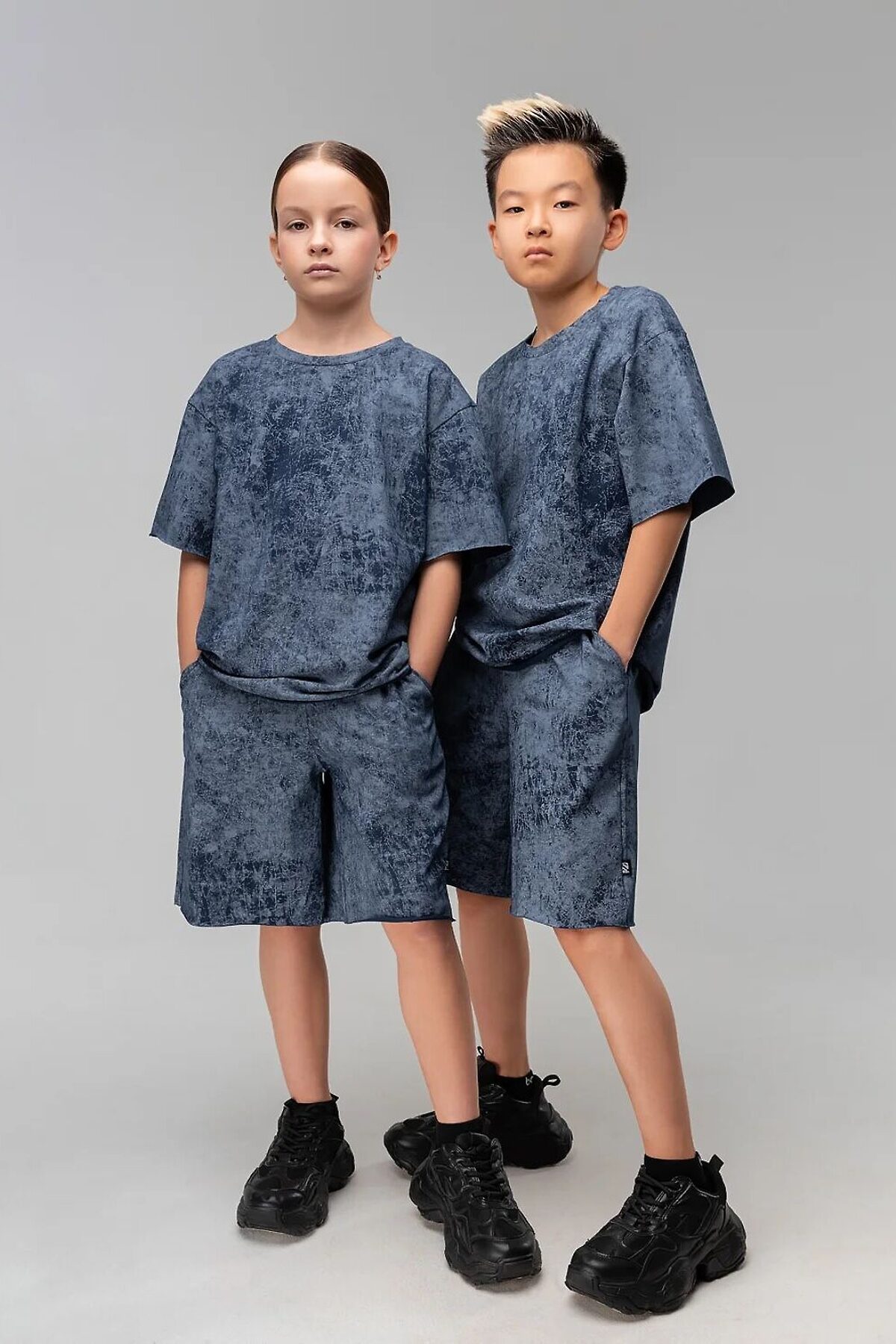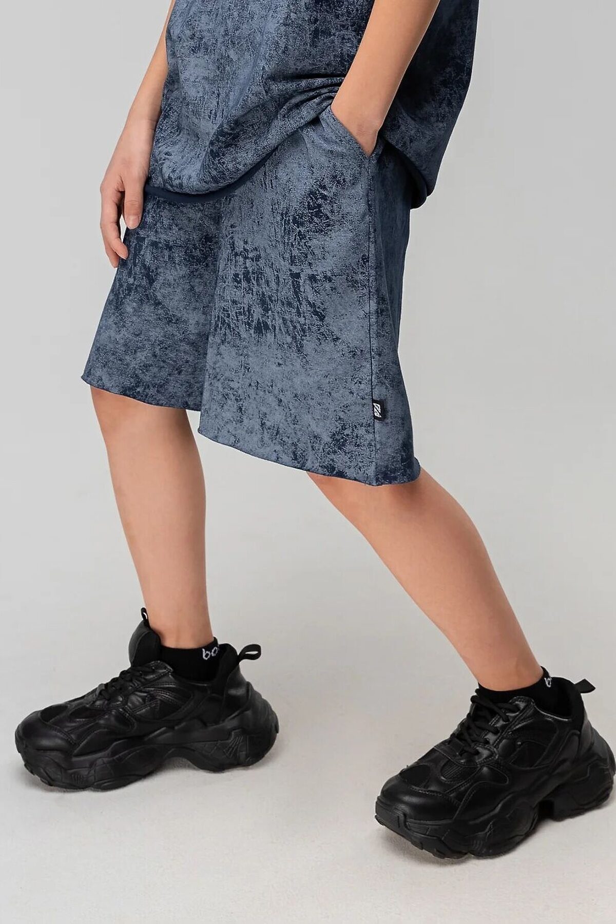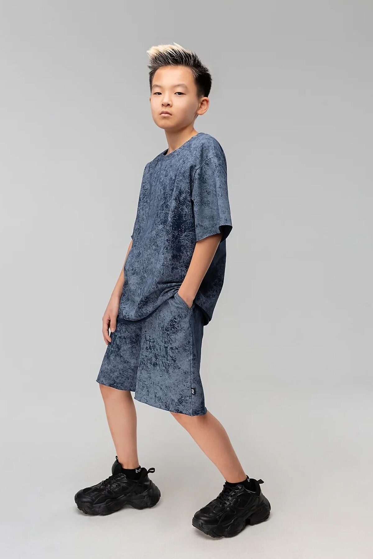 Костюм для детей школьного возраста. Футболка свободного силуэта с втачным коротким рукавом. Горловина футболки округлой формы. Низ изделия и низ рукава не обработаны. Шорты прямые, свободные на притачном поясе с внутренней резинкой, с боковыми карманами отрезной бочок. Шорты по низу изделия с необработанным краем.
