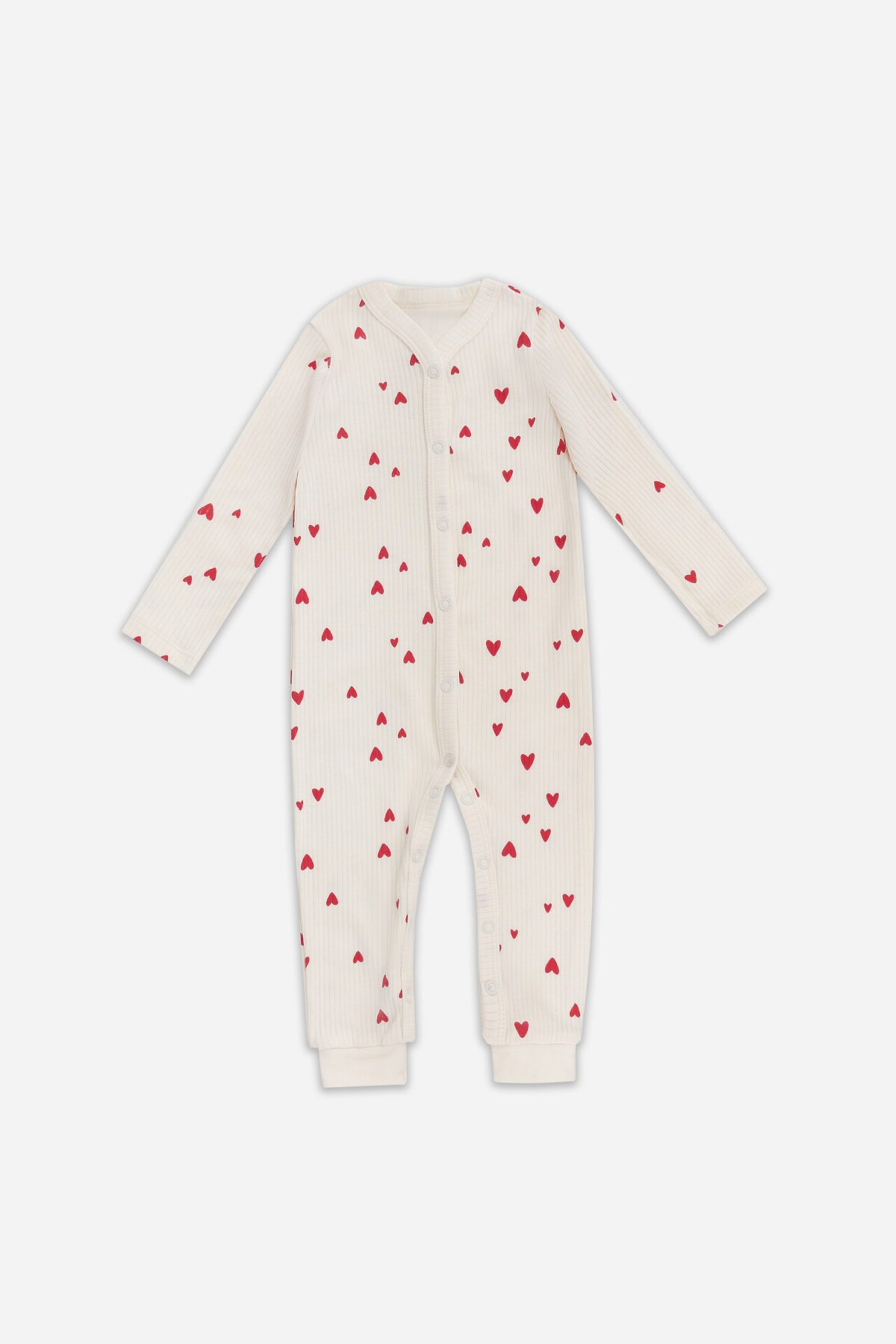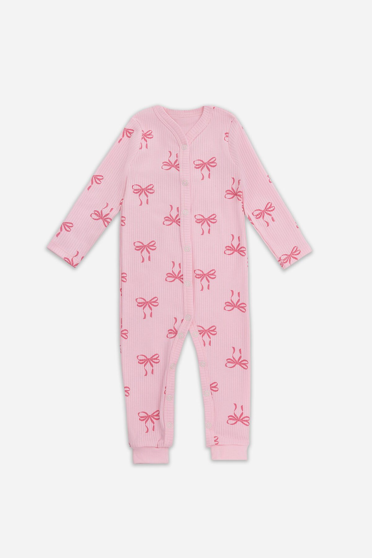 Комбинезон выполнен из из интерлока в рубчик. Спинка цельнокроенная. Перед с застежкой по всей длине и по обеим ножкам. Застежка на книпперах 9 мм- 14 шт. Рукава длинные, втачные, одношовные. Низ рукавов обработан на 2х игольной плоскошовной машине швом в подгибку. Срезы горловины и бортов обработаны обтачками из основного полотна. По низу ножек притачные манжеты из из трикотажной рибаны 1*1 R-59, R11-049.01.230, 97% хлопок; 3% эластан, 230 гр, 165 см