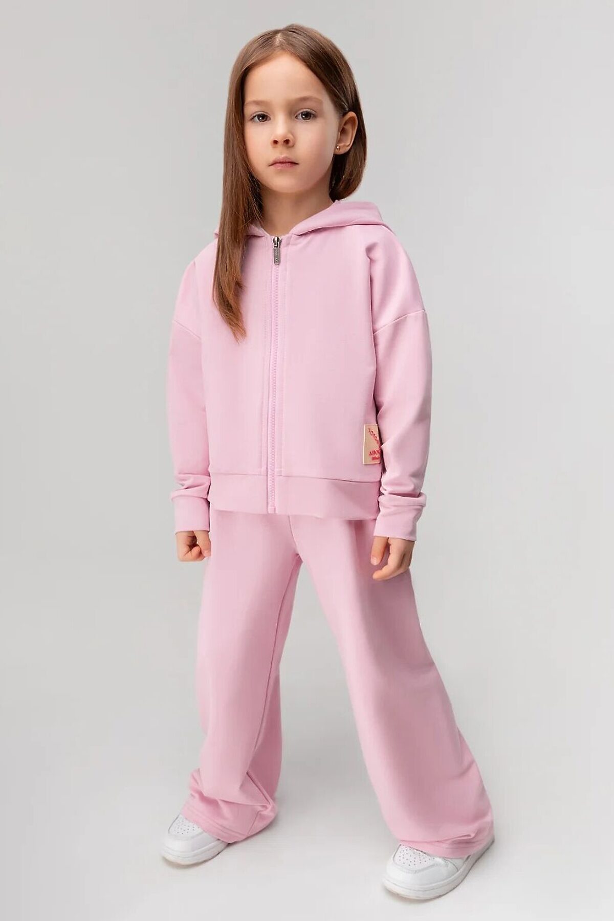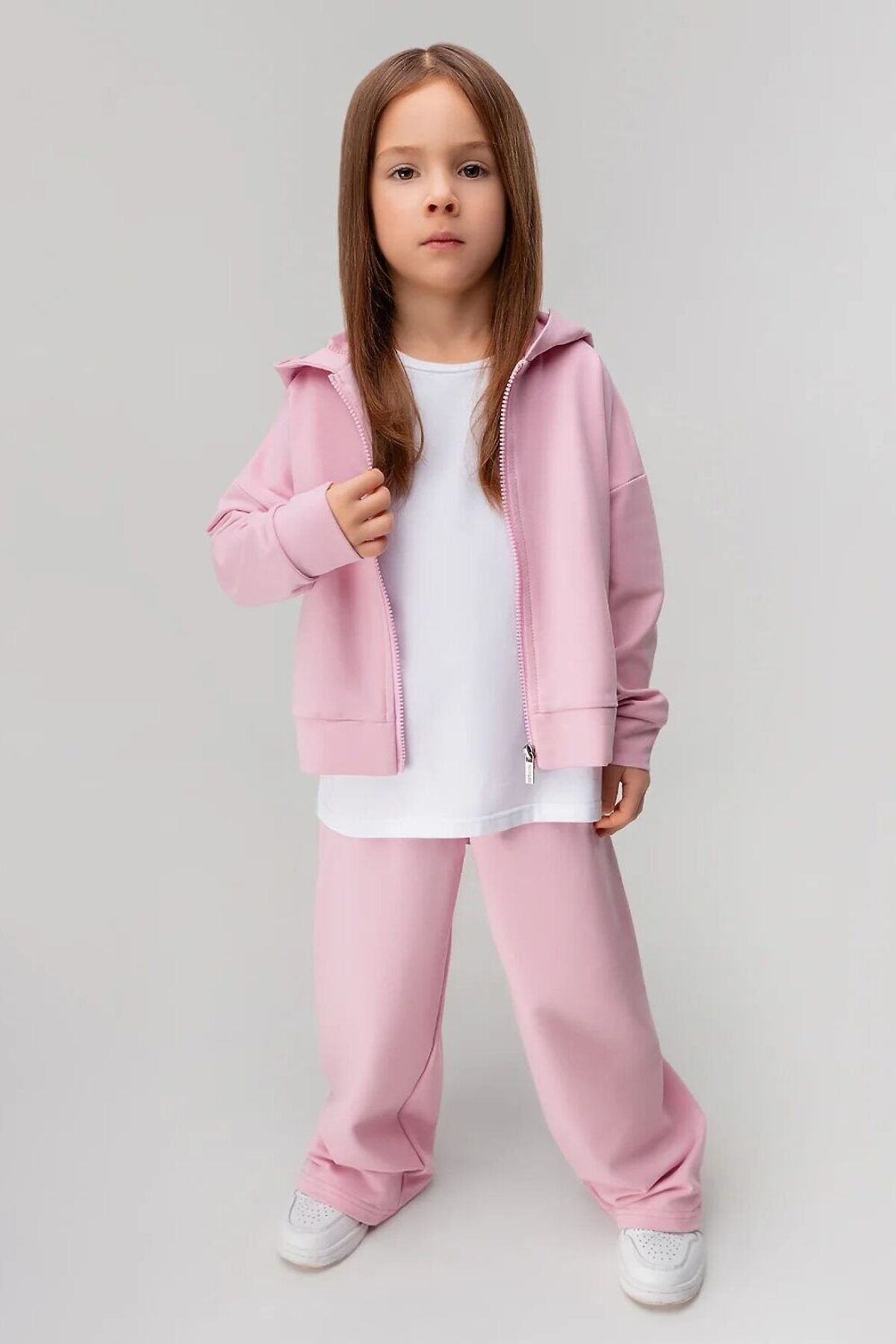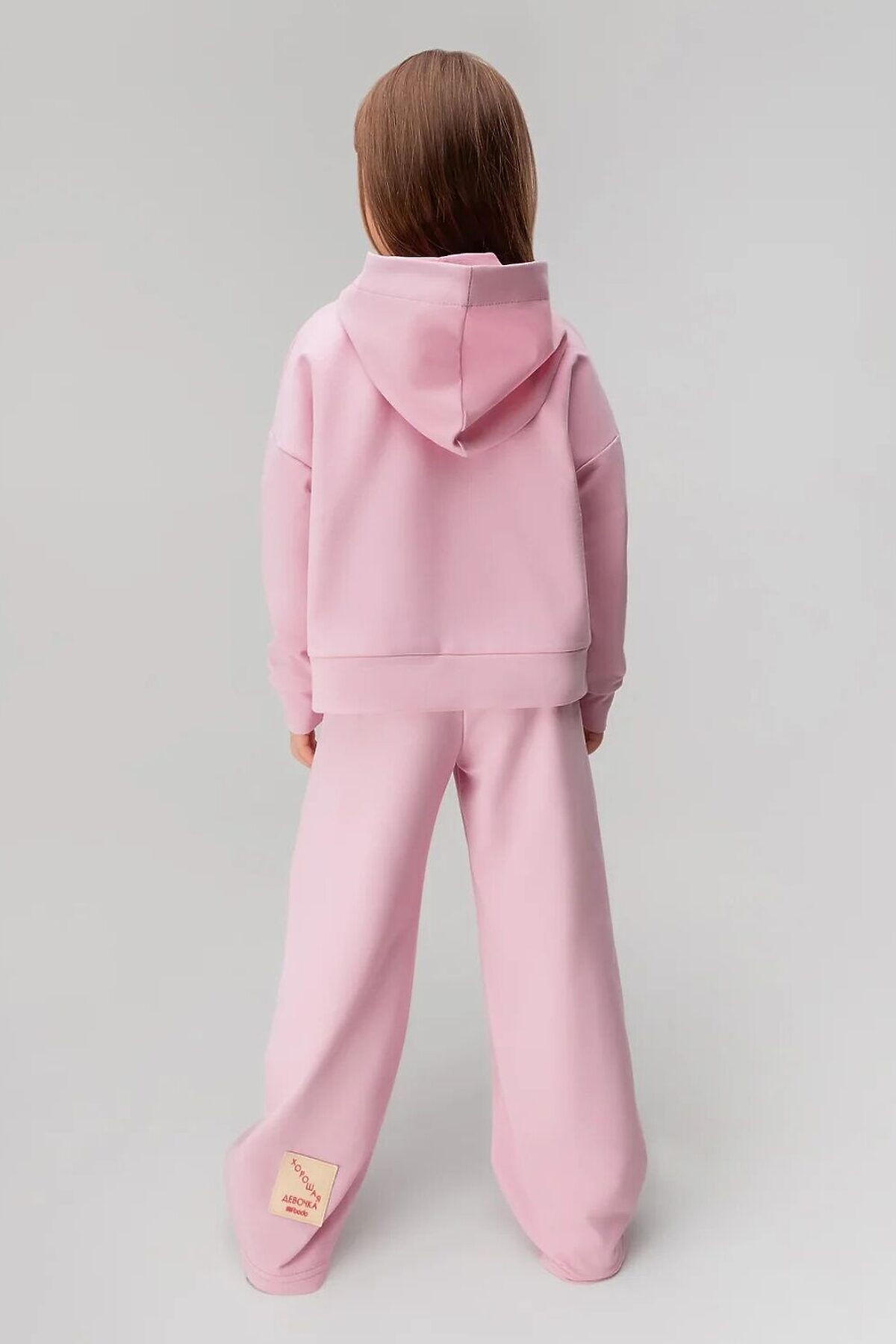 Костюм для детей дошкольного возраста. Толстовка укороченная, прямого силуэта, с центральной бортовой застёжкой на тесьму молния, на притачном поясе по низу изделия, со спущенным плечом, с втачными рукавами с притачной манжетой, с втачным капюшоном. Брюки прямые свободные с цельнокроеным поясом с внутренней резинкой. Низ ровный.