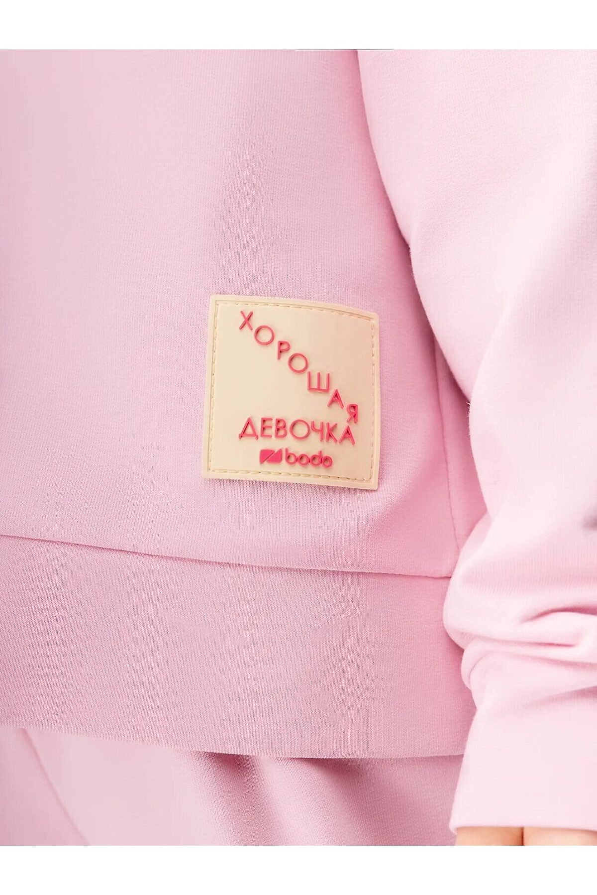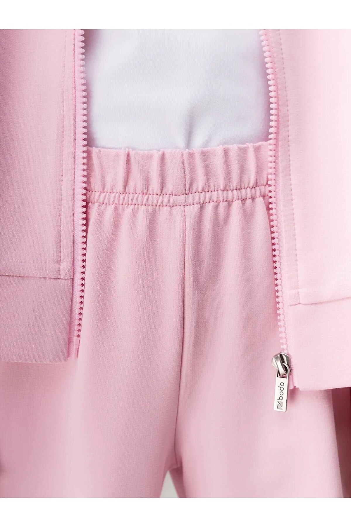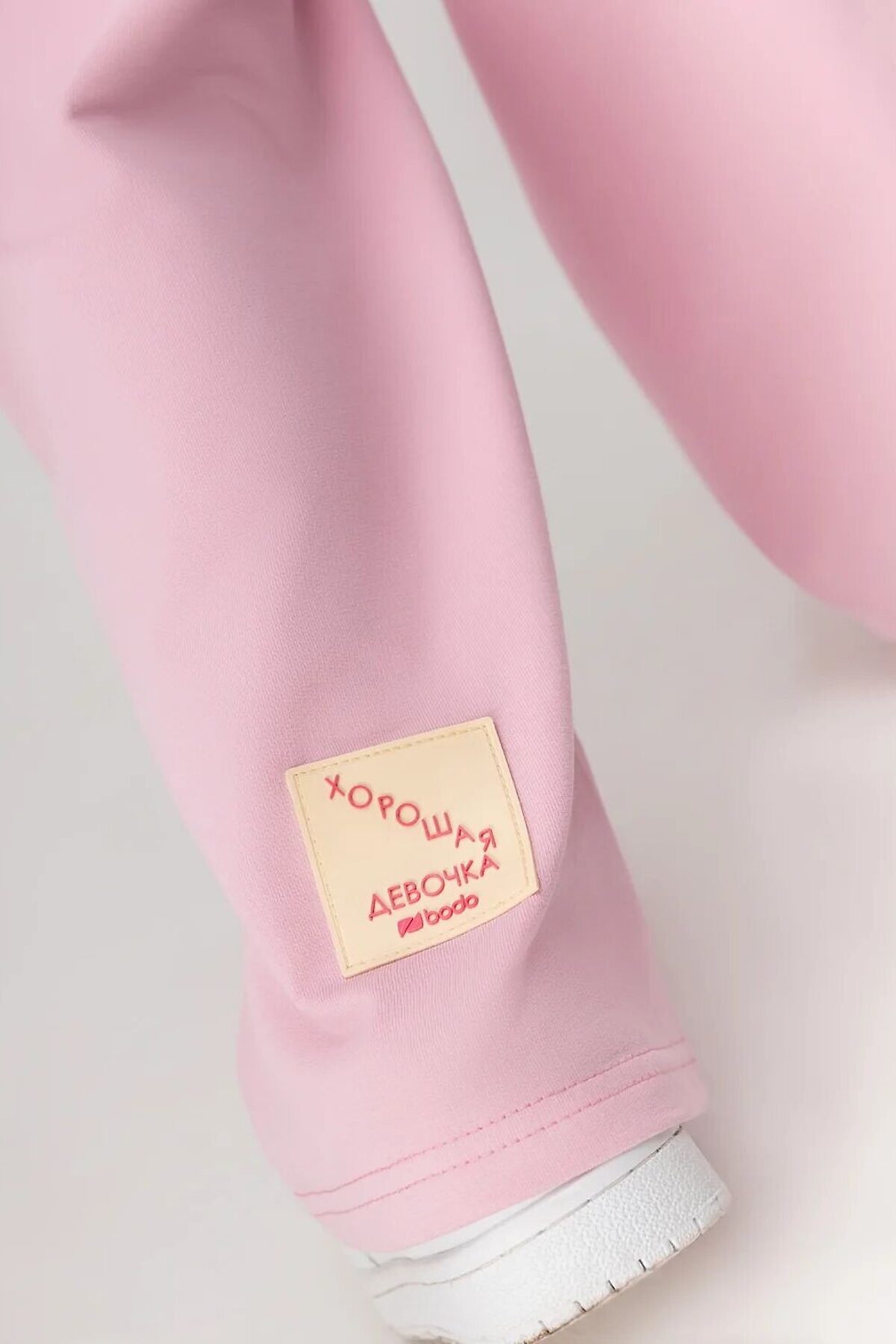 Костюм для детей дошкольного возраста. Толстовка укороченная, прямого силуэта, с центральной бортовой застёжкой на тесьму молния, на притачном поясе по низу изделия, со спущенным плечом, с втачными рукавами с притачной манжетой, с втачным капюшоном. Брюки прямые свободные с цельнокроеным поясом с внутренней резинкой. Низ ровный.