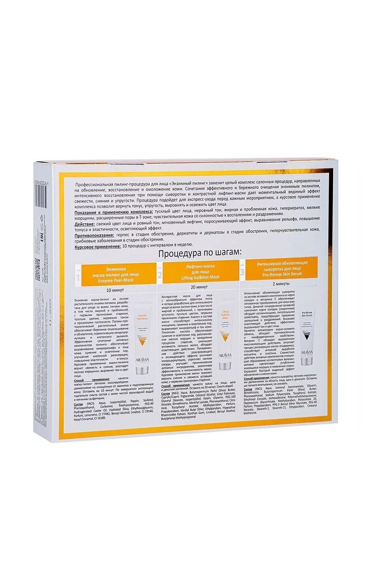 Состав набора: Энзимная маска-пилинг Enzyme Peel-Mask, 100 мл; Лифтинг-маска для лица Ice&Hot Mask, 100 мл; Интенсивная обновляющая сыворотка для лица Pro-Renew Skin Serum, 50 мл. Действие: очищающее; омолаживающее; поросуживающее; тонизирующее; лифтинговое; осветляющее. Профессиональная пилинг-процедура для лица «Энзимный пилинг» заменит целый комплекс салонных процедур, направленных на обновление, восстановление и омоложение кожи. Сочетание эффективного и бережного очищения энзимным пилингом, интенсивного восстановления при помощи сыворотки и контрастной лифтинг-маски дает моментальный видимый эффект свежести, сияния и упругости. Процедура подойдет для экспресс-ухода перед важным мероприятием, а курсовое применение комплекса позволит вернуть тонус, упругость, выровнять и освежить цвет лица. Курс процедур: плановый — 10 сеансов (еженедельно) В одном наборе — до 10 процедур. Назначение: интенсивная косметологическая процедура при проблемах: тусклый цвет лица, неровный тон, жирная и проблемная кожа, гиперкератоз, мелкие морщины, расширенные поры в Т-зоне, чувствительная кожа со склонностью к воспалениям и раздражениям. Рекомендации для ухода: Профессиональный уход: интенсивная косметологическая процедура при проблемах: тусклый цвет лица, неровный тон, жирная и проблемная кожа, гиперкератоз, мелкие морщины, расширенные поры в Т-зоне, чувствительная кожа со склонностью к воспалениям и раздражениям. Курсовое применение: 10 процедур с интервалом в неделю. Домашний уход: по назначению косметолога, курсом 10 процедур, 1 раз в неделю Способ применения: Только для профессионального применения. Рекомендуется пройти обучение. Энзимная маска-пилинг для лица Enzyme Peel-Mask: нанести маску-пилинг легкими массирующими движениями на очищенную от макияжа и подготовленную кожу. Оставить на 10 минут. По завершении экспозиции, тщательно смыть состав с кожи чистой прохладной водой и мягкими салфетками. Лифтинг-маска для лица Ice Hot Mask: нанести маску на лицо, шею и декольте кисточкой. Оставить на 20 минут. Смыть водой. Интенсивная обновляющая сыворотка для лица Pro-Renew Skin Serum: нанести сыворотку легкими массажными движениями на область лица, шеи и декольте. Оставить до полного впитывания, не смывать. Состав: Энзимная маска-пилинг Enzyme Peel-Mask Биоактивный состав: папаин, сорбитол, cкрабирующие частицы. Состав продукта (INCI): Aqua, Isopentyldiol, Papain, Sorbitol, Phenoxyethanol, Carbomer, Triethanolamine, PEG-40 Hydrogenated Castor Oil, Hydrated Silica, Ethylhexylglycerin, Parfum, Limonene, CI, Benzyl Alcohol, Linalool, CI Hexyl Cinnamal, CI. Лифтинг-маска для лица Ice&Hot Mask Биоактивный состав: каолин, лимонная кислота, масло ши, витамин е, экстракт ягод облепихи. Состав продукта (INCI): Aqua, Butyrospermum Parkii (Shea) Butter, Caprylic/Capric Triglyceride, Cetearyl Alcohol, Cetyl Palmitate, Glyceryl Stearate, Isopentyldiol, Kaolin, Glycerin, PEG-100 Stearate, Dimethicone, Menthyl Lactate, Phenoxyethanol, Citric Acid,