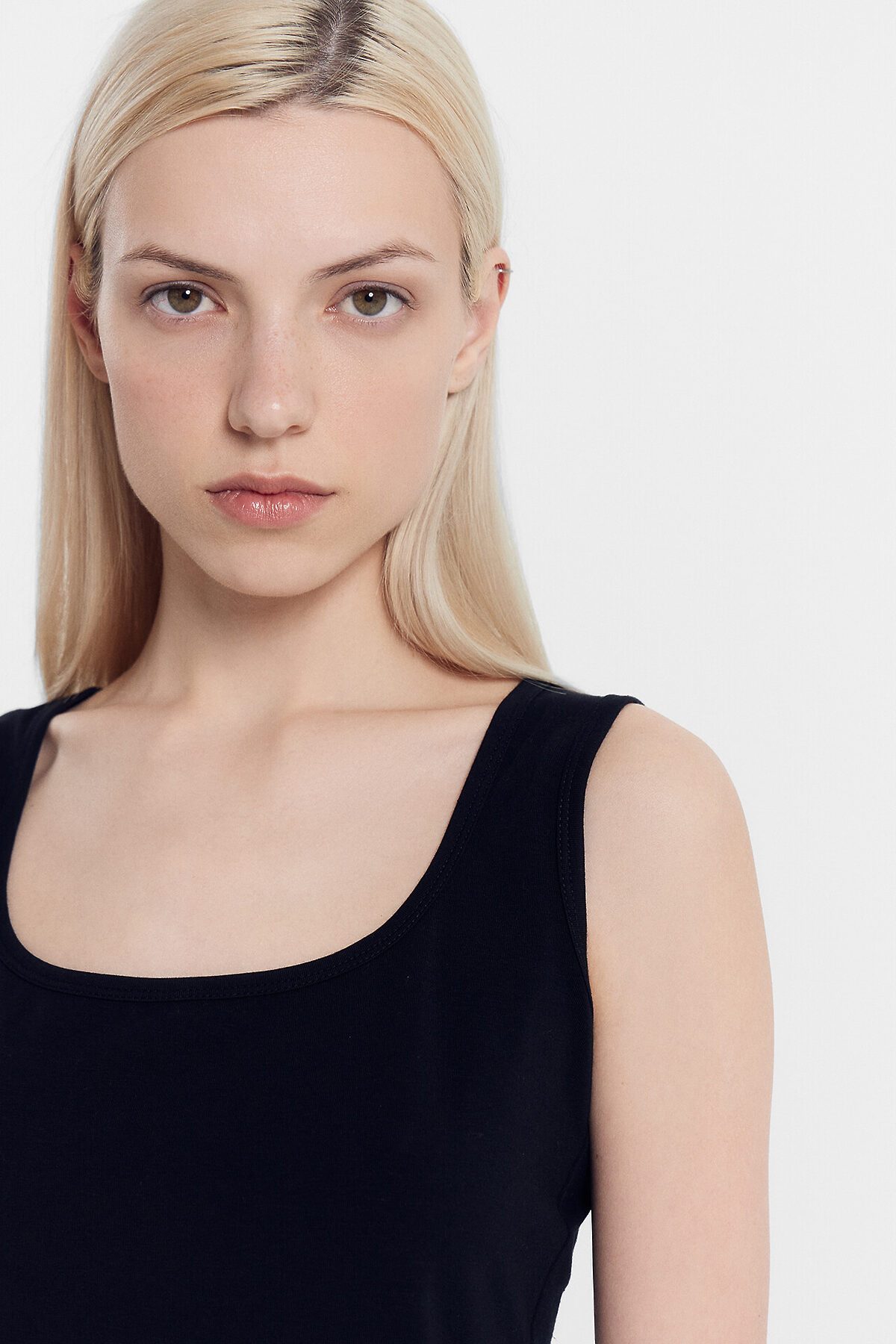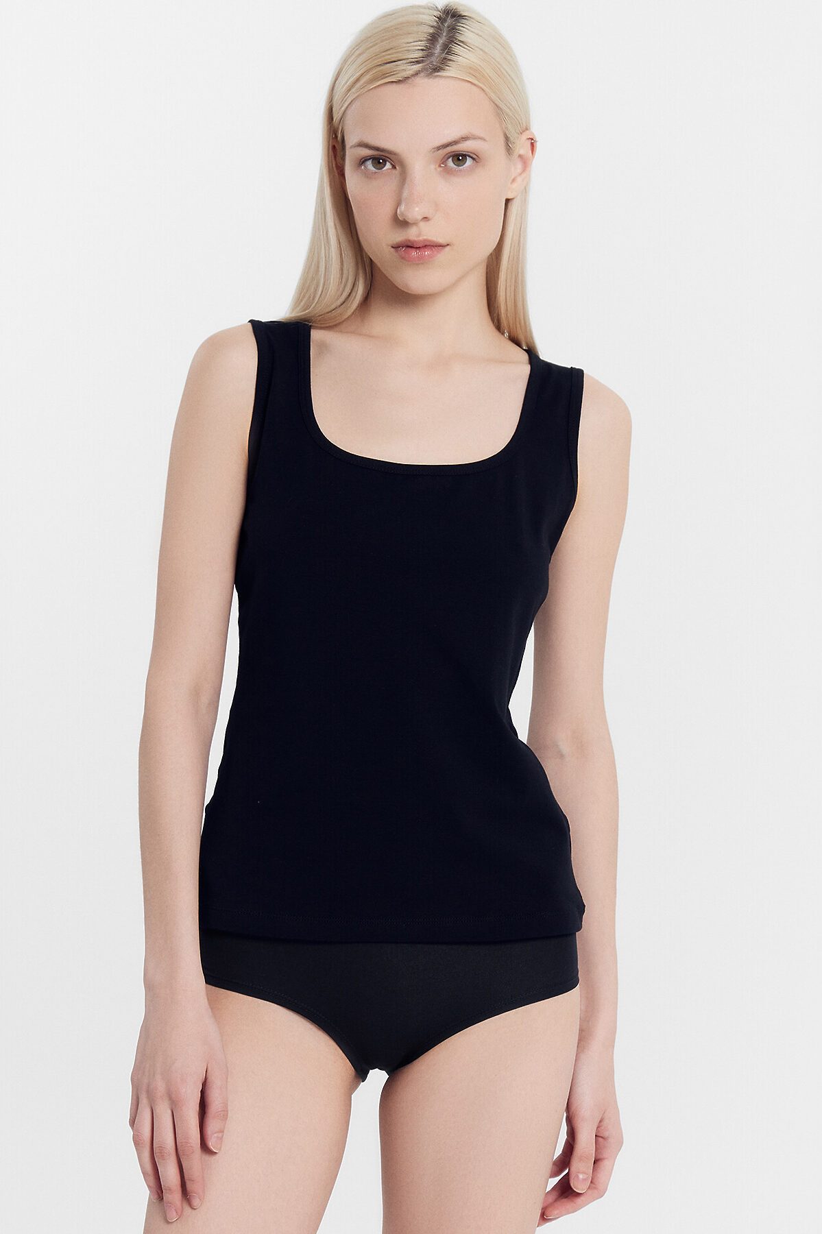 Облегающая женская майка длиной до середины бедер с круглой горловиной. Модель из эластичного хлопкового трикотажа. Обязательный элемент любого гардероба нижнего белья.