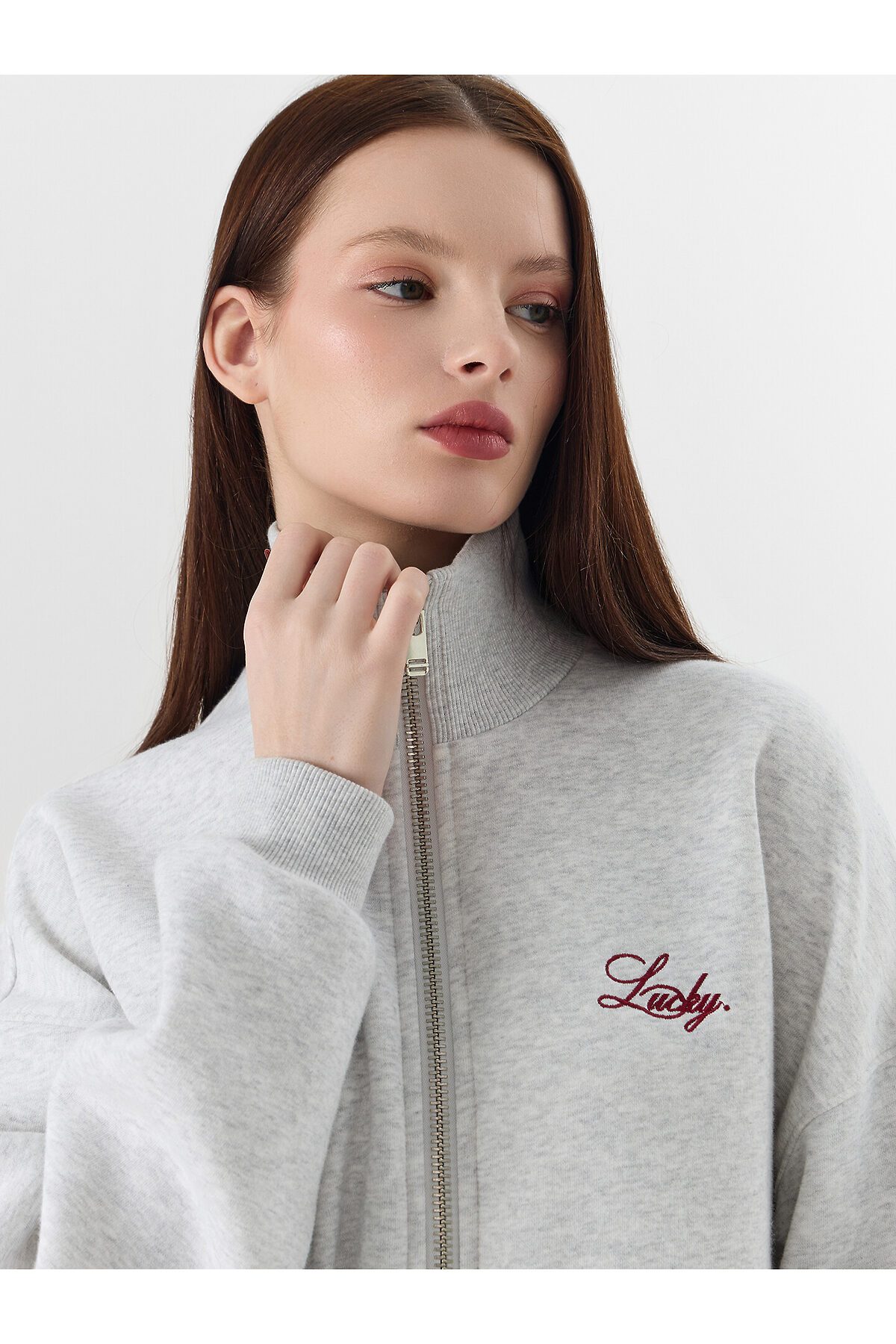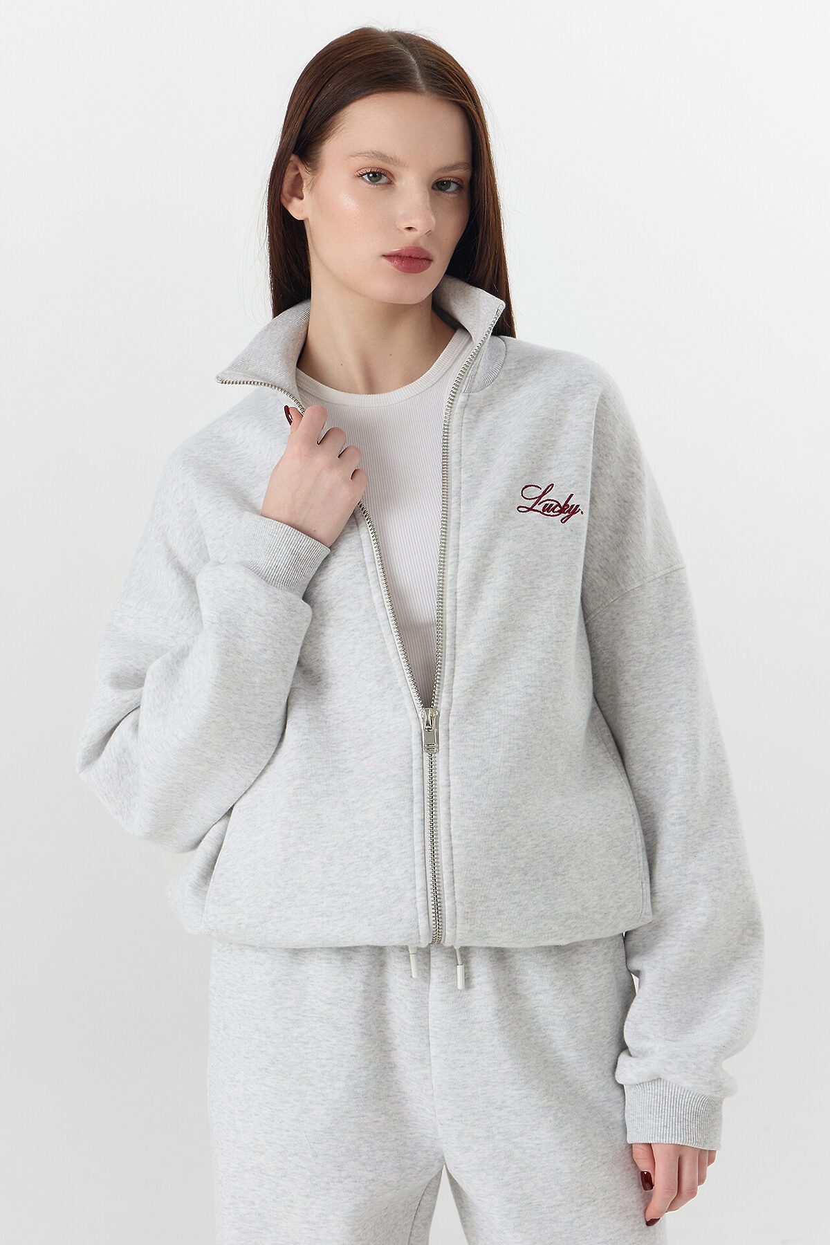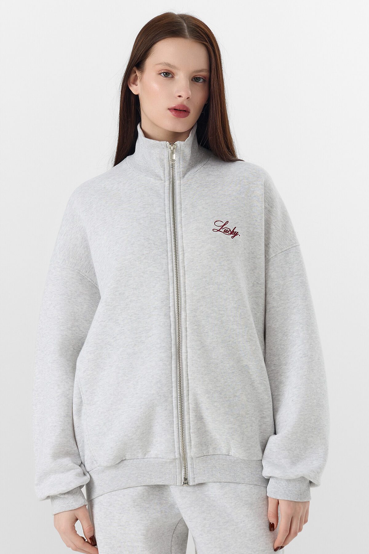 Толстовка свободного силуэта (оверсайз), с воротником- стойкой из рибаны. Горловина округлой формы. Плечо спущено, рукав втачной длинный. Боковые швы перенесены вперед, в них находятся карманы с подкладкой из кулирки. По центру изделия застежка из металлической молнии (StandartMetal №5). По низу рукава отрезная манжета из рибаны. Пояс отрезной из рибаны. Навесной ярлык БАЗА ПРЕМИУМ по заданию