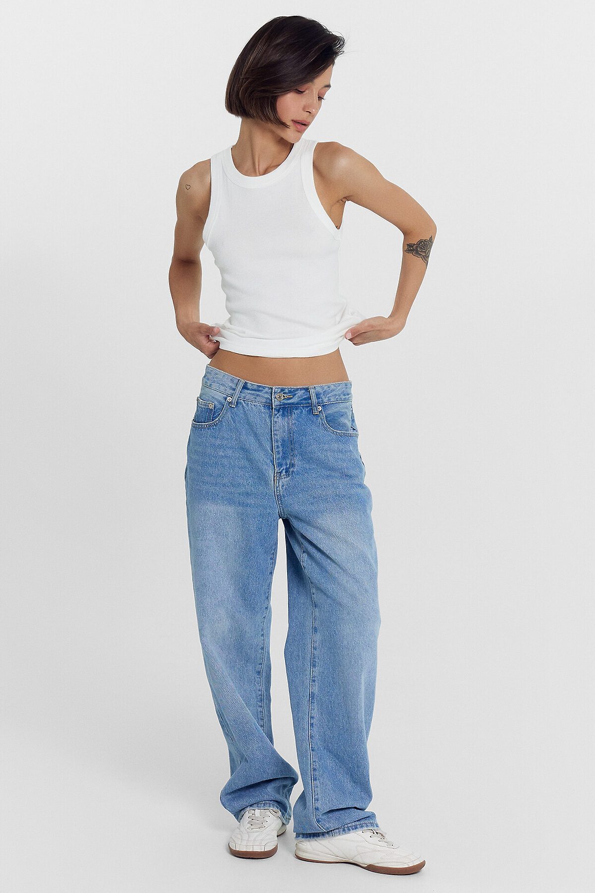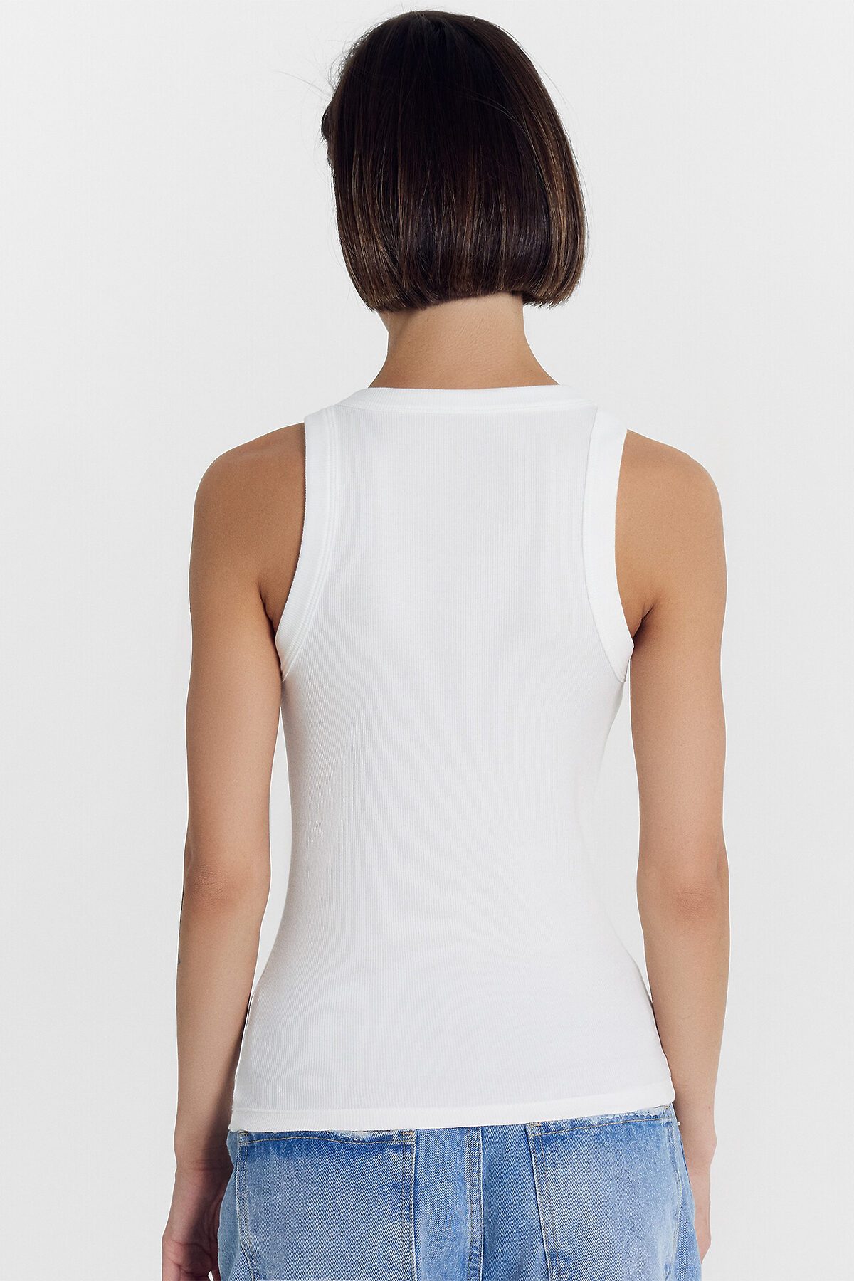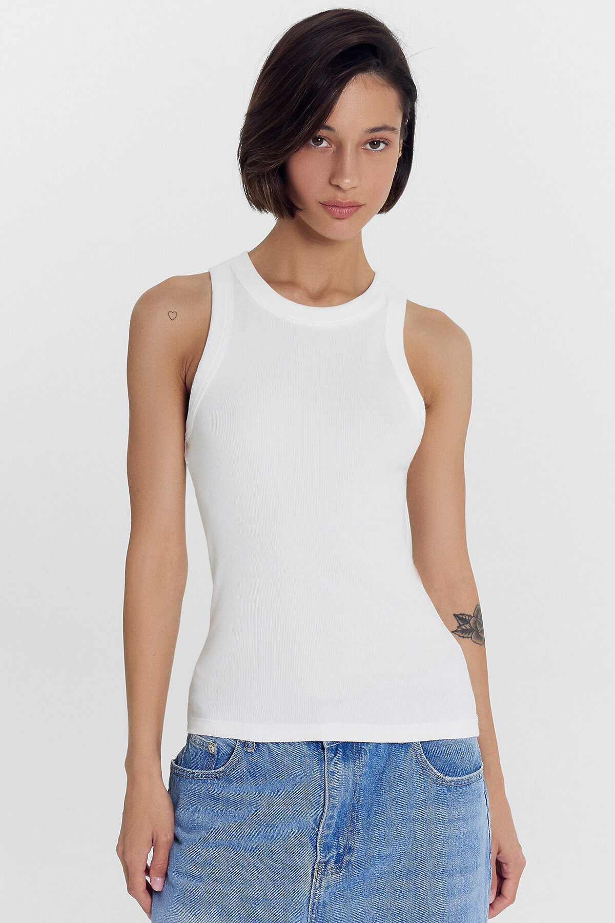 Молочный женский топ из эластичной рибаны станет идеальной основой для любого образа. Модель облегающего силуэта мягко подчеркивает фигуру, а длина ниже уровня талии позволяет легко комбинировать его с юбками, брюками и джинсами высокой посадки. Узкие бретели и углубленная пройма обеспечивают комфорт и свободу движений, делая топ особенно удобным для активного дня. Плотно прилегающая круглая горловина не деформируется при носке. Горловина и проймы аккуратно окантованы широкой бейкой из основного материала для дополнительного удобства и сохранения формы.