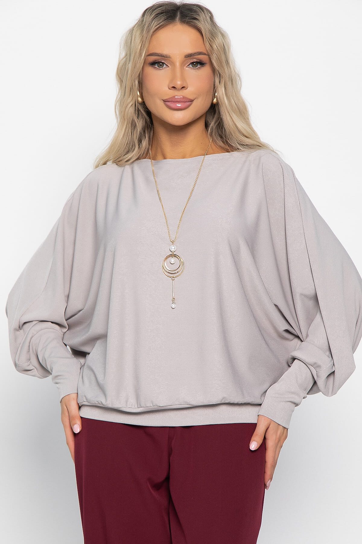 Великолепная трикотажная блуза в серо-бежевом цвете сочетает в себе комфорт и утонченность. Овальный вырез горловины и цельнокроеные рукава «летучая мышь» придают ей уникальный вид. Высокий манжет по низу рукавов добавляет изысканности. Эта блуза отлично сочетается с юбками, брюками и джинсами любого фасона, создавая разнообразные модные образы. В комплекте идет подвеска, которая станет ярким акцентом и подчеркнет вашу индивидуальность.