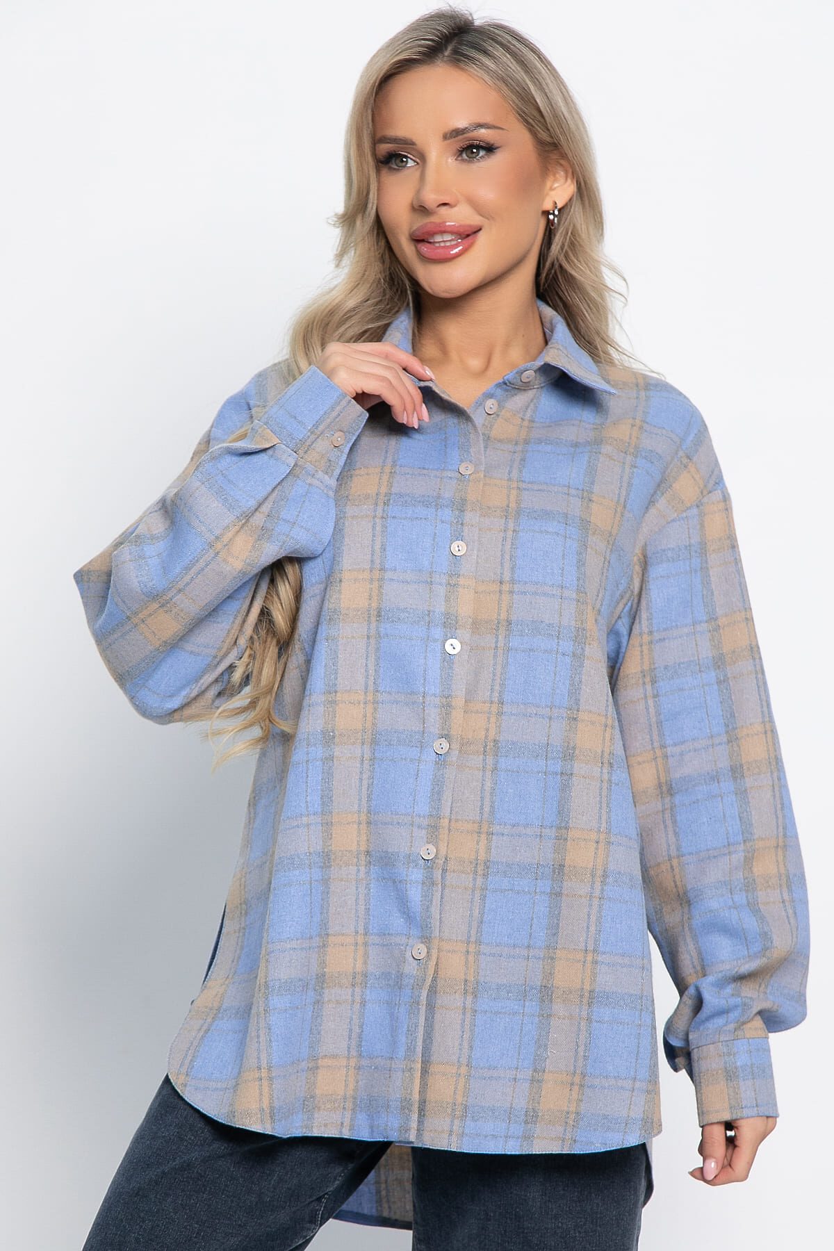 Женская рубашка в клетку бежево-голубого цвета — это яркий и модный элемент повседневного гардероба. Классический принт в клетку никогда не выходит из моды, что делает такую рубашку универсальным выбором. Свободный прямой крой обеспечивает удобство на протяжении всего дня. Особенностью этой рубашки являются высокие разрезы по бокам, которые придают образу динамичность. Комбинируйте её с джинсами или юбкой, чтобы создать уникальный и стильный образ на каждый день!