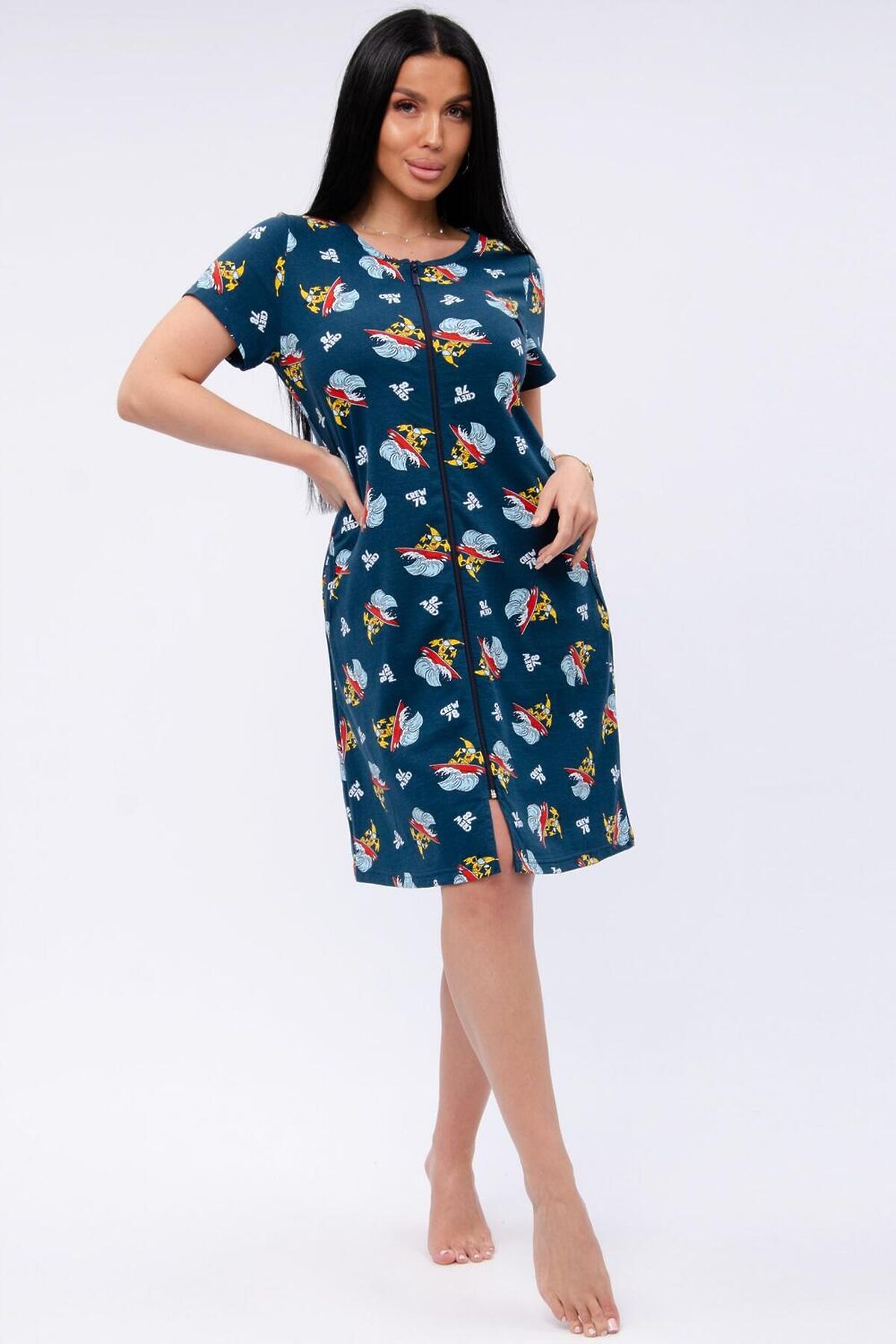 Женский халат на молнии. Рукав короткий. Красивый вырез на полочке. Халат прекрасно подойдет для дома, дачи и отдыха.