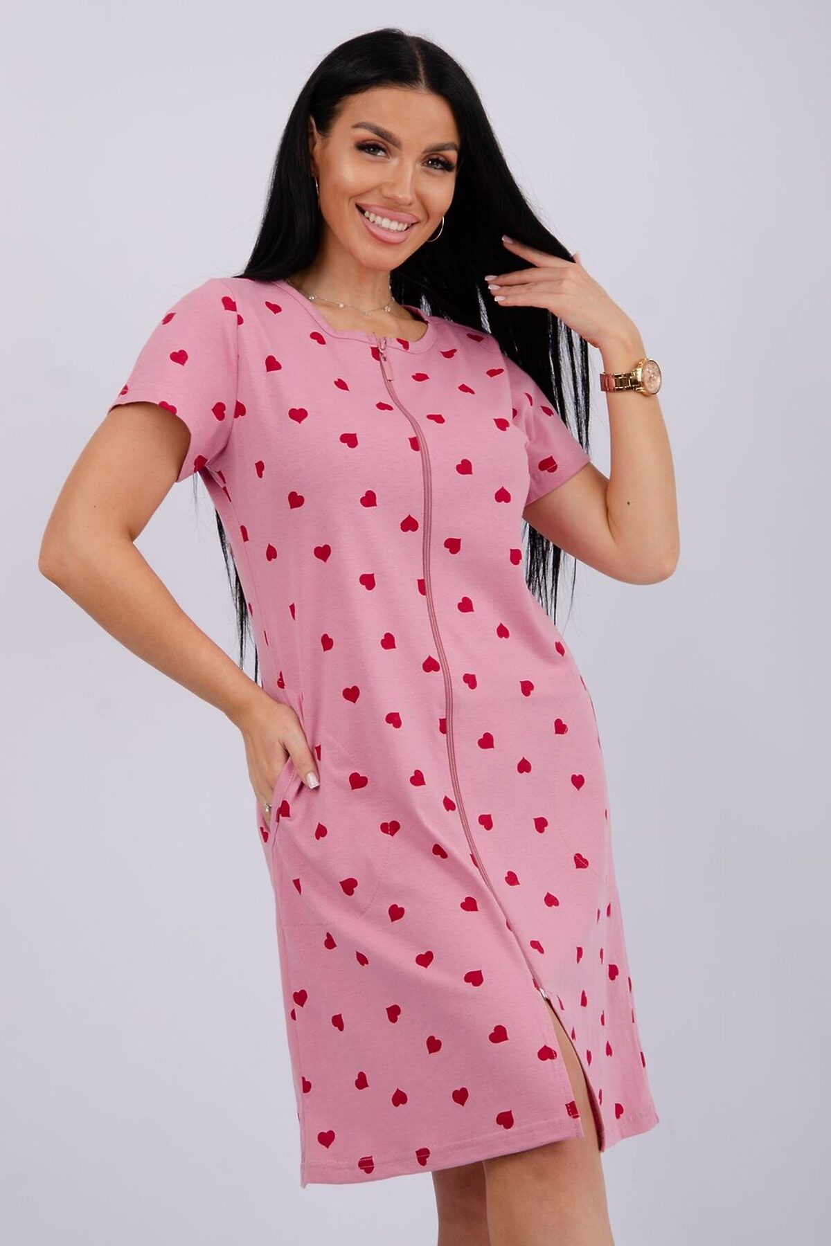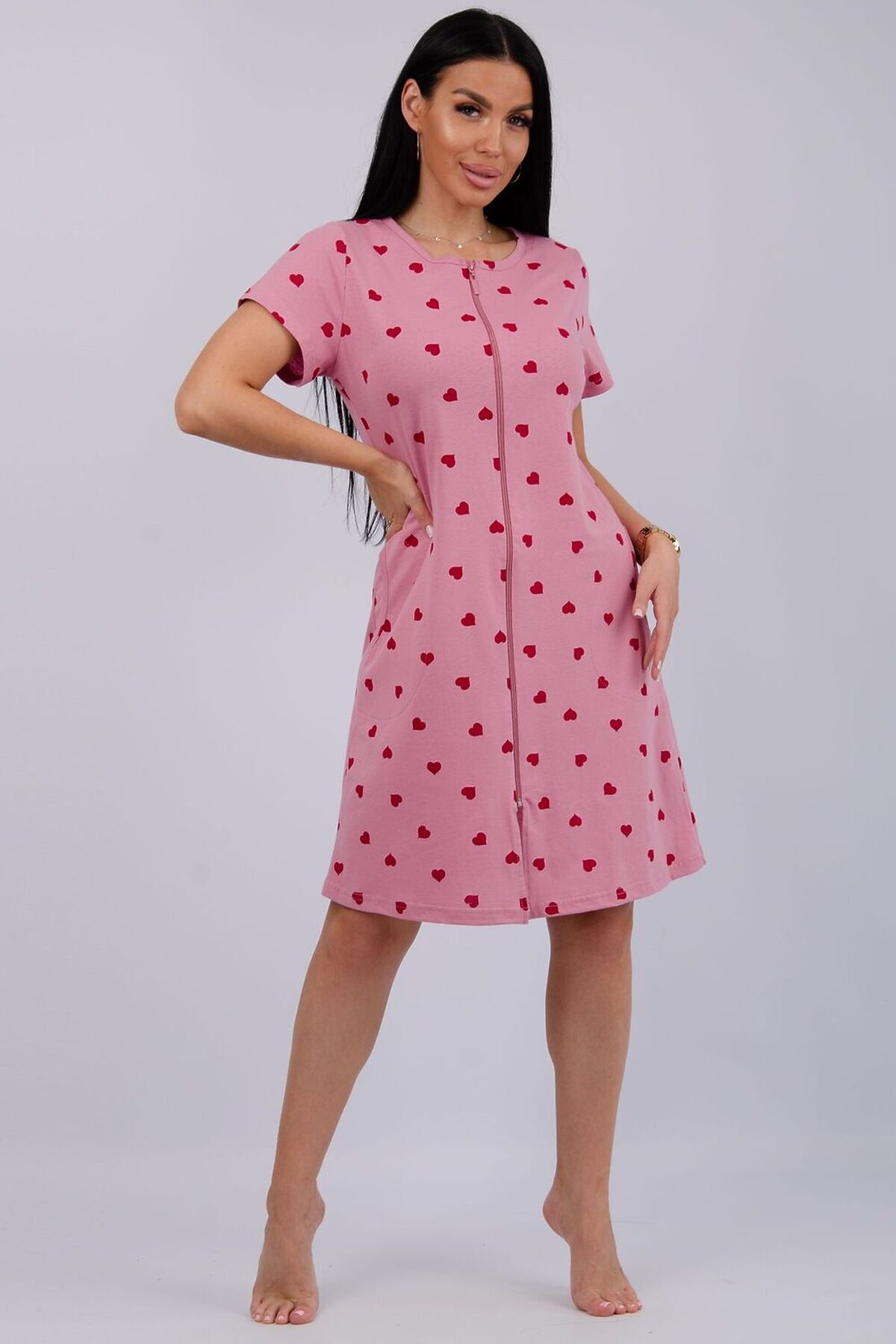 Женский халат на молнии. Рукав короткий. Красивый вырез на полочке. Халат прекрасно подойдет для дома, дачи и отдыха.