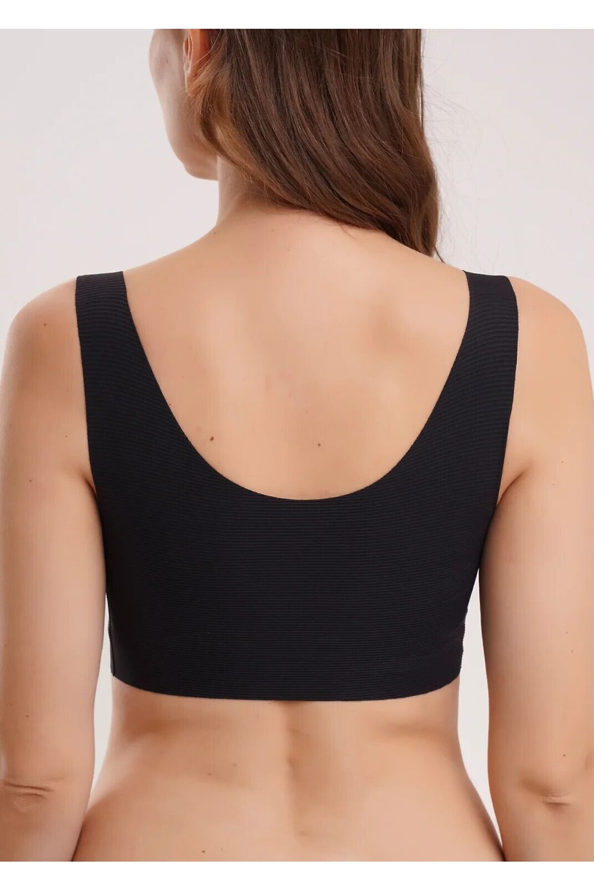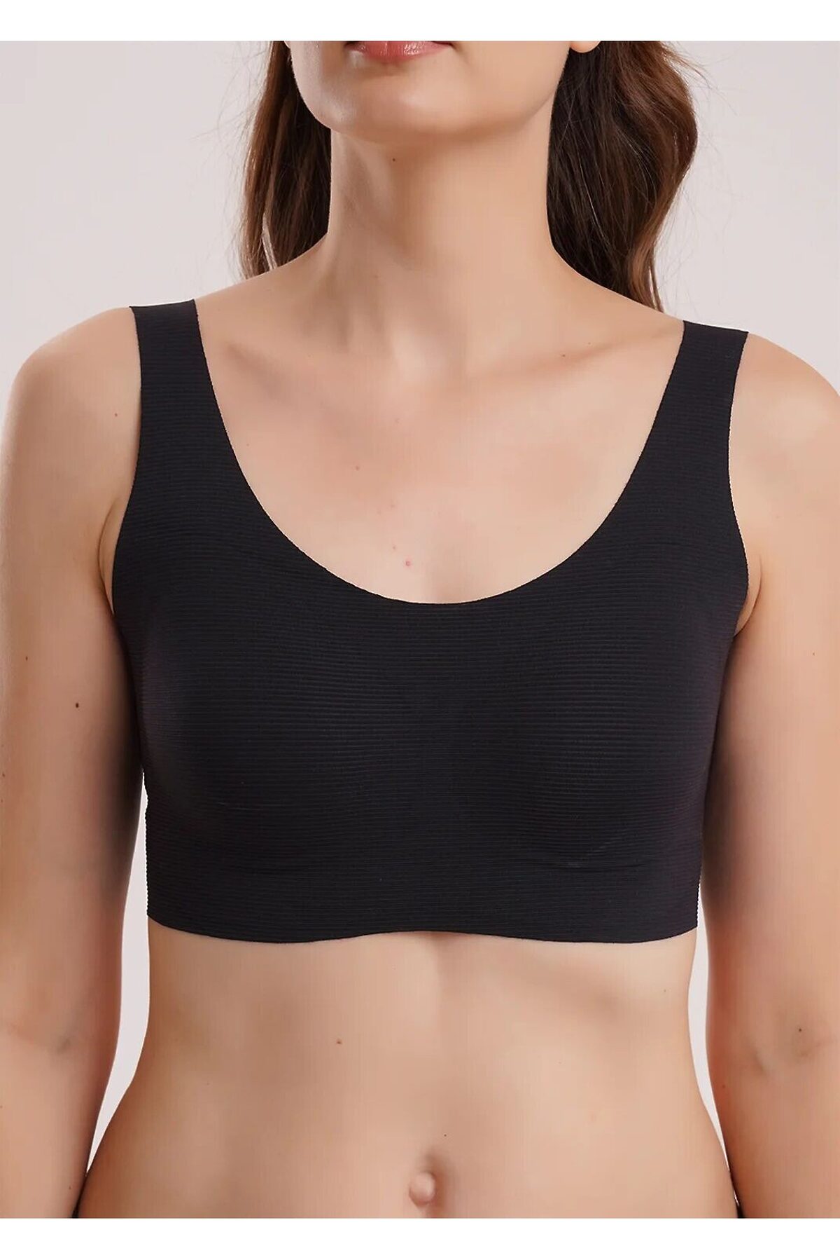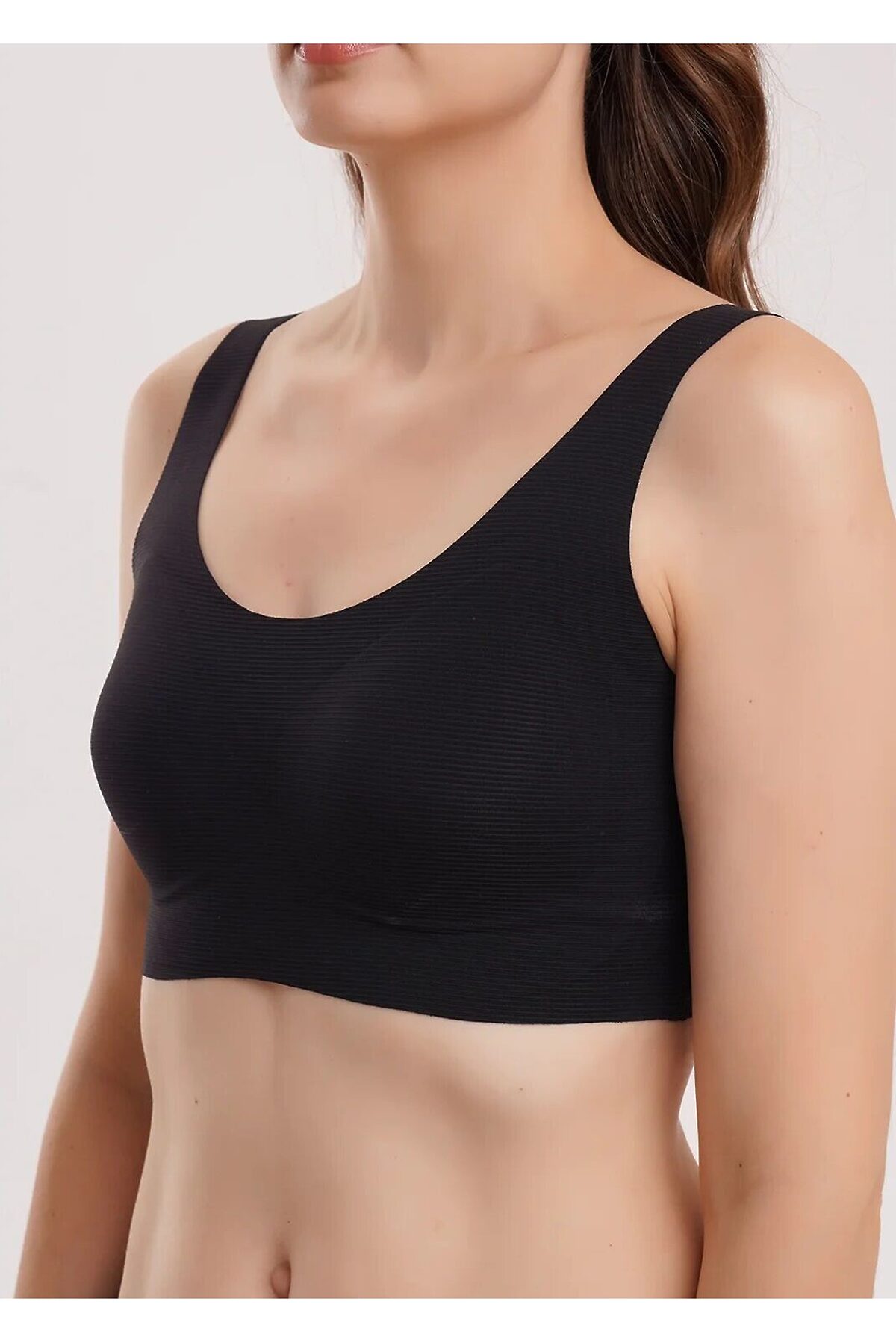 Бюстгальтер спортивный без каркасов выполнен из микрофибры. Тонкие формованные чашки. Бретели регулируемые. Впереди вставки из сетки.
