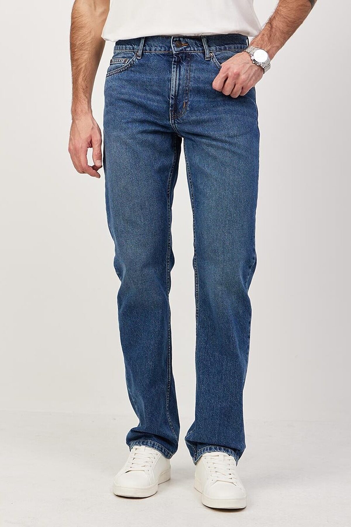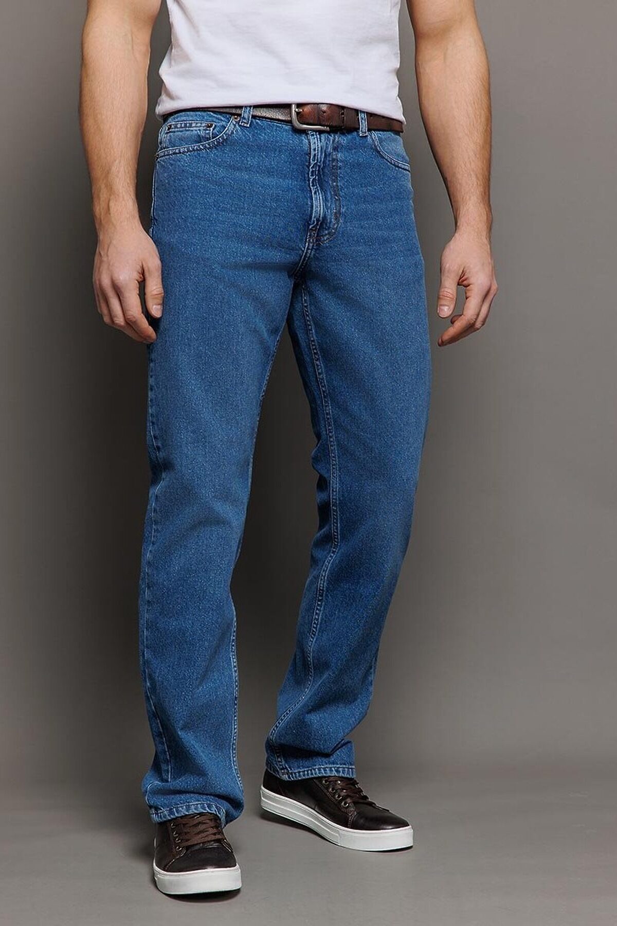 Мужские классические джинсы с пятью карманами. Эта модель выпускактся уже более 25-ти лет и все годы пользуется неизменной популярностью у наших покупателей. Посадка Regular fit (полуоблегающие по бедру), высокая талия, немного заужены к низу. Застежка на молнии. Выполнены из традиционной хлопковой ткани denim. Классическая темная стирка "stone wash".
