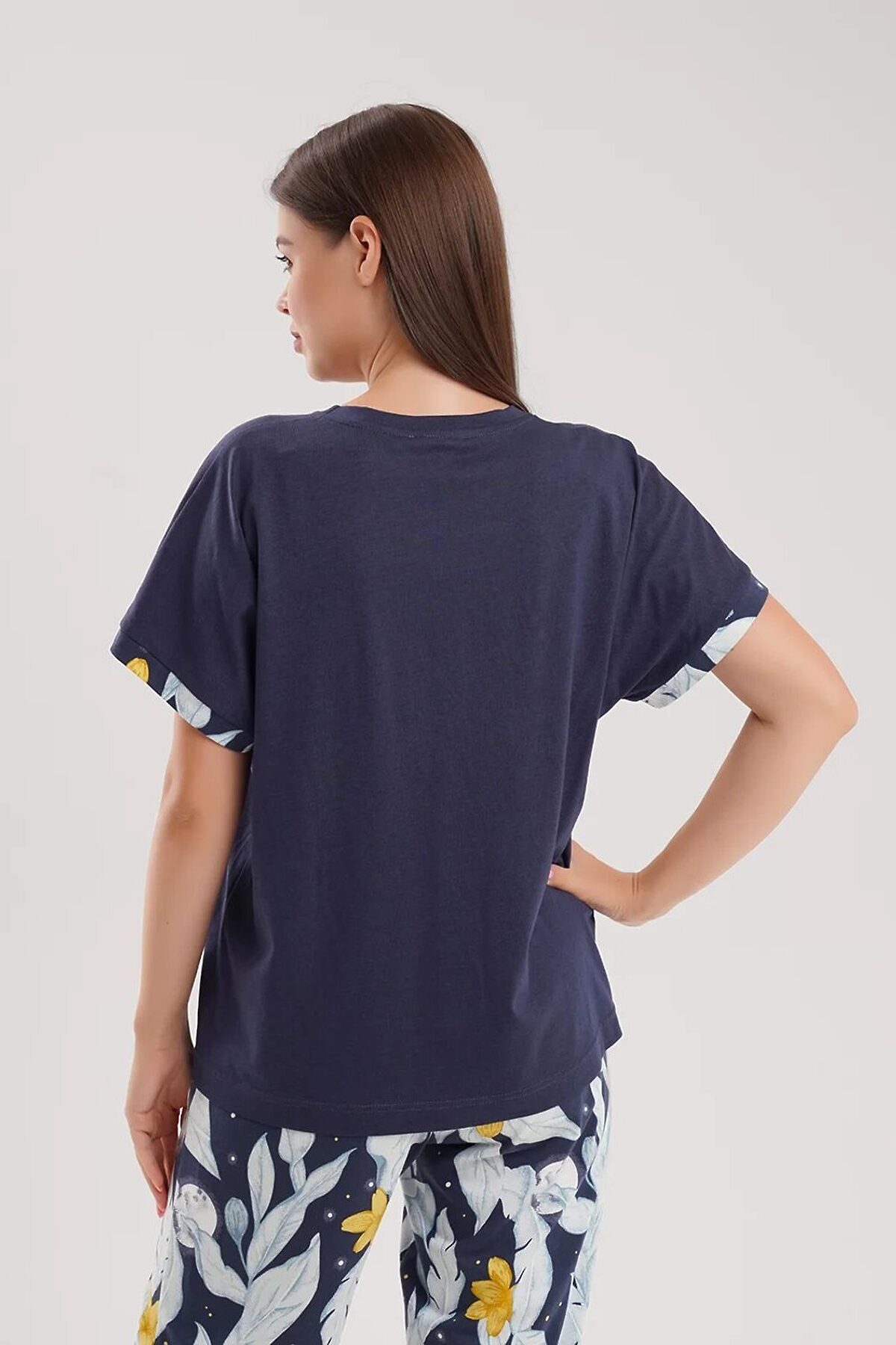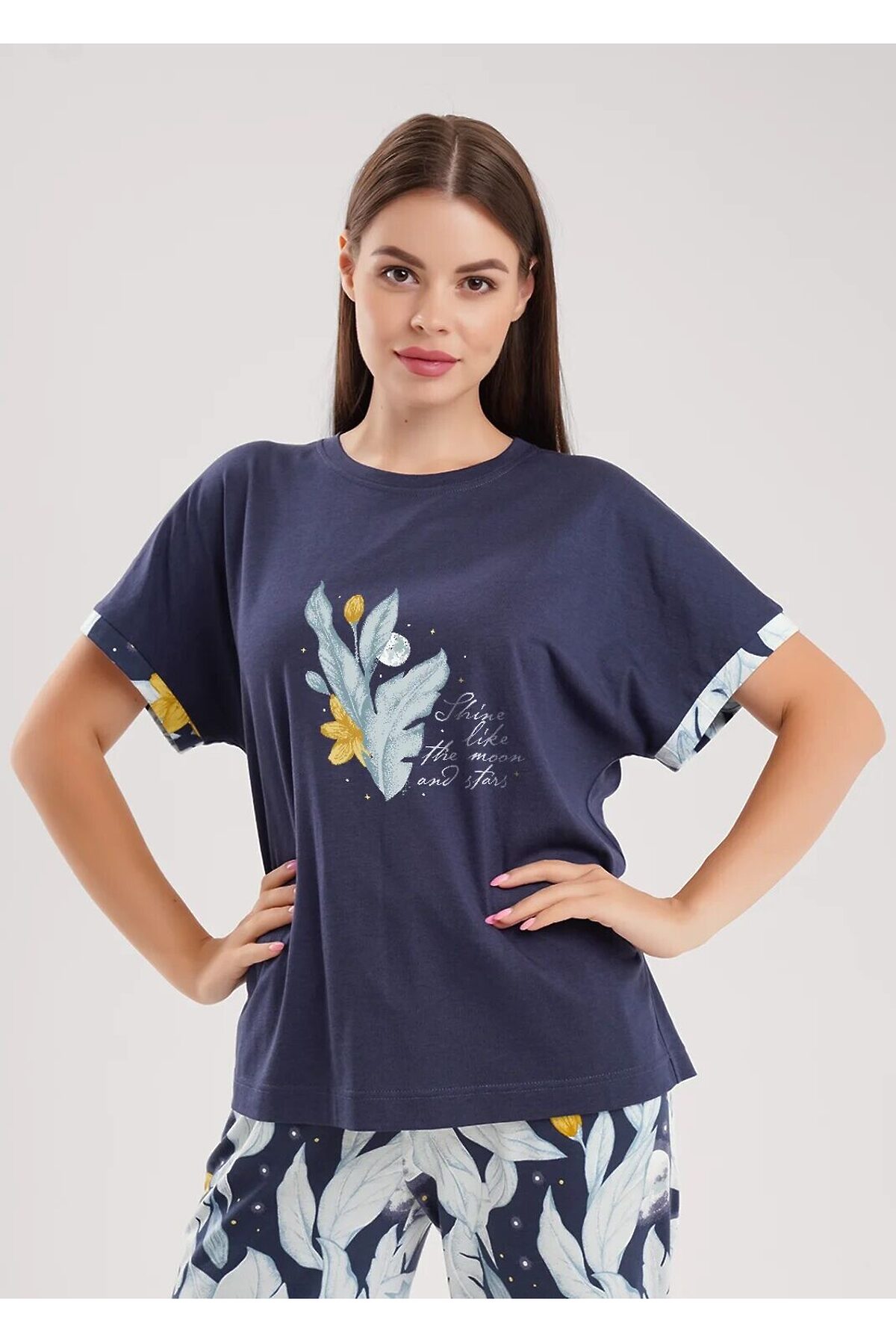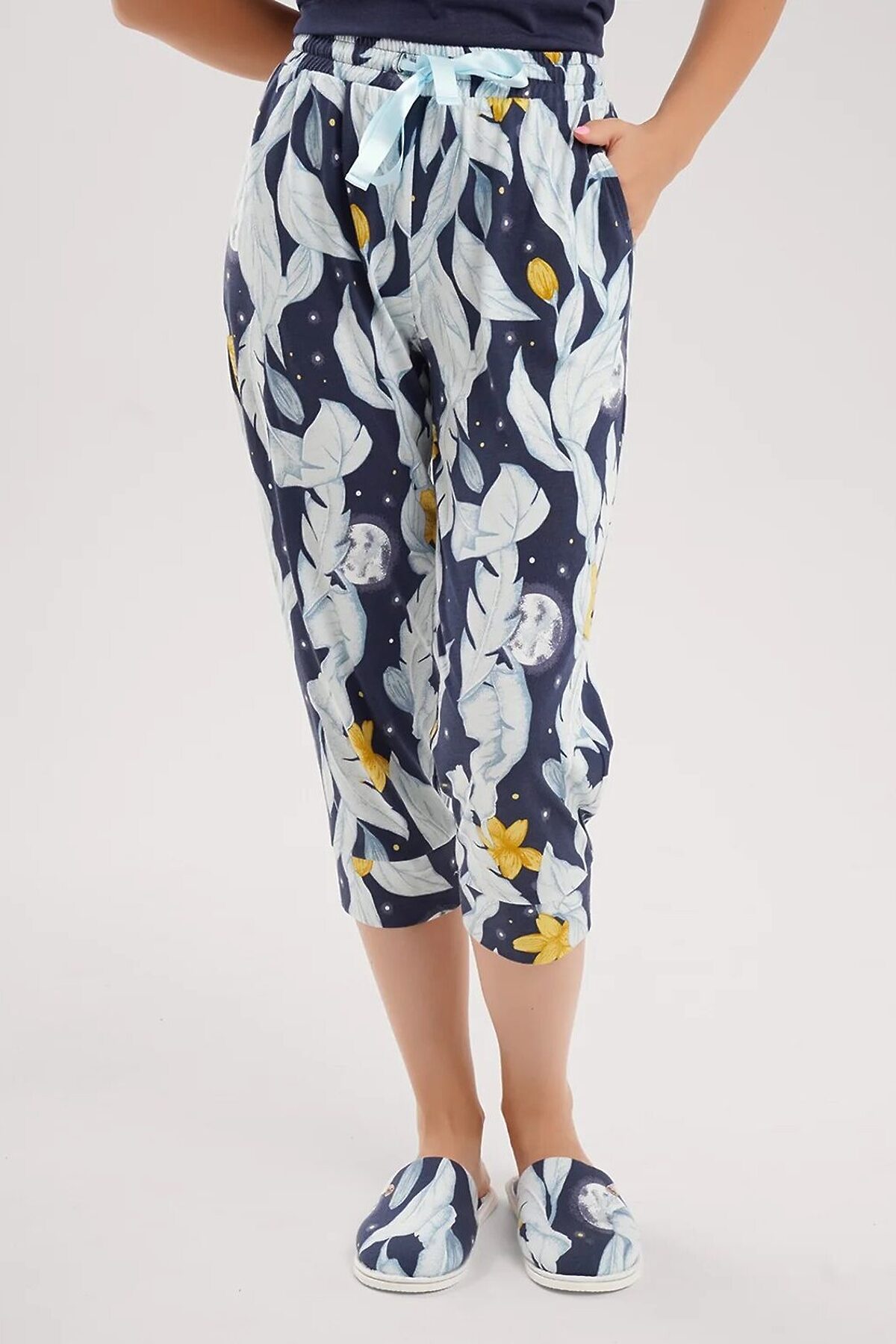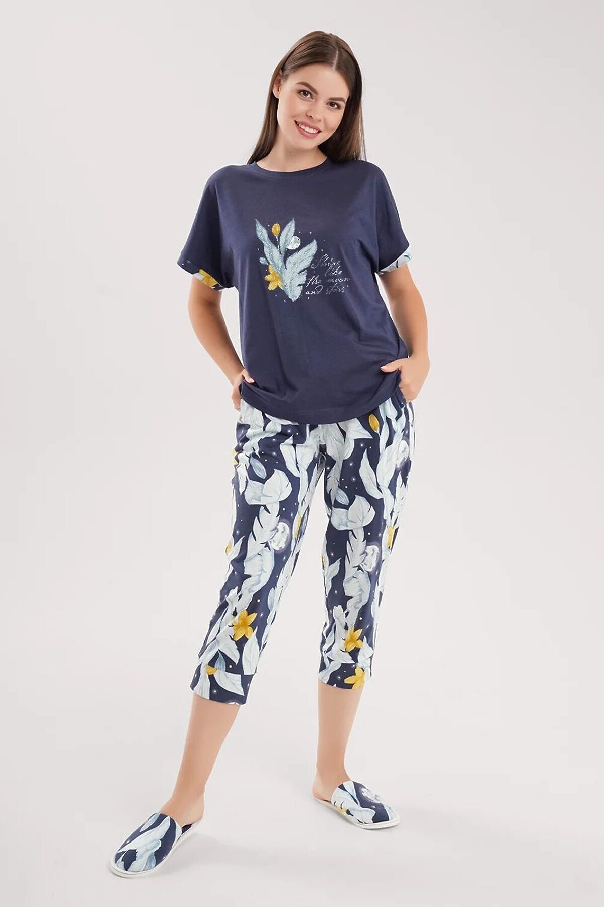 Набор одежды для дома и отдыха из хлопкового трикотажного полотна. Футболка прямого силуэта, короткий втачной рукав. В боковом шве вшивка. Спереди принт. Бриджи по талии пояс на внутренней резинке с атласной лентой. По боковым швам атласный кант.