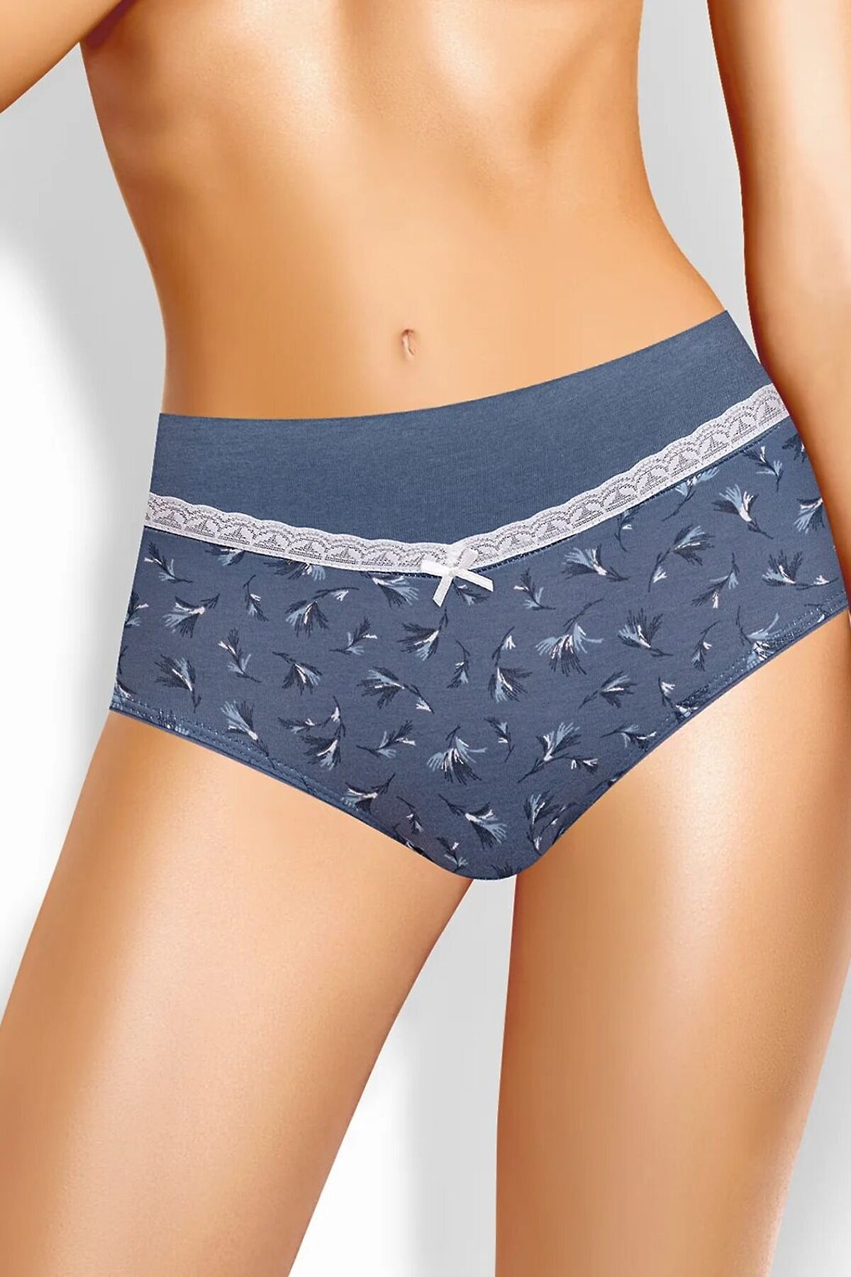 Трусы макси женские из эластичного хлопкового полотна. По переду двойная кокетка из отделочной ткани, в шве кокетки узкое кружево, по центру атласный бант. По талии спинки окантовочная резинка, по ноге - полуокантовка.