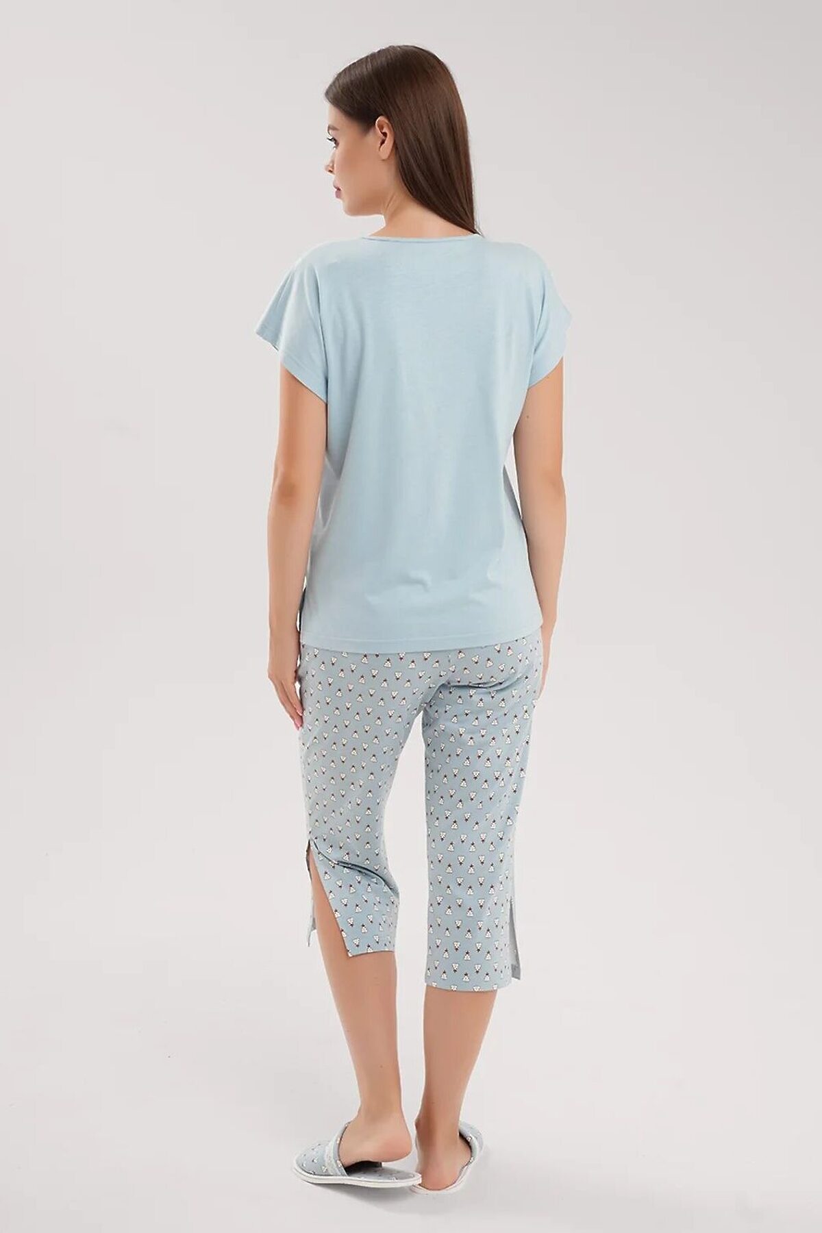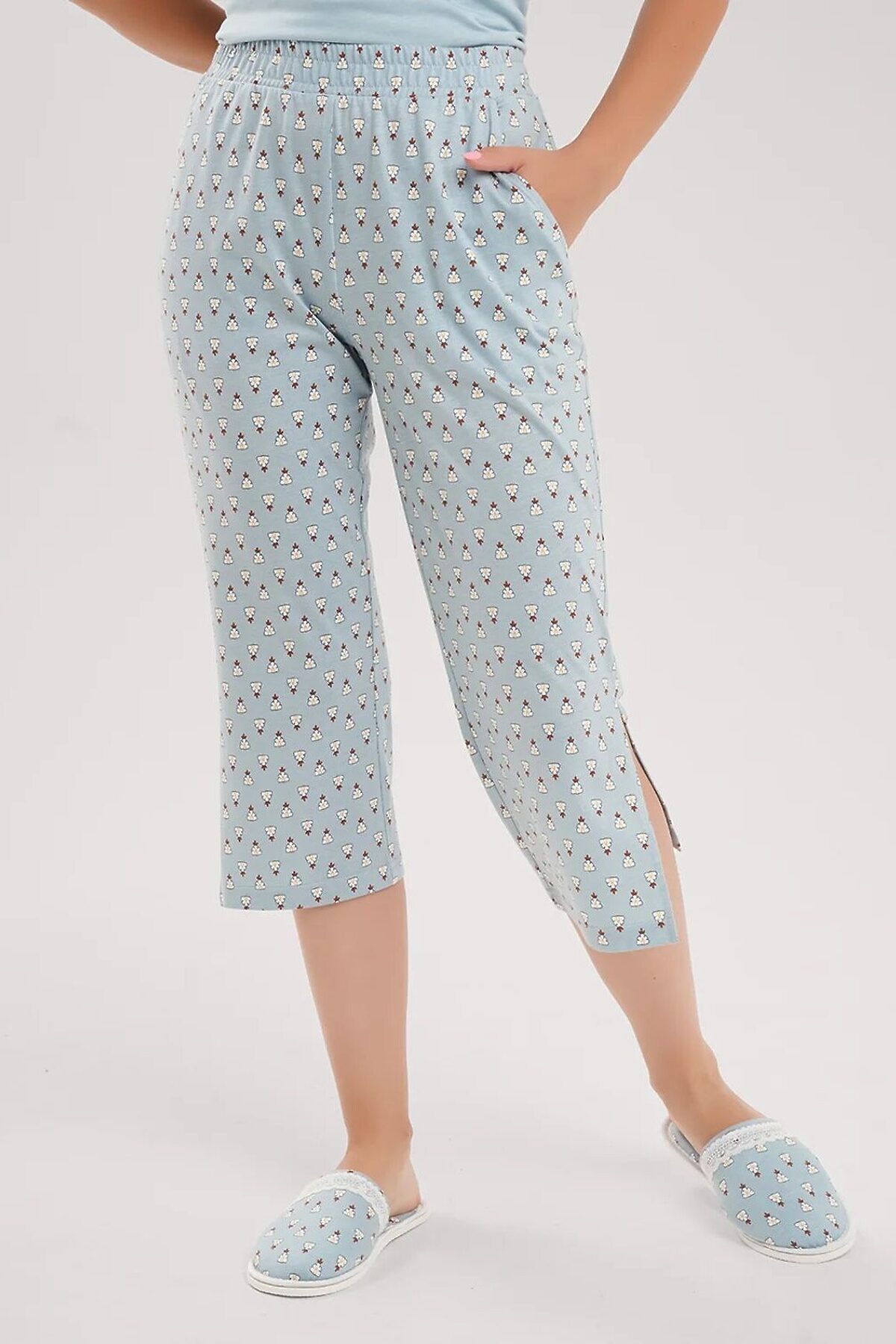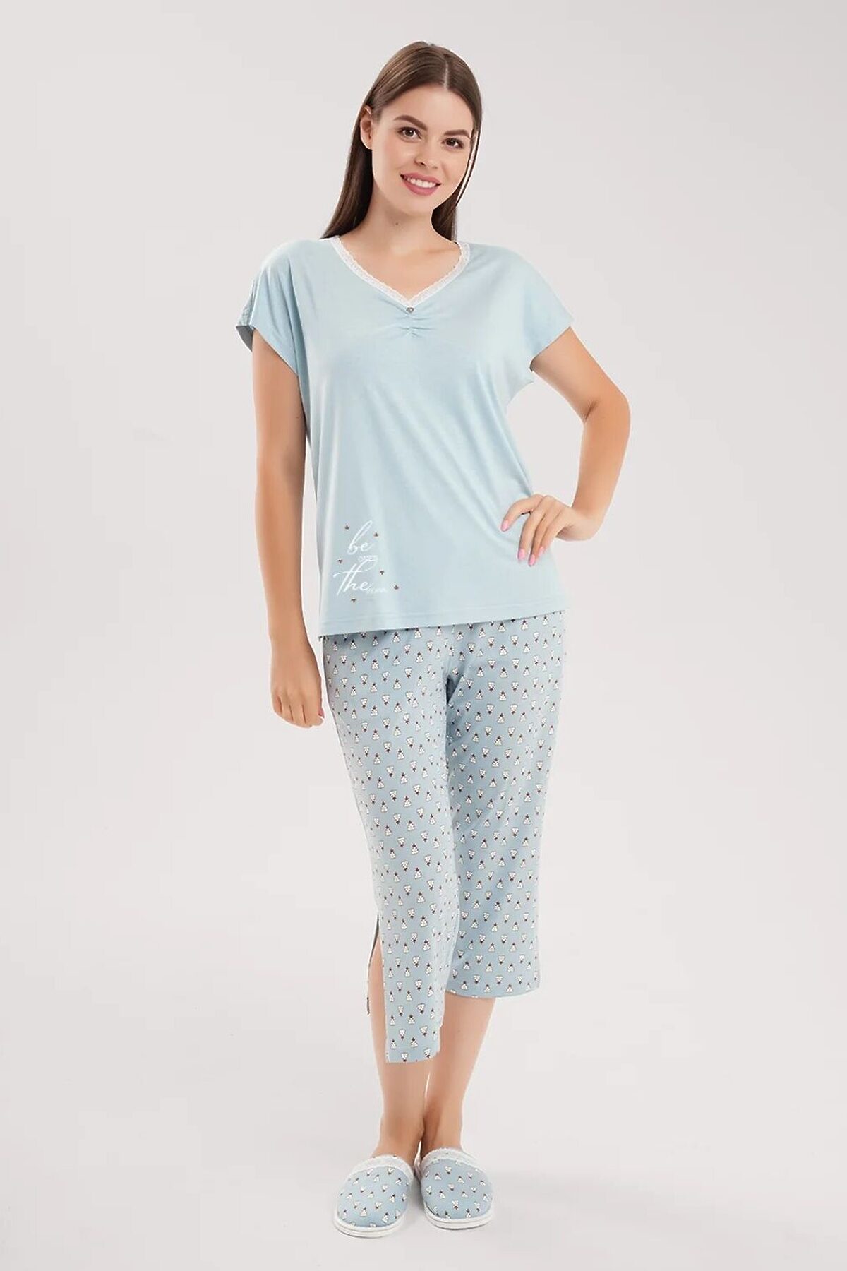 Набор одежды из трикотажного полотна с модалом.Футболка с коротким цельнокроеным рукавом.По горловине переда кружево,по центру сборка на резинку,нашивка. По бокам разрезы,принт. Бриджи с поясом на резинке.Боковые карманы с отрезным бочком.Боковые разрезы