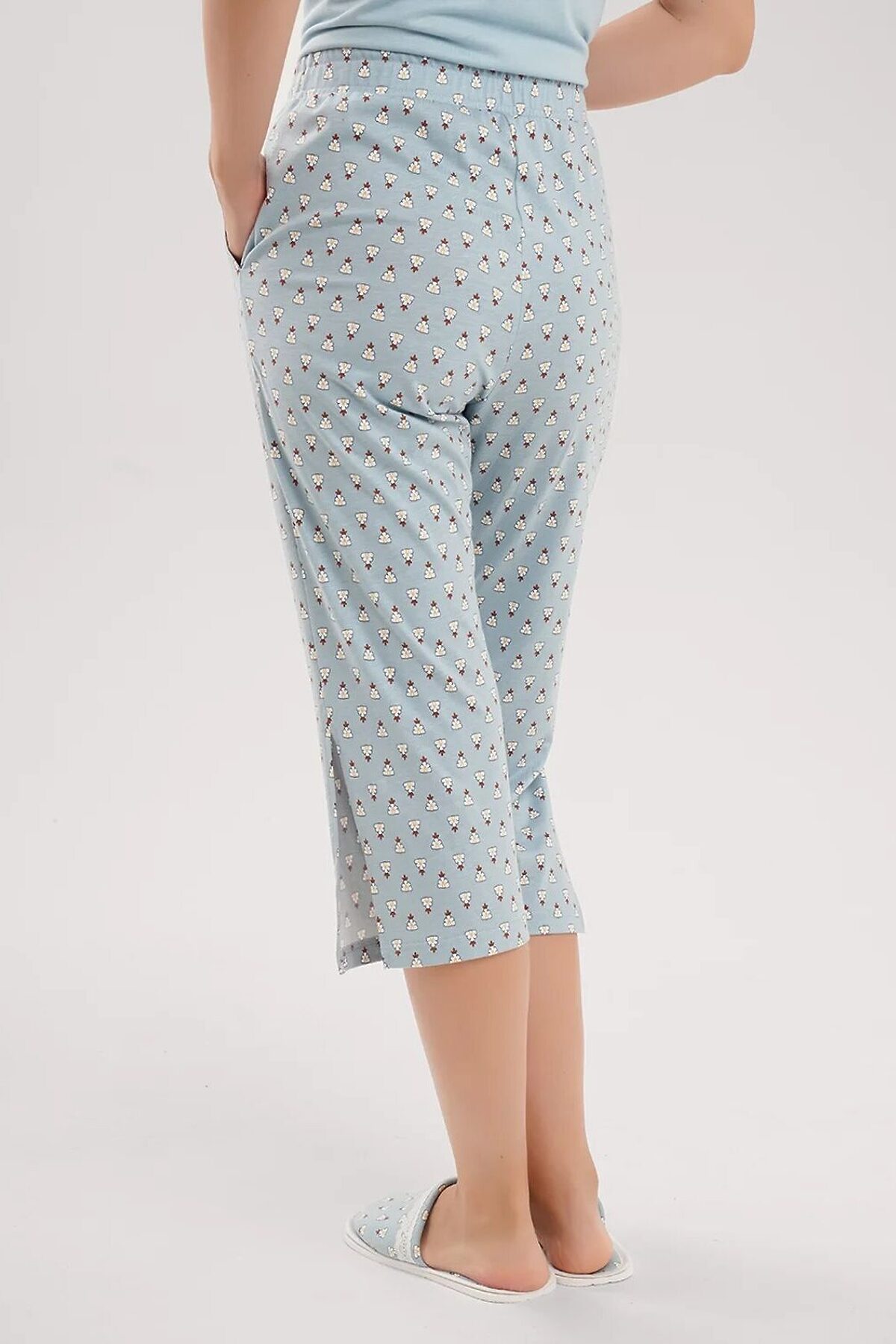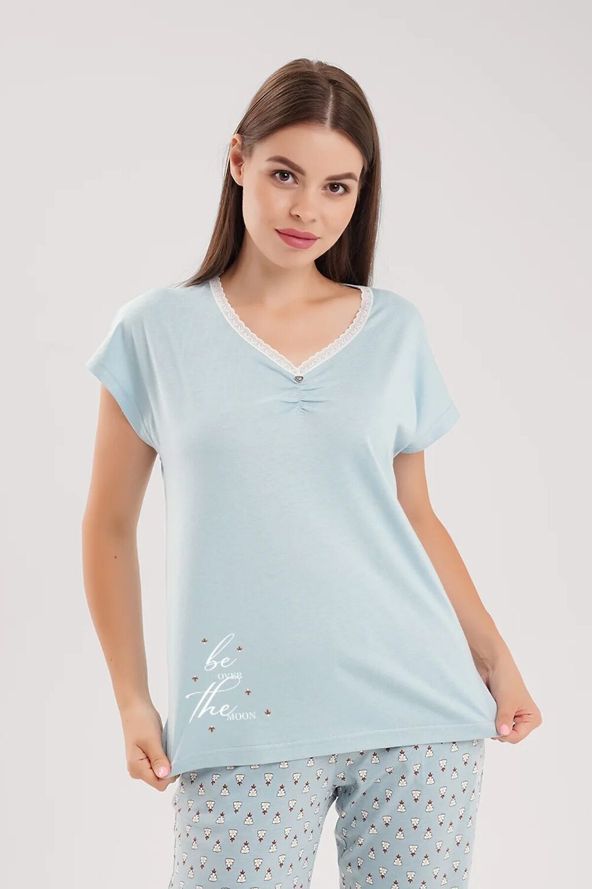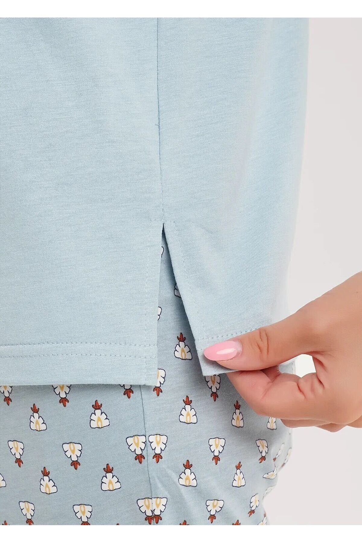 Набор одежды из трикотажного полотна с модалом.Футболка с коротким цельнокроеным рукавом.По горловине переда кружево,по центру сборка на резинку,нашивка. По бокам разрезы,принт. Бриджи с поясом на резинке.Боковые карманы с отрезным бочком.Боковые разрезы