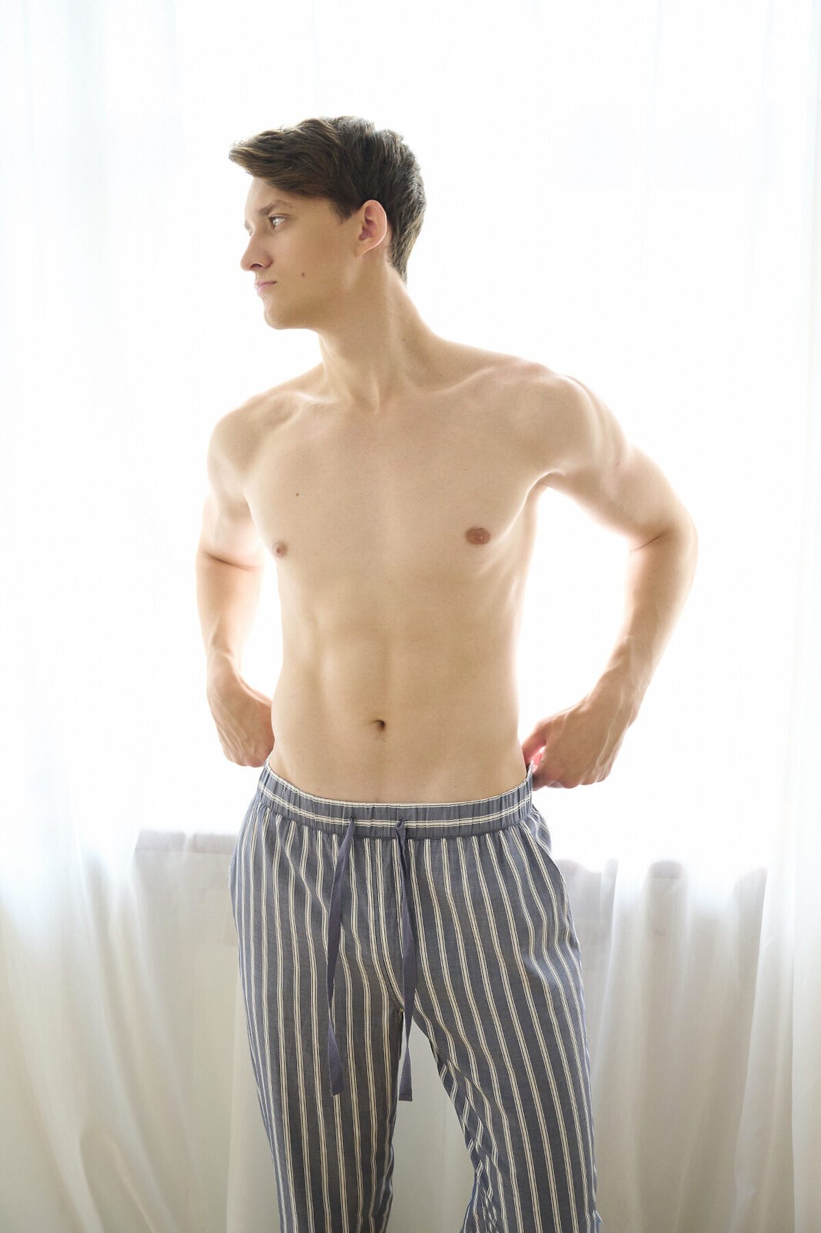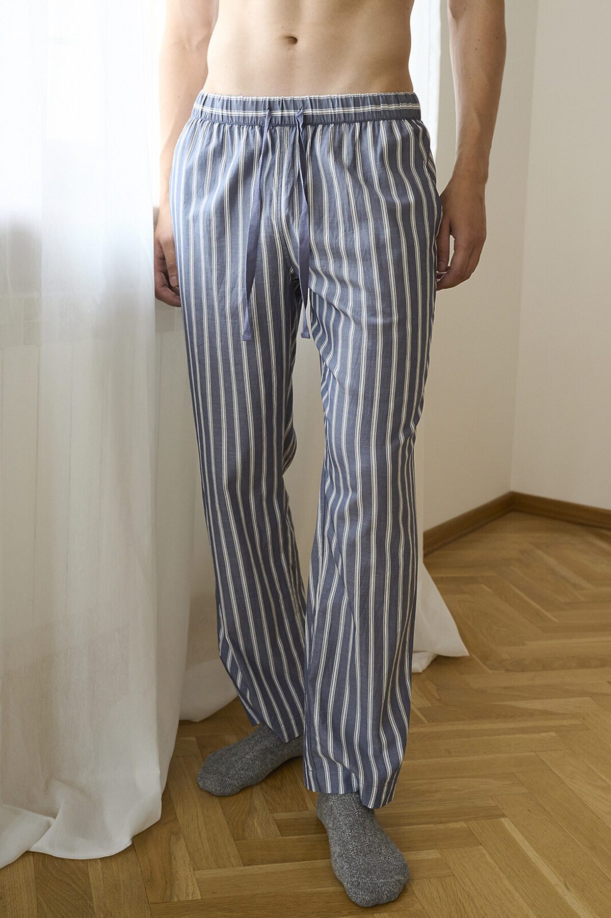 Пижамные брюки 5028PCK бренда Indefini изготовлены из 100% хлопка. Выполнены в сером меланжевом цвете с вертикальным белым полосатым принтом. Брюки прямого кроя с эластичной резинкой на поясе и шнурком для регулировки посадки. На поясе расположен небольшой текстильный ярлык с логотипом бренда.