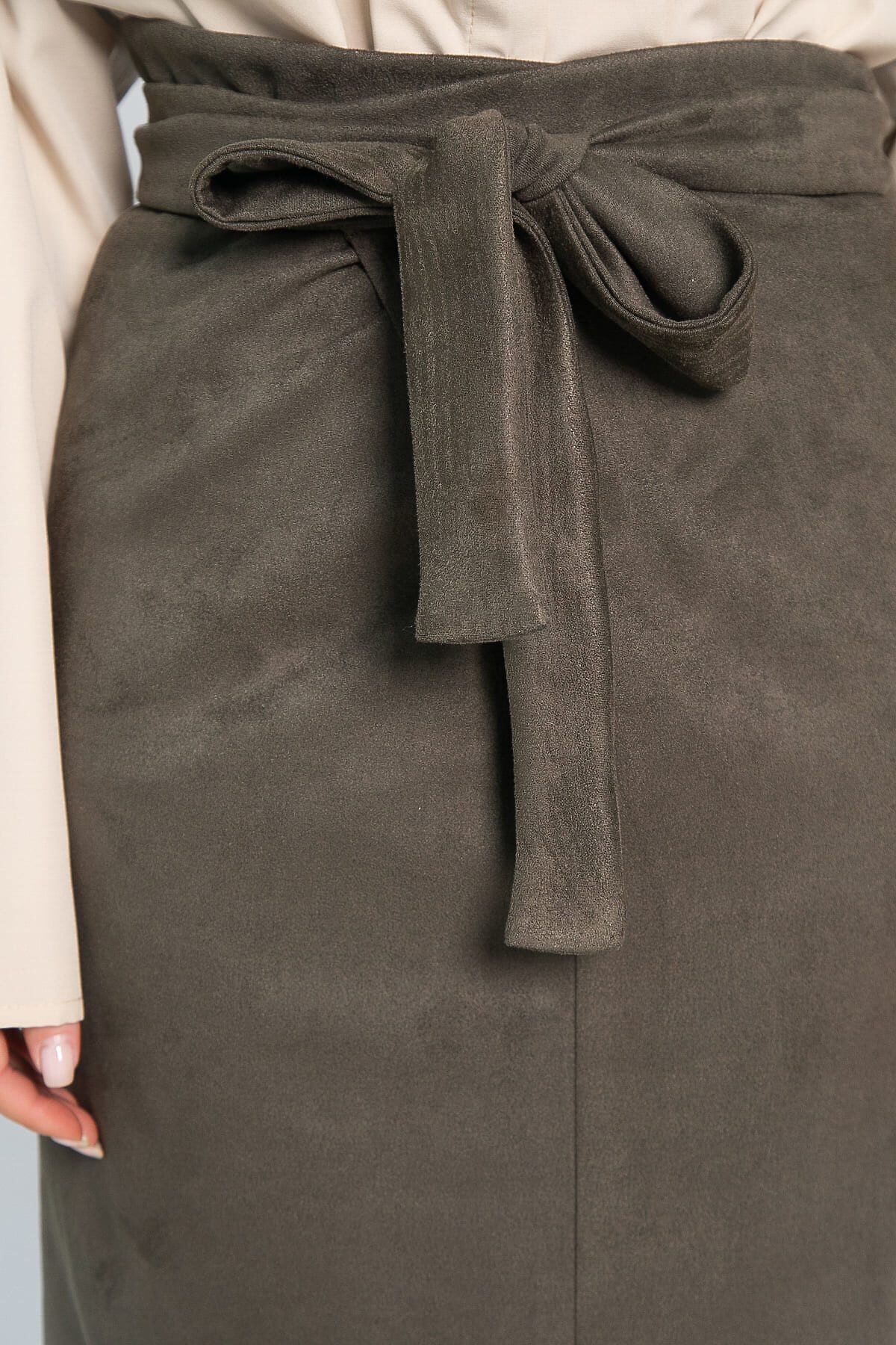 Юбка прямого силуэта длиной миди, выполненная из замши в зеленом цвете. Спереди расположен высокий разрез, добавляющий образу изящества и движения. Верх юбки спереди можно дополнить узлом, завязанным или перекрученным из свободных концов пояса, что создает эффект изящных складок. Эта модель станет отличным выбором для создания стильных и утонченных образов.