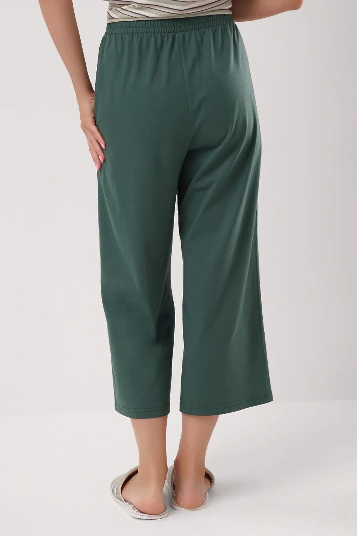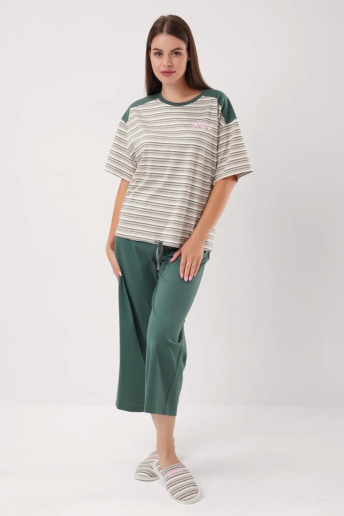 Набор одежды из трикотажного полотна с модалом.Футболка с коротким цельнокроеным рукавом.По горловине переда кружево,по центру сборка на резинку,нашивка. По бокам разрезы,принт. Бриджи с поясом на резинке.Боковые карманы с отрезным бочком.Боковые разрезы